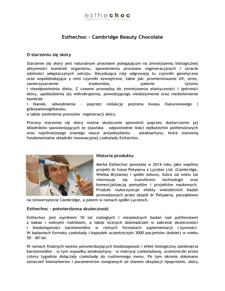Esthechoc – Cambridge Beauty Chocolate O starzeniu się skóry Starzenie się skóry jest naturalnym procesem polegającym na zmniejszeniu biologicznej aktywności komórek organizmu, spowolnieniu procesów regeneracyjnych i utracie zdolności adaptacyjnych ustroju. Decydująca rolę odgrywają tu czynniki genetyczne oraz współdziałające z nimi czynniki zewnętrzne, takie jak: promieniowanie UV, stres, zanieczyszczenie środowiska, palenie tytoniu i nieodpowiednia dieta. Z czasem prowadzą do zmniejszenia elastyczności i jędrności skóry, upośledzenia jej mikrokrążenia, powodującego niedożywienie oraz niedotlenienie komórek i tkanek, odwodnienia - poprzez redukcję poziomu kwasu hialuronowego i glikozaminoglikanów, a także zwolnienia procesów regeneracji skóry. Procesy starzenia się skóry można skutecznie spowolnić poprzez dostarczenie jej składników spowalniających te zjawiska – odpowiednie ilości epikatechin polifenolowych oraz najsilniejszego znanego nauce antyoksydantu – astaksantyny, które stanowią fundamentalne składniki innowacyjnej czekolady Esthechoc. Historia produktu Marka Esthechoc powstała w 2014 roku jako wspólny projekt dr Ivana Petyaeva z Lycotec Ltd. (Cambridge, Wielka Brytania) i spółki Adiuvo, która od wielu lat interesuje się transferem technologii oraz komercjalizacją pomysłów i projektów naukowych. Produkt wykorzystuje efekty wieloletnich badań prowadzonych przez zespół dr Petyaeva, początkowo na Uniwersytecie Cambridge, a potem w ramach spółki Lycotech. Esthechoc - potwierdzona skuteczność Esthechoc jest wynikiem 10 lat rozległych i niezależnych badań nad polifenolami z kakao i wolnymi rodnikami, a także licznych doświadczeń w zakresie skuteczności i biodostępności karotenoidów w różnych formatach suplementacji i żywności. W badaniach formatu czekolady i kapsułek uczestniczyło 3000 pacjentów (kobiet) w wieku 50 – 60 lat. W ramach finalnych testów potwierdzających biodostępność i efekt biologiczny zamknięcia karotenoidów – w tym wypadku astaksantyny – w matrycę czekoladową, uczestniczki przez cztery tygodnie dołączały czekoladę do codziennego menu. Po tym okresie dokonano oznaczeń biomarkerów i paramentrów związanych ze stanem oksydacji lipoprotein, skóry i tkanki podskórnej, a także poziomem saturacji tlenem tkanek. Biomarkery ich skóry powróciły do poziomu charakterystycznego dla ludzi w wieku 20 - 30 lat. Poprawiła się zatem fizjologia skóry. Badania naukowe przeprowadzone przez naukowców z Cambridge dowiodły, że Esthechoc: Chroni skórę od wewnątrz przed procesami starzenia spowodowanego promieniowaniem UV i stresem oksydacyjnym, Poprawia mikrokrążenie skóry i jej natlenienie, Wspomaga procesy detoksykacji skóry, Zapewnia lepsze odżywienie skóry, Pozwala odzyskać skórze jędrność, promienność i blask, Nadaje się do wszystkich rodzajów skóry, Regularnie stosowana pielęgnuje i chroni skórę. Przeciwutleniacze w składzie Esthechoc Flawonole kakao i karotenoid astaksantyna to dwa najpotężniejszych przeciwutleniacze o plejotropowych właściwościach, które znajdują się w składzie Esthechoc. Przeciwutleniacze to w głównej mierze naturalne substancje roślinne, które wspierają mechanizmy obronne komórek. Za co odpowiedzialne są te zawarte w czekoladzie piękności? Epikatechiny polifenolowe • Wzmacniają mikrokrążenie w skórze • Są silnym antyoksydantem • Wspomagają funkcje śródbłonka naczyniowego ale : • Mają niską biodostępność • Dopiero 100 g zwykłej ciemnej czekolady dziennie zapewnia pożądany efekt (bomba kaloryczna!) • Nie zwiększają dotlenienia tkanek • Nie wpływają na procesy zapalne • Tracą właściwości w procesie produkcji i składowania • Producenci nie standaryzują produktów pod kątem obecności polifenolowych ani nie optymalizują ich biodostępności epikatechin Astaksantyna – królowa przeciwutleniaczy • Najsilniejszy znany nauce antyoksydant: • 6 000 razy silniejszy od Witaminy C • 500 razy silniejszy od Witaminy E • Wykazuje działanie przeciwzapalne • Korzystnie wpływa na saturację tlenem tkanek ale: • Przyswajalność spada z wiekiem • Metabolizowana w wątrobie – niewielka część trafia do krwioobiegu • Wykazuje ograniczoną bioefektywność w tkankach • Większość produktów nie jest skutecznych z uwagi na ich wieloskładnikowość • Tabletki i kapsułki są słabiej przyswajalne niż Esthechoc Astacelle – tajemnica niezwykłej efektywności substancji aktywnych Niestety dla stworzenia skutecznej kombinacji dostarczającej do krwi odpowiedni poziom epikatechin polifenolowych oraz astaksantyny, a także uzyskać mierzalny, powtarzalny i potwierdzony efekt biologiczny – nie wystarczyło dodać antyoksydantów do masy czekoladowej. W związku z tym celem prac rozwojowych prowadzonych w Wielkiej Brytanii była optymalizacja formuły czekolady w zakresie absorbcji, biodostępności, retencji w tkankach i skuteczności biologicznej kombinacji epikatechin naturalnie występujących w czekoladzie i astaksantyny dodawanej w procesie produkcji. Opracowano technologie micelizacji Astacelle, czyli formowania miceli z astaksantyny i fosfolipidów z zamkniętymi w środku kryształami epikatechin polifenolowych. Astacelle zwiększa biodostępność substancji aktywnych i w konsekwencji, w tkankach. Unikatowa technologia produkcji optymalizuje proces krystalizacji epikatechin polifenolowych i ich micelizacji przez astaksantynę. Wzmocniona skuteczność astaksantyny i epikatechin polifenolowych, osiągnięta dzięki technologii micelizacji, zapewnia silniejsze działanie niż samej astaksantyny dodanej do czekolady Każda partia produkcyjna jest standaryzowana przez laboratoria Cambridge (Cambridge Chocolate Pass), zapewniając powtarzalny efekt biologiczny. Badania potwierdzają bioefektywność i wykazują poprawę biochemicznych oraz metabolicznych 