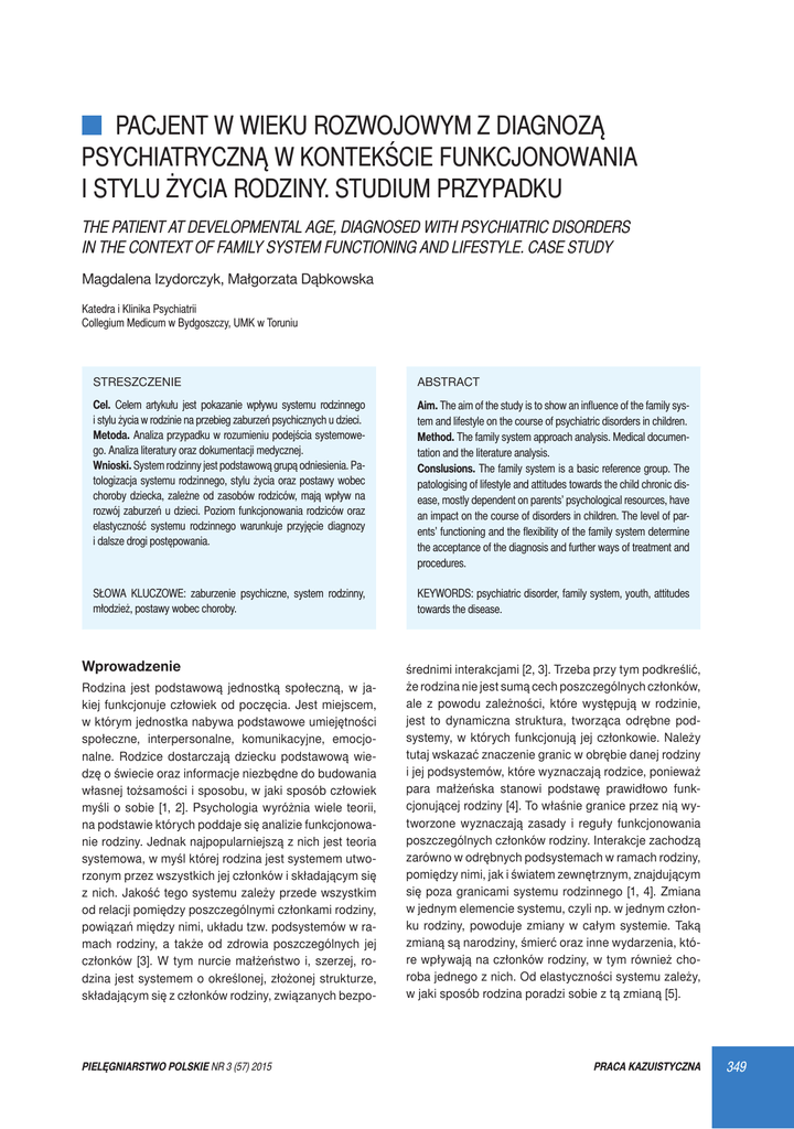 PACJENT W WIEKU ROZWOJOWYM Z DIAGNOZĄ PSYCHIATRYCZNĄ W KONTEKŚCIE FUNKCJONOWANIA I STYLU ŻYCIA RODZINY. STUDIUM PRZYPADKU THE PATIENT AT DEVELOPMENTAL AGE, DIAGNOSED WITH PSYCHIATRIC DISORDERS IN THE CONTEXT OF FAMILY SYSTEM FUNCTIONING AND LIFESTYLE. CASE STUDY Magdalena Izydorczyk, Małgorzata Dąbkowska Katedra i Klinika Psychiatrii Collegium Medicum w Bydgoszczy, UMK w Toruniu STRESZCZENIE ABSTRACT Cel. Celem artykułu jest pokazanie wpływu systemu rodzinnego i stylu życia w rodzinie na przebieg zaburzeń psychicznych u dzieci. Metoda. Analiza przypadku w rozumieniu podejścia systemowego. Analiza literatury oraz dokumentacji medycznej. Wnioski. System rodzinny jest podstawową grupą odniesienia. Patologizacja systemu rodzinnego, stylu życia oraz postawy wobec choroby dziecka, zależne od zasobów rodziców, mają wpływ na rozwój zaburzeń u dzieci. Poziom funkcjonowania rodziców oraz elastyczność systemu rodzinnego warunkuje przyjęcie diagnozy i dalsze drogi postępowania. Aim. The aim of the study is to show an influence of the family system and lifestyle on the course of psychiatric disorders in children. Method. The family system approach analysis. Medical documentation and the literature analysis. Conslusions. The family system is a basic reference group. The patologising of lifestyle and attitudes towards the child chronic disease, mostly dependent on parents’ psychological resources, have an impact on the course of disorders in children. The level of parents’ functioning and the flexibility of the family system determine the acceptance of the diagnosis and further ways of treatment and procedures. SŁOWA KLUCZOWE: zaburzenie psychiczne, system rodzinny, młodzież, postawy wobec choroby. KEYWORDS: psychiatric disorder, family system, youth, attitudes towards the disease. Wprowadzenie Rodzina jest podstawową jednostką społeczną, w jakiej funkcjonuje człowiek od poczęcia. Jest miejscem, w którym jednostka nabywa podstawowe umiejętności społeczne, interpersonalne, komunikacyjne, emocjonalne. Rodzice dostarczają dziecku podstawową wiedzę o świecie oraz informacje niezbędne do budowania własnej tożsamości i sposobu, w jaki sposób człowiek myśli o sobie [1, 2]. Psychologia wyróżnia wiele teorii, na podstawie których poddaje się analizie funkcjonowanie rodziny. Jednak najpopularniejszą z nich jest teoria systemowa, w myśl której rodzina jest systemem utworzonym przez wszystkich jej członków i składającym się z nich. Jakość tego systemu zależy przede wszystkim od relacji pomiędzy poszczególnymi członkami rodziny, powiązań między nimi, układu tzw. podsystemów w ramach rodziny, a także od zdrowia poszczególnych jej członków [3]. W tym nurcie małżeństwo i, szerzej, rodzina jest systemem o określonej, złożonej strukturze, składającym się z członków rodziny, związanych bezpo- PIELĘGNIARSTWO POLSKIE NR 3 (57) 2015 średnimi interakcjami [2, 3]. Trzeba przy tym podkreślić, że rodzina nie jest sumą cech poszczególnych członków, ale z powodu zależności, które występują w rodzinie, jest to dynamiczna struktura, tworząca odrębne podsystemy, w których funkcjonują jej członkowie. Należy tutaj wskazać znaczenie granic w obrębie danej rodziny i jej podsystemów, które wyznaczają rodzice, ponieważ para małżeńska stanowi podstawę prawidłowo funkcjonującej rodziny [4]. To właśnie granice przez nią wytworzone wyznaczają zasady i reguły funkcjonowania poszczególnych członków rodziny. Interakcje zachodzą zarówno w odrębnych podsystemach w ramach rodziny, pomiędzy nimi, jak i światem zewnętrznym, znajdującym się poza granicami systemu rodzinnego [1, 4]. Zmiana w jednym elemencie systemu, czyli np. w jednym członku rodziny, powoduje zmiany w całym systemie. Taką zmianą są narodziny, śmierć oraz inne wydarzenia, które wpływają na członków rodziny, w tym również choroba jednego z nich. Od elastyczności systemu zależy, w jaki sposób rodzina poradzi sobie z tą zmianą [5]. PRACA KAZUISTYCZNA 349 Z uwagi na cechy systemu rodzinnego badacze wyróżniają poszczególne postawy i sposoby postępowania w sytuacji wystąpienia u dziecka choroby przewlekłej. Można wyróżnić postawy właściwe, jak: akceptacja, współdziałanie, dostosowana swoboda, respektowanie praw oraz woli dziecka. Do negatywnych należy postawa nadmiernie chroniąca, nadmiernie wymagająca, unikająca, obojętna lub wręcz odrzucająca [6–8]. Zaangażowanie, liczne wyrzeczenia, poświęcenie osób, które zajmują się chorym, np. dzieckiem, może powodować poczucie, że wszystko robi się niewłaściwie, a ze sprawowanej opieki nie płyną wzmocnienia pozytywne, co może skutkować przeciążeniem emocjonalnym i fizycznym, podobnym do tego, które jest związane z pracą zawodową. Osoba wypalona z początku może doznawać bólów różnego pochodzenia, często o podłożu psychicznym, bezsenności, drażliwości. W kolejnej fazie może próbować zdystansować się od problemów związanych z chorobą dziecka, co często prowadzi do depersonalizacji. Natomiast w fazie terminalnej wypalenia chorobą członka rodziny opiekunowie/rodzice mogą próbować odciąć się emocjonalnie od dziecka, w wyniku czego dochodzi nawet do zaniedbania chorego. Równocześnie wzmagają się objawy somatyczne rodziców, kłótliwość, impulsywność, a także agresja. Pojawiają się również coraz bardziej nasilone postawy negatywne wobec osoby chorej. Opiekunowie są mniej empatyczni, a także wrogo nastawieni [3]. Szczególnie trudną chorobą, z jaką musi zmagać się rodzina, jest choroba psychiczna jednego z jej członków. Do dziś zdecydowanie różni się przeżywanie w rodzinie choroby psychicznej od przeżywania choroby somatycznej. Choroba psychiczna jest odbierana jako bardziej nieprzewidywalna, nieznana, nierzadko budzi lęk, niechęć oraz agresję środowiska, w którym żyje osoba chora [9]. Chor