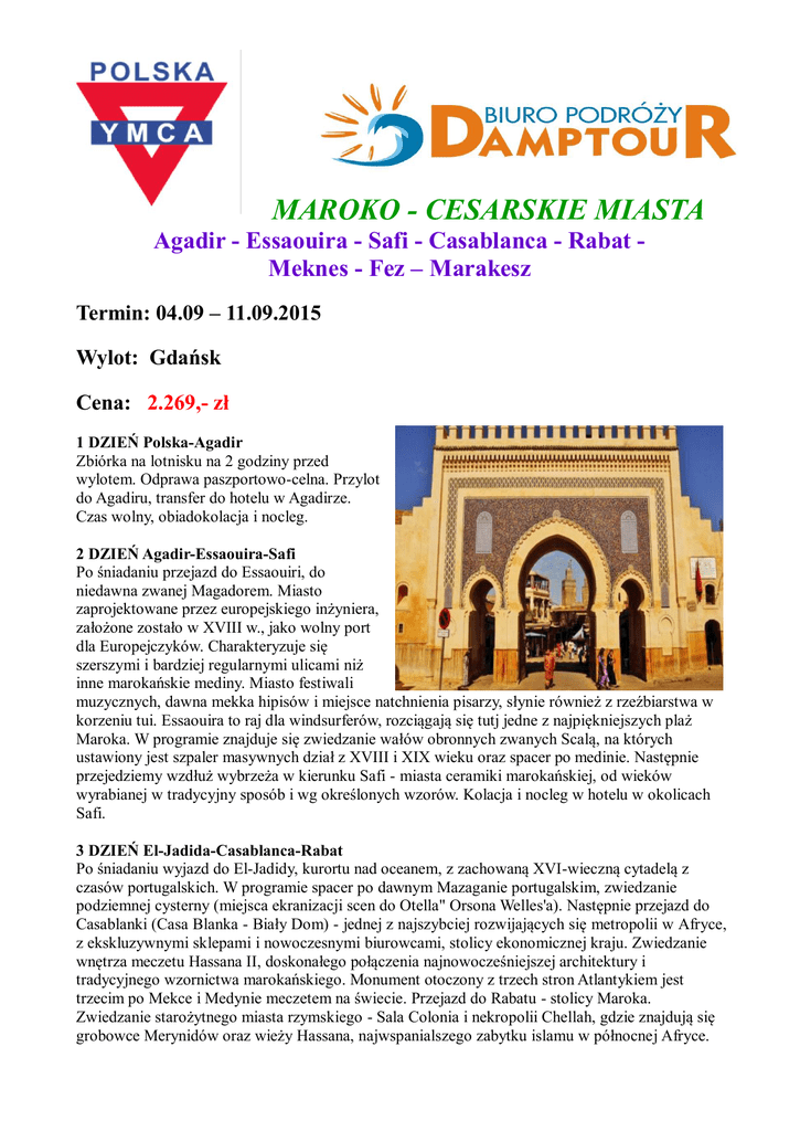 MAROKO - CESARSKIE MIASTA Agadir - Essaouira - Safi - Casablanca - Rabat Meknes - Fez – Marakesz Termin: 04.09 – 11.09.2015 Wylot: Gdańsk Cena: 2.269,- zł 1 DZIEŃ Polska-Agadir Zbiórka na lotnisku na 2 godziny przed wylotem. Odprawa paszportowo-celna. Przylot do Agadiru, transfer do hotelu w Agadirze. Czas wolny, obiadokolacja i nocleg. 2 DZIEŃ Agadir-Essaouira-Safi Po śniadaniu przejazd do Essaouiri, do niedawna zwanej Magadorem. Miasto zaprojektowane przez europejskiego inżyniera, założone zostało w XVIII w., jako wolny port dla Europejczyków. Charakteryzuje się szerszymi i bardziej regularnymi ulicami niż inne marokańskie mediny. Miasto festiwali muzycznych, dawna mekka hipisów i miejsce natchnienia pisarzy, słynie również z rzeźbiarstwa w korzeniu tui. Essaouira to raj dla windsurferów, rozciągają się tutj jedne z najpiękniejszych plaż Maroka. W programie znajduje się zwiedzanie wałów obronnych zwanych Scalą, na których ustawiony jest szpaler masywnych dział z XVIII i XIX wieku oraz spacer po medinie. Następnie przejedziemy wzdłuż wybrzeża w kierunku Safi - miasta ceramiki marokańskiej, od wieków wyrabianej w tradycyjny sposób i wg określonych wzorów. Kolacja i nocleg w hotelu w okolicach Safi. 3 DZIEŃ El-Jadida-Casablanca-Rabat Po śniadaniu wyjazd do El-Jadidy, kurortu nad oceanem, z zachowaną XVI-wieczną cytadelą z czasów portugalskich. W programie spacer po dawnym Mazaganie portugalskim, zwiedzanie podziemnej cysterny (miejsca ekranizacji scen do Otella" Orsona Welles'a). Następnie przejazd do Casablanki (Casa Blanka - Biały Dom) - jednej z najszybciej rozwijających się metropolii w Afryce, z ekskluzywnymi sklepami i nowoczesnymi biurowcami, stolicy ekonomicznej kraju. Zwiedzanie wnętrza meczetu Hassana II, doskonałego połączenia najnowocześniejszej architektury i tradycyjnego wzornictwa marokańskiego. Monument otoczony z trzech stron Atlantykiem jest trzecim po Mekce i Medynie meczetem na świecie. Przejazd do Rabatu - stolicy Maroka. Zwiedzanie starożytnego miasta rzymskiego - Sala Colonia i nekropolii Chellah, gdzie znajdują się grobowce Merynidów oraz wieży Hassana, najwspanialszego zabytku islamu w północnej Afryce. Kolacja i nocleg w Rabacie, lub w okolicach Rabatu. 4 DZIEŃ Meknes-Fez Po śniadaniu przejazd do Meknes, stolicy legendarnego sułtana Mulaja Ismaila, najbardziej ufortyfikowanego miasta w Maroku. Zwiedzanie dzielnicy królewskiej z największym w kraju basenem, spichlerzami i stajniami, a także mauzoleum, gdzie został pochowany okrutny sułtan. Następnie zwiedzanie rzymskiego miasta Volubilis, stolicy dawnej prowincji Mauretania Tringitana. Odnaleziono tu ślady osadnictwa neolitycznego, jednak okres prosperity miasta przypada na panowanie Rzymian w okresie od I do III w n.e. Jest ono również uważane za stolicę berberyjskiego królestwa Mauretanii. O nieodkrytym do końca bogactwie i historii miasta świadczą trwające tu do dzis prace wykopaliskowe, finansowane przez rząd marokański. Powrót do hotelu w okolicach Fezu. Po kolacji dla chętnych możliwość wyjazdu na wieczór marokański, gdzie tancerze i tancerki zaprezentują folklor z okolic Fezu m.in. tańce berberyskie i taniec brzucha. 5 DZIEŃ Fez Po śniadaniu zwiedzanie Fezu - najstarszego miasta arabskiego, religijnej i duchowej stolicy Maroka, znanego ze Światowego Festiwalu Muzyki Sakralnej. W programie zwiedzania pałac królewski (z zewnątrz), dzielnica żydowska - mellah, medresa - szkoła koraniczna, najstarszy w świecie nowożytnym uniwersytet i meczet Al Karawijjin oraz mauzoleum założyciela miasta Idryssa II (z zewnątrz), fontanna Nejjarinne, warsztaty rzemiosła marokańskiego (m.in. jeden z zakładów ceramiki, gdzie powstają mozaiki zelliż i wyrafinowana ceramika użytkowa oraz najstarsze w kraju garbarnie i farbiarnie skór, gdzie zapoznamy się z tradycyjną metodą ich oprawiania). Możliwość zakupienia unikalnych, oryginalnych wyrobów. Po południu czas wolny i kolacja. 6 DZIEŃ Marrakesz Śniadanie, podróż przez region Atlasu Średniego w stronę Czerwonego Miasta - Marrakeszu. Pasmo gór Atlasu Średniego, rozciągające się między Atlasem Wysokim, a Rifem, to krajobraz bogaty w wyżynne pastwiska, ukryte rzeki i jeziora, miejsce życia rdzennych mieszkańców Maroka - Berberów. Malownicza trasa biegnie przez porosłe lasami cedrowymi wzgórza oraz uprawne pola. Bogaty w kolory i zmienny krajobraz Atlasu Średniego jest inspiracją dla wzorów ręcznie tkanych kilimów i dywanów berberyjskich. Na trasie przewidziana jest przerwa. Kolacja i nocleg w okolicach Marrakeszu. Uwaga - w przypadku intensywnego deszczu oraz w okresie ramadanu przejazd z Fezu do Marakeszu realizowany będzie autostradą. 7 DZIEŃ Marrakesz O poranku lub po południu możliwość skorzystania z wycieczki do Doliny Ouriki (ok. 24 EUR). Wycieczka ma charakter poznawczo - krajobrazowy. Przejazd wijącymi się serpentynami wśród gór Atlasu Wysokiego. Podczas licznych postojów będzie możliwość sfotografowania pięknych krajobrazów, wzgórz porośniętych zielonymi lasami, na zboczach, których znajdują się niewielkie wioski, a w tle rysują się jego ośnieżone szczyty. Na szlaku wiosek berberyjskich można przyjrzeć się życiu mieszkańców regionu. W programie wycieczki wizyta w jednym z domów berberyjskich połączona z rytuałem parzenia herbaty. Po południu zwiedzanie Marakeszu, miasta na styku kultury arabskiej i afrykańskiej, dawnego postoju karawan przemierzających Saharę, najbardziej kosmopolitycznego miasta w Maroku, wybieranego na siedzibę międzynarodowych konferencji i imprez kulturalnych, m.in. Międzynarodowego Festiwalu Filmów Fabularnych. Czerwone Miasto otoczone pasmem Atlasu Wysokiego jest zadziwiającym tyglem, gdzie współczesność przenika się z tradycją, historia miesza się z legendą, a zabawa i muzyka z głosem muezina nawołującego do modlitwy.W programie zwiedzania znajd