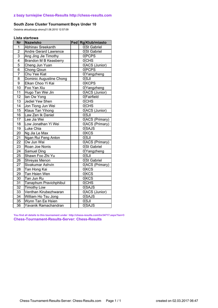 z bazy turniejów Chess-Results http://chess-results.com South Zone Cluster Tournament Boys Under 10 Ostatnia aktualizacja strony21.06.2010 12:57:09 Lista startowa Nr Nazwisko 1 Abhinav Sreekanth 2 Andre Gerard Lawrence 3 Ang Jing Jie Timothy 4 Brandon M B Keasberry 5 Cheng Jun Yuan 6 Chong Qixun 7 Chu Yee Kiat 8 Dominic Augustine Chong 9 Elkan Choo Yi Kai 10 Foo Yan Xiu 11 Hugo Tan Wei Jin 12 Ian Ow Yong 13 Jediel Yew Shen 14 Jon Tiong Jun Wei 15 Klaus Tan Yihong 16 Law Zen Ik Daniel 17 Lee Jia Wei 18 Low Jonathan Yi Wei 19 Luke Chia 20 Ng Jia Le Max 21 Ngan Rui Feng Anton 22 Ow Jun Wai 23 Roan Joe Nonis 24 Samuel Ding 25 Shawn Foo Zhi Yu 26 Shreyas Menon 27 Sivakumar Ashvin 28 Tan Hong Kai 29 Tan Hsien Wen 30 Tan Jun Ru 31 Tanaphum Pravichphibul 32 Timothy Low 33 Venthan Kirubezhwaran 34 William Ho Tsu Jong 35 Wynn Tan Ee Hsien 36 Yavanik Ramachandran Fed Rg Klub/miasto 0 St Gabriel 0 St Gabriel 0 PCPS 0 CHS 0 ACS (Junior) 0 PCPS 0 Yangzheng 0 SJI 0 KCPS 0 Yangzheng 0 ACS (Junior) 0 Fairfield 0 CHS 0 CHS 0 ACS (Junior) 0 SJI 0 ACS (Primary) 0 ACS (Primary) 0 SAJS 0 KCS 0 SJI 0 ACS (Primary) 0 St Gabriel 0 Yangzheng 0 SJI 0 St Gabriel 0 ACS (Primary) 0 KCS 0 KCS 0 KCS 0 CHS 0 SAJS 0 ACS (Junior) 0 SAJS 0 SJI 0 SAJS You find all details to this tournament under http://chess-results.com/tnr34717.aspx?lan=3 Chess-Tournament-Results-Server: Chess-Results Chess-Tournament-Results-Server: Chess-Results.com Page 1 / 1 created on 02.03.2017 06:47