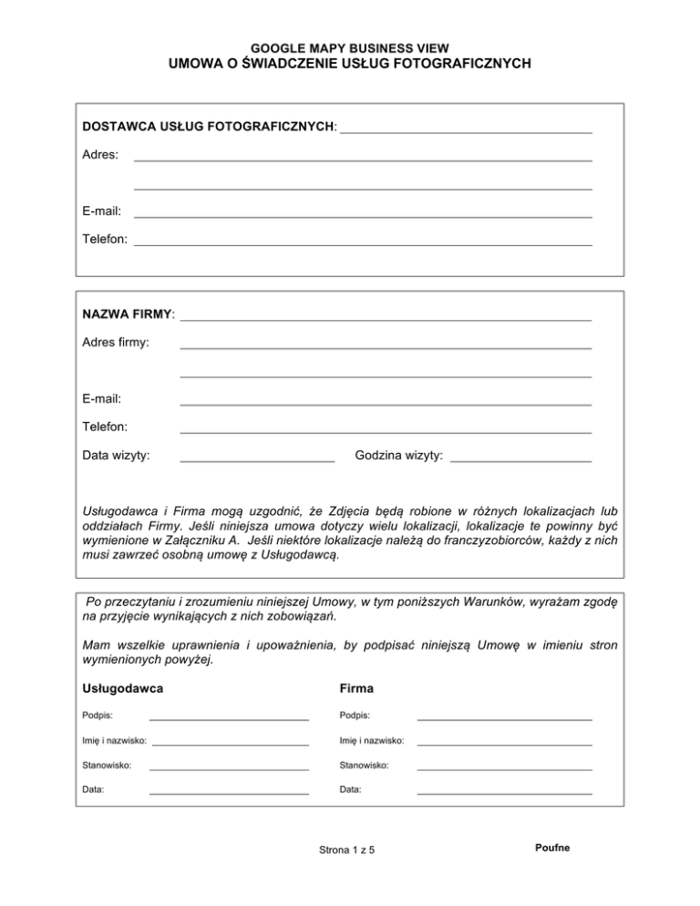 GOOGLE MAPY BUSINESS VIEW UMOWA O ŚWIADCZENIE USŁUG FOTOGRAFICZNYCH DOSTAWCA USŁUG FOTOGRAFICZNYCH: Adres: E-mail: Telefon: NAZWA FIRMY: Adres firmy: E-mail: Telefon: Data wizyty: Godzina wizyty: Usługodawca i Firma mogą uzgodnić, że Zdjęcia będą robione w różnych lokalizacjach lub oddziałach Firmy. Jeśli niniejsza umowa dotyczy wielu lokalizacji, lokalizacje te powinny być wymienione w Załączniku A. Jeśli niektóre lokalizacje należą do franczyzobiorców, każdy z nich musi zawrzeć osobną umowę z Usługodawcą. Po przeczytaniu i zrozumieniu niniejszej Umowy, w tym poniższych Warunków, wyrażam zgodę na przyjęcie wynikających z nich zobowiązań. Mam wszelkie uprawnienia i upoważnienia, by podpisać niniejszą Umowę w imieniu stron wymienionych powyżej. Usługodawca Firma Podpis: Podpis: Imię i nazwisko: Imię i nazwisko: Stanowisko: Stanowisko: Data: Data: Strona 1 z 5 Poufne GOOGLE MAPY BUSINESS VIEW UMOWA O ŚWIADCZENIE USŁUG FOTOGRAFICZNYCH Warunki umowy 1. Informacje ogólne. Niniejsza Umowa zostaje zawarta pomiędzy dostawcą usług fotograficznych („Usługodawca”) a przedsiębiorcą, którego lokal jest fotografowany w ramach programu Google Mapy Business View („Firma”). 2. Program Google Mapy Business View. Usługodawca jest niezależnym kontrahentem i ani on, ani nikt z jego personelu nie jest pracownikiem ani przedstawicielem Google. Jednak Usługodawca ma prawo w ramach programu Google Mapy Business View do świadczenia usług fotograficznych lokalnym firmom, które chcą wziąć udział w programie Google Mapy Business View. 3. Przedmiot Umowy. Przedmiotem umowy jest sfotografowanie przez Usługodawcę zewnętrznych i wewnętrznych części obiektu Firmy, które wskaże ona jako przeznaczone do fotografowania w ramach programu Zdjęcia firmowe („Zdjęcia”). Usługodawca dołoży uzasadnionych z handlowego punktu widzenia starań w celu zagwarantowania, że Zdjęcia są zgodne z wymogami technicznymi programu Google Mapy Business View. 4. Uiszczenie Opłaty za usługę. Usługodawca i Firma uzgodnią kwotę za wykonanie Zdjęć do programu Google Mapy Business View i powiązane z tym usługi („Opłata za usługę”), a firma ureguluje Opłatę za usługę po wykonaniu zdjęć przez Usługodawcę (zgodnie z zapisem zawartym w punkcie 4 poniżej). 5. Usługi i prawa własności intelektualnej do zdjęć. W zamian za Opłatę za usługę: (a) Usługodawca przenosi na Firmę majątkowe prawa autorskie do korzystania ze Zdjęć oraz do rozporządzania prawem do korzystania ze Zdjęć bez ograniczeń terytorialnych. Przeniesienie majątkowych praw autorskich obejmuje następujące pola eksploatacji: (i) wprowadzenie do pamięci komputera w celu przygotowania do publikacji; (ii) wprowadzenie do pamięci serwera w celu udostępniania w serwisach sieciowych; (iii) zwielokrotnianie egzemplarzy (w postaci periodyków, albumów fotograficznych, ilustracji do książek, kalendarzy, widokówek, druków reklamowych, bannerów reklamowych, reklamy sieciowej, utworów multimedialnych); (iv) wprowadzanie zwielokrotnionych egzemplarzy do obrotu; (v) najem i użyczanie egzemplarzy; (vi) udostępnienie fotografii w taki sposób, aby każdy mógł mieć do nich dostęp w wybranym czasie i miejscu, w tym za pomocą protokołu TCP/IP. (b) Usługodawca udziela Firmie zezwolenia na wykonywanie zależnych praw autorskich oraz przenosi na Firmę prawo zezwalania na wykonywanie zależnych praw autorskich; (c) Usługodawca dołoży uzasadnionych z handlowego punktu widzenia starań w celu zagwarantowania, że Zdjęcia są zgodne z wymaganiami technicznymi programu Google Mapy Business View; Strona 2 z 5 Poufne GOOGLE MAPY BUSINESS VIEW UMOWA O ŚWIADCZENIE USŁUG FOTOGRAFICZNYCH (d) Usługodawca niniejszym przenosi wszystkie prawa własności egzemplarzy Zdjęć na Firmę; (e) Usługodawca zobowiązuje się do niewykonywania wszelkich autorskich praw osobistych, w tym praw do oznaczenia ich swoim nazwiskiem lub pseudonimem. Autorskie prawa osobiste wykonuje Firma w imieniu Usługodawcy. (f) Usługodawca prześle do Google Zdjęcia do obróbki i użytkowania zgodnie z punktem 6 poniżej. 6. Warunki regulujące przesyłanie, obróbkę i wykorzystywanie zdjęć. (a) Warunki korzystania z usług Google. Firma zgadza się, aby przesyłanie, przetwarzanie i używanie Zdjęć były regulowane przez standardowe warunki korzystania z usług Google dostępne na stronie www.google.com/intl/pl/policies/terms (wraz z odpowiednimi warunkami dodatkowymi określonymi na stronie http://www.google.com/intl/pl/maps/about/partners/businessview) lub pod innymi adresami URL albo w warunkach dodatkowych, jakie Google może wskazać w dowolnym momencie (łącznie „Warunki korzystania z usług Google”). (b) Upoważnienie do przesyłania Zdjęć do Google w celu wykorzystania przez Google. Firma niniejszym upoważnia Usługodawcę do przesłania w jej imieniu Zdjęć do Google oraz udziela zgody na używanie Zdjęć przez Google zgodnie z Warunkami korzystania z usług Google. 7. Niewyłączna licencja dla Usługodawcy. Firma udziela Usługodawcy niewyłącznej licencji na wykorzystanie uzasadnionej liczby Zdjęć zrobionych w ramach niniejszej Umowy jako „próbki” lub „kopii do portfolio” w celu archiwizacji przykładów pracy Usługodawcy oraz reklamy i sprzedaży profesjonalnych usług Usługodawcy. 8. Godzina i data świadczenia usług. Po podpisaniu Umowy Usługodawca zarezerwuje uzgodnioną godzinę i dzień na świadczenie usług fotograficznych. Wszystkie Opłaty za usługi są bezzwrotne z wyjątkiem sytuacji opisanej w punkcie 9 poniżej lub o ile sam Usługodawca zgodzi się dopuścić zmiany harmonogramu świadczenia usług. 9. Zwroty opłat. Usługodawca zwróci Firmie wszystkie uiszczone z góry Opłaty za usługi (ale będzie zwolniony od wszelkiej dalszej odpowiedzialności z tytułu Umowy), jeśli Google odrzuci Zdjęcia z powodu niespełniania przez nie w