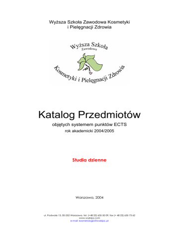 Wyższa Szkoła Zawodowa Kosmetyki i Pielęgnacji Zdrowia Katalog Przedmiotów objętych systemem punktów ECTS rok akademicki 2004/2005 Studia dzienne Warszawa, 2004 ul. Podwale 13, 00-252 Warszawa, tel. (+48 22) 635 50 09, fax (+ 48 22) 635 73 62 www.wszkipz.com e-mail: [email protected] Studia dzienne 1 rok KATALOG PRZEDMIOTÓW Psychologia i etyka Marketing i reklama Podstawy biznesu Pierwsza pomoc Informatyka Język angielski WF Anatomia Fizjologia Medycyna ogólna i patofizjologia Fizyka Chemia ogólna Chemia organiczna Biochemia Fizjologia stosowana Bakteriologia i mikologia Farmakologia i toksykologia Dermatologia ogólna Dietetyka Surowce i fizykochemia form kosmetycznych Immunologia i alergologia Medycyna fizykalna Chirurgia plastyczna Podstawy wiedzy o kosmetykach Wstęp do dermatologii Aparatura kosmetyczna Kosmetyka pielęgnacyjna Metody oceny działania Kosmetykologia Podstawy estetyki i makijażu Kosmetyka lekarska Pielęgnacja i upiększanie włosów Materiałoznawstwo Perfumeria Farmakognozja i kosmetyka naturalna Niekonwencjonalne techniki kosmetyczne Kosmetologia stanów patologicznych Wykład obieralny Seminarium dyplomowe Praca dyplomowa Razem PK razem 3 2 2 1 4 8 0 3 3 4 2 9 5 3 3 3 4 4 2 Sem. I Sem. II 3 2 2 1 2 4 2 2 2 3 3 4 2 2 5 7 3 3 3 4 4 2 7 4 3 2 4 2 1 27 4 10 4 3 2 2 4 4 Sem. III Sem. IV Sem. V Sem. VI 4 3 4 3 2 4 2 4 1 5 6 2 6 4 5 2 3 2 6 5 2 2 2 4 2 2 2 9 5 15 181 2 4 29 2/22 31 28 5 32 31 5 15 30 Nazwa przedmiotu Informatyka Typ zajęć zajęcia praktyczne Semestr 1, 2 Ilość godzin 60 Punkty ECTS 4 Prerekwizyty brak Wykładowca/prowadzący Dr inż. Sergiusz Dzierzgowski Treści merytoryczne przedmiotu Przekazanie podstawowych informacji o budowie i działaniu komputera, architekturze sieci komputerowych i systemach operacyjnych ze szczególnym uwzględnieniem platformy Windows. Nauka posługiwania się Internetem i pocztą elektroniczną, w tym posługiwanie się przeglądarkami oraz zakładanie i obsługa kont pocztowych. Posługiwanie się edytorem tekstu MS Word w zakresie pisania i formatowania tekstu, tworzenia i formatowania tabel, list punktowanych i numerowanych, posługiwanie się kreatorami standardowych dokumentów. Dołączanie obiektów, miedzy innymi wytworzonych za pomocą edytorów graficznych oraz edytorów wzorów chemicznych i matematycznych. Sporządzanie prezentacji w Power Point. Przeprowadzanie obliczeń i prezentowanie wyników w postaci wykresów, histogramów i diagramów za pomocą programu MS Excel. Cele dydaktyczne przedmiotu Biegłe korzystanie z edytora tekstu, arkusza kalkulacyjnego, edytora prezentacji i edytorów graficznych, w tym wyspecjalizowanych edytorów wzorów chemicznych i matematycznych. Sprawne posługiwanie się Internetem i pocztą elektroniczną. Metody ewaluacji Praktyczne sprawdziany cząstkowe przeprowadzane po zakończeniu kolejnych działów. Zalecane lektury 1. Pomoc programu Microsoft Office 2. Pomoc programu Chem Sketch 5.0 3. Piotr Wróblewski; ABC komputera, wyd. IV; Wydawnictwo Helion SA, Gliwice 2004 4. Aleksandra Kula; ABC Word 2003 PL; Wydawnictwo Helion SA, Gliwice 2004 5. Grzegorz Kowalczyk; Excel 2000 PL. Ćwiczenia praktyczne; Wydawnictwo Helion SA, Gliwice 2000 3/22 Nazwa przedmiotu Typ zajęć Semestr Ilość godzin Punkty ECTS Prerekwizyty Wykładowca/prowadzący Treści merytoryczne przedmiotu Cele dydaktyczne przedmiotu Metody ewaluacji Zalecane lektury Język angielski ćwiczenia audytoryjne 1 60 2 Gregory Buckley, MSc Słownictwo kosmetyczne, medyczne, budowa ciała, rozmowa z klientem Komunikatywna znajomość jęz. angielskiego ze szczególnym uwzględnieniem słownictwa specjalistycznego. Ocena aktywności na zajęciach, konwersacje, test semestralny Gazety, czasopisma, ulotki w jęz. angielskim, artykuły z Internetu, reklamy kosmetyków 4/22 Nazwa przedmiotu Typ zajęć Semestr Ilość godzin Punkty ECTS Prerekwizyty Wykładowca/prowadzący Treści merytoryczne przedmiotu Cele dydaktyczne przedmiotu Metody ewaluacji Zalecane lektury Język angielski ćwiczenia audytoryjne 2 60 2 Gregory Buckley, MSc Słownictwo kosmetyczne, medyczne, budowa ciała, rozmowa z klientem Komunikatywna znajomość jęz. angielskiego ze szczególnym uwzględnieniem słownictwa specjalistycznego. Ocena aktywności na zajęciach, konwersacje, test semestralny Gazety, czasopisma, ulotki w jęz. angielskim, artykuły z Internetu, reklamy kosmetyków 5/22 Nazwa przedmiotu Typ zajęć Semestr Ilość godzin Punkty ECTS Prerekwizyty Wykładowca/prowadzący Treści merytoryczne przedmiotu Cele dydaktyczne przedmiotu Metody ewaluacji Zalecane lektury Anatomia wykład 1 20 3 brak Dr n. med. Paweł Rebandel Płaszczyzny, osie, kierunki, linie orientacyjne, części ciała. Ośrodkowy układ nerwowy, układy: krążenia, oddechowy, chłonny. Jama ustna, układ trawienno-wydalniczy. Przestrzeń zaotrzewna. Narządy płciowe męskie i żeńskie. Kończyny. Układ kostny. Mięśnie. Poznanie anatomii organizmu człowieka, ze szczególnym uwzględnieniem obszarów i narządów ważnych w praktyce kosmetycznej. Egzamin Mały atlas anatomii – R. Aleksandrowicz, Anatomia człowieka – Z. Ignasiak, Atlas anatomii człowieka – T. Sobotta, Podstawy anatomii człowieka B. K. Gołąb 6/22 Nazwa przedmiotu Typ zajęć Semestr Ilość godzin Punkty ECTS Prerekwizyty Wykładowca/prowadzący Treści merytoryczne przedmiotu Cele dydaktyczne przedmiotu Metody ewaluacji Zalecane lektury Fizjologia wykład 1, 2 40 3 brak Dr n. med. Wiktor Niewiadomski I Podstawowe funkcje komórki 1. Skład chemiczny ciała 2. Budowa komórki 2. Ruch i transport cząsteczek przez błonę komórkową 3. Metabolizm komórkowy 4. Synteza białek 5. Podział, specjalizacja i śmierć komórki II. Koordynacja i sterowanie czynności organizmu 1. Środowisko wewnętrzne i homeostaza 2. Koordynacja i sterowanie nerwowe 3. Koordynacja i sterowanie hormonalne 4. Ruch i narządy zmysłów III. Podstawowe czynności organizmu 1. Krążenie 2. Oddychanie