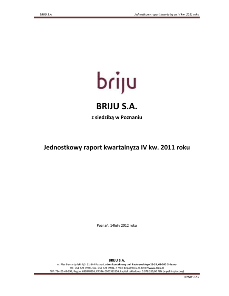 BRIJU S.A. Jednostkowy raport kwartalny za IV kw. 2011 roku BRIJU S.A. z siedzibą w Poznaniu Jednostkowy raport kwartalnyza IV kw. 2011 roku Poznań, 14luty 2012 roku BRIJU S.A. ul. Plac Bernardyński 4/3 61-844 Poznań, adres kontaktowy : ul. Paderewskiego 25-35, 62-200 Gniezno tel.: 061 424 59 03, fax.: 061 424 59 01, e-mail: [email protected], http://www.briju.pl NIP: 784-21-49-999, Regon: 639848296, KRS Nr 0000382656, kapitał zakładowy: 5.978.260,00 PLN (w pełni opłacony) strona 1 z 9 BRIJU S.A. Jednostkowy raport kwartalny za IV kw. 2011 roku Spis treści 1. PODSTAWOWE INFORMACJE O SPÓŁCE .....................................................................................3 2. WYBRANE DANE FINANSOWE ....................................................................................................5 3. ISTOTNE ZDARZENIA ORAZ CZYNNIKI, KTÓRE MIAŁY WPŁYW NA PREZENTOWANE WYNIKI FINANSOWE................................................................................................................................. 4. STRATEGIA W OBSZARZE ROZWOJU DZIAŁALNOŚCI ...................................................................7 5. STANOWISKO ZARZĄDU ODNOŚNIE PROGNOZ FINANSOWYCH NA 2011 ROK...........................8 6. OŚWIADCZENIE ZARZĄDU...........................................................................................................9 BRIJU S.A. ul. Plac Bernardyński 4/3 61-844 Poznań, adres kontaktowy : ul. Paderewskiego 25-35, 62-200 Gniezno tel.: 061 424 59 03, fax.: 061 424 59 01, e-mail: [email protected], http://www.briju.pl NIP: 784-21-49-999, Regon: 639848296, KRS Nr 0000382656, kapitał zakładowy: 5.978.260,00 PLN (w pełni opłacony) strona 2 z 9 BRIJU S.A. Jednostkowy raport kwartalny za IV kw. 2011 roku 1. PODSTAWOWE INFORMACJE O SPÓŁCE Tradycja jubilerska założycieli BRIJU S.A. sięga już 1912 roku, kiedy powstała pierwsza rodzinna firma jubilerska, założona i prowadzona przez dziadka braci Piotrowskich – wspólników Spółki. Od 1990 roku, bracia – obecni akcjonariusze działali pod nazwą Firma Jubilerska Piotrowscy. Futurat Sp. z o.o., poprzednik prawny spółki akcyjnej, została zawiązana dnia 18 lipca 2000 roku na czas nieoznaczony. Dnia 15 marca 2011 roku uchwałą Zgromadzenia Wspólników doszło do przekształcenia Spółki ze spółki z ograniczoną odpowiedzialnością w spółkę akcyjną. W związku z nową strategią rozwoju z dniem 27 czerwca 2011 roku spółka zmieniła nazwę z FUTURAT Spółka Akcyjna na BRIJU Spółka Akcyjna. Przedmiotem działalności Spółki jest projektowanie, produkcja i dystrybucja biżuterii wykonanej ze złota i kamieni szlachetnych. Jednostka zatrudnia około 50 pracowników stanowiących zespół wysoko wykwalifikowanych specjalistów. Pozyskanie i wdrożenie nowoczesnych technologii znacznie poszerzyło zakres zdolności wytwórczych i asortyment wyrobów. Na przestrzeni lat, Spółka stała się jednym z dominujących producentów biżuterii na rynku polskim. Naturalną konsekwencją tej ekspansji było rozszerzenie dystrybucji poza granice kraju. Obecnie Spółka dysponuje własnym działem projektowania oraz licznymi kontaktami handlowymi w wielu krajach, do których jego biżuteria jest eksportowana, m.in. w Niemczech, Belgii, Włoszech, Czechach, na Węgrzech i w Słowacji. Spółka prowadzi działalność w poniższych obszarach: • Projektowanie i produkcja biżuterii; • Sprzedaż biżuterii: - handel detaliczny, - handel hurtowy (kraj i zagranica); • Handel surowcami (kruszcem złota i srebra). Doświadczenie i nowoczesność produkcji oraz oryginalność produkowanej biżuterii spowodowały, że dzisiaj Spółka jest jednym z najlepszych producentów biżuterii w Europie Środkowej. Władze Spółki Zarząd: • • • Przemysław Piotrowski - Prezes Zarządu Tomasz Piotrowski - Wiceprezes Zarządu Jarosław Piotrowski - Wiceprezes Zarządu Rada Nadzorcza: • • • • • Sławomir Piotrowski - Przewodniczący Rady Nadzorczej Karol Sikorski - Wiceprzewodniczący Rady Nadzorczej Jerzy Simiński - Sekretarz Rady Nadzorczej Barbara Piotrowska - Członek Rady Nadzorczej Jacek Krzyżaniak - Członek Rady Nadzorczej BRIJU S.A. ul. Plac Bernardyński 4/3 61-844 Poznań, adres kontaktowy : ul. Paderewskiego 25-35, 62-200 Gniezno tel.: 061 424 59 03, fax.: 061 424 59 01, e-mail: [email protected], http://www.briju.pl NIP: 784-21-49-999, Regon: 639848296, KRS Nr 0000382656, kapitał zakładowy: 5.978.260,00 PLN (w pełni opłacony) strona 3 z 9 BRIJU S.A. Jednostkowy raport kwartalny za IV kw. 2011 roku Struktura Akcjonariatu Na dzień sporządzenia raportu okresowego struktura akcjonariatu przedstawiała się następująco: Tomasz Piotrowski 1 666 667 Udział w kapitale zakładowym 27,88% Przemysław Piotrowski 1 666 667 Jarosław Piotrowski Akcjonariusz Pozostali akcjonariusze z udziałem poniżej 5% Inwestorzy akcji serii D Razem 2 833 334 Udział w ogólnej liczbie głosów 29,89% 27,88% 2 833 334 29,89% 1 666 666 27,88% 2 833 332 29,89% 478 260 8,00% 478 260 5,05% Liczba akcji Liczba głosów 500 000 8,36% 500 000 5,28% 5 978 260 100,00% 9 478 260 100,00% BRIJU S.A. ul. Plac Bernardyński 4/3 61-844 Poznań, adres kontaktowy : ul. Paderewskiego 25-35, 62-200 Gniezno tel.: 061 424 59 03, fax.: 061 424 59 01, e-mail: [email protected], http://www.briju.pl NIP: 784-21-49-999, Regon: 639848296, KRS Nr 0000382656, kapitał zakładowy: 5.978.260,00 PLN (w pełni opłacony) strona 4 z 9 BRIJU S.A. Jednostkowy raport kwartalny za IV kw. 2011 roku 2. WYBRANE DANE FINANSOWE Poniższe tabele prezentują wybrane dane finansowe Spółki za IV kwartał 2011 r. oraz narastająco za okres od początku roku do końca IV kwartału 2011 r. wraz z okresami porównawczymi, obejmującymi analogiczne okresy roku 2010. Jednocześnie z uwagi na trwające badanie sprawozdania finansowego przez biegłego rewidenta Zarząd Spółki zastrzega, że wyniki finansowe przedstawione w przygotowywanym r