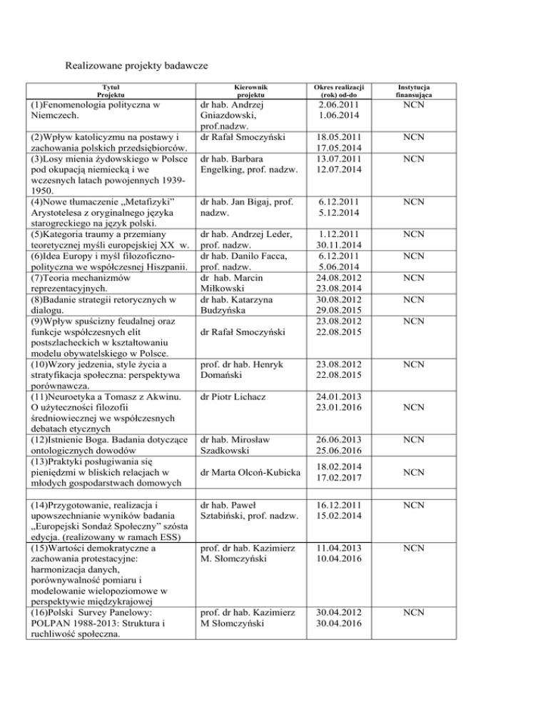 Realizowane projekty badawcze Tytuł Projektu (1)Fenomenologia polityczna w Niemczech. (2)Wpływ katolicyzmu na postawy i zachowania polskich przedsiębiorców. (3)Losy mienia żydowskiego w Polsce pod okupacją niemiecką i we wczesnych latach powojennych 19391950. (4)Nowe tłumaczenie „Metafizyki” Arystotelesa z oryginalnego języka starogreckiego na język polski. (5)Kategoria traumy a przemiany teoretycznej myśli europejskiej XX w. (6)Idea Europy i myśl filozoficznopolityczna we współczesnej Hiszpanii. (7)Teoria mechanizmów reprezentacyjnych. (8)Badanie strategii retorycznych w dialogu. (9)Wpływ spuścizny feudalnej oraz funkcje współczesnych elit postszlacheckich w kształtowaniu modelu obywatelskiego w Polsce. (10)Wzory jedzenia, style życia a stratyfikacja społeczna: perspektywa porównawcza. (11)Neuroetyka a Tomasz z Akwinu. O użyteczności filozofii średniowiecznej we współczesnych debatach etycznych (12)Istnienie Boga. Badania dotyczące ontologicznych dowodów (13)Praktyki posługiwania się pieniędzmi w bliskich relacjach w młodych gospodarstwach domowych (14)Przygotowanie, realizacja i upowszechnianie wyników badania „Europejski Sondaż Społeczny” szósta edycja. (realizowany w ramach ESS) (15)Wartości demokratyczne a zachowania protestacyjne: harmonizacja danych, porównywalność pomiaru i modelowanie wielopoziomowe w perspektywie międzykrajowej (16)Polski Survey Panelowy: POLPAN 1988-2013: Struktura i ruchliwość społeczna. Kierownik projektu Okres realizacji (rok) od-do Instytucja finansująca 2.06.2011 1.06.2014 NCN NCN dr hab. Barbara Engelking, prof. nadzw. 18.05.2011 17.05.2014 13.07.2011 12.07.2014 dr hab. Jan Bigaj, prof. nadzw. 6.12.2011 5.12.2014 NCN dr hab. Andrzej Leder, prof. nadzw. dr hab. Danilo Facca, prof. nadzw. dr hab. Marcin Miłkowski dr hab. Katarzyna Budzyńska NCN dr Rafał Smoczyński 1.12.2011 30.11.2014 6.12.2011 5.06.2014 24.08.2012 23.08.2014 30.08.2012 29.08.2015 23.08.2012 22.08.2015 prof. dr hab. Henryk Domański 23.08.2012 22.08.2015 NCN dr Piotr Lichacz 24.01.2013 23.01.2016 dr hab. Andrzej Gniazdowski, prof.nadzw. dr Rafał Smoczyński NCN NCN NCN NCN NCN NCN dr hab. Mirosław Szadkowski 26.06.2013 25.06.2016 NCN dr Marta Olcoń-Kubicka 18.02.2014 17.02.2017 dr hab. Paweł Sztabiński, prof. nadzw. 16.12.2011 15.02.2014 NCN prof. dr hab. Kazimierz M. Słomczyński 11.04.2013 10.04.2016 NCN prof. dr hab. Kazimierz M Słomczyński 30.04.2012 30.04.2016 NCN NCN (17)From school to work: indywidualne i instytucjonalne wyznaczniki kształtowania się ścieżek karier edukacyjno-zawodowych młodych Polaków (18)Instytucjonalny i indywidualny wymiar religijności osób LGBT w Polsce. (19)Reakcje społeczne wobec polskich emigrantów ekonomicznych w Północnej Anglii po 2004 roku. (20)Dylematy kooperacji w warunkach zróżnicowania statusowego (21)Wokół reformy rolnej 1944-1948: doświadczenie i pamięć społeczna (22)Kto wygrywa a kto przegrywa w parlamentarnych wyborach: Od formalnej teorii do analiz empirycznych (23)Przedsiębiorstwa imigranckie w Polsce. Etniczność jako skrypt kulturowy, strategia maksymalizowania zysku oraz jako bariera w działalności gospodarczej imigrantów (24)Implikacje wybranych aspektów teorii ewolucji dla problemu definiowania życia prof. dr hab. Henryk Domański 22.03.2013 21.09.2016 NCN dr Dorota Hall 8.12.2011 9.12.2014 NCN dr Rafał Smoczyński 16.12.2011 15.12.2014 NCN dr Zbigniew Karpiński 28.01.2013 27.01.2016 28.08.2013 27.08.2018 NCN dr Anna Wylegała dr Joshua K. Dubrow NCN NCN 24.01.2013 23.01.2016 Dr Katarzyna Andrejuk 01.04.2014 31.03.2017 Dr Krzysztof Chodasewicz 22.09.2014 21.03.2016 (25)Ponadindywidualne uwarunkowania „talentu” oraz kulturowe źródła i społeczne koszty ich pomijania. (26)Ucieleśnienie poznania muzycznego. (27)Uzasadnienie teorii sprawiedliwości: dziedzictwo Rawisa. (28)Bycie tatą według nowych wzorców ojcostwa. Ojcostwo w życiu codziennym w kontekście społecznoinstytucjonalnym w społeczeństwie polskim na przełomie XXI wieku. (29)Tworzenie przestrzeni biura. Narracje, obrazy, wyobrażenia. mgr Piotr Szenajch 13.12.2011 12.09.2015 NCN mgr Jakub Matyja 31.08.2012 30.08.2014 31.08.2012 30.08.2014 NCN (30)Nowe podejście do analiz relacji między demokracją i zaufaniem: Porównanie krajów europejskich z zastosowaniem metod ilościowych i jakościowych (31)Orientacje temporalne i wzory użytkowania czasu a nierówności społeczne mgr Marta Kołczyńska mgr Sebastian Szymański mgr Katarzyna Suwada NCN NCN NCN NCN 05.09.2012 04.09.2014 mgr Karolina Dudek mgr Ewa Jarosz 05.09.2012 04.03.2015 NCN 28.02.2013 27.09.2015 NCN 07.03.2013 06.03.2015 NCN (32)Nauki behawioralne w prawie zastosowania, filozoficzne implikacje, kontrowersje (33)Trudne związki między miejscem a tożsamością w sytuacji długotrwałego uchodźstwa. Przypadek obozu dla uchodźców palestyńskich na Zachodnim Brzegu Jordanu (34)Structures of Dialogue in Debate and Financial Discourse: Modelling an 'Ore' for Argument Mining (Struktury dialogowe w debacie i dyskursie finansowym: Modelowanie "kruszcu" dla wydobywania argumentów) (35)Twórczość Zygmunta Baumana w kontekście współczesnych teorii kultury (36)Poznawanie jako wewnętrzne modelowanie. Rola pojęcia modeli i symulacji wewnętrznych w filozoficznych i kognitywistycznych koncepcjach poznania (37)Edycja pierwszej księgi komentarza Henryka Tottinga z oyty do „Sentecji”Piotra Lombarda. (38)John Wyclif i jego traktat o czasie. (39)Dynamika potrzeb, interesów i wartości a konflikty i konsens społeczny w procesach stanowienia demokracji rynkowej: Polacy 19802010 w perspektywie „długiego trwania”. (40)Przemiany intuicyjnych podstaw matematyki a historyczna zmienność wiedzy matematycznej. Geneza pojęć infinitarnych w geometrii euklidesowej oraz proces konstytucji platonizmu matematycznego jako przyczyna powstania nauki nowożytnej. (41)Myśl polska XV wieku dotycząca kontraktów obrotu rentą