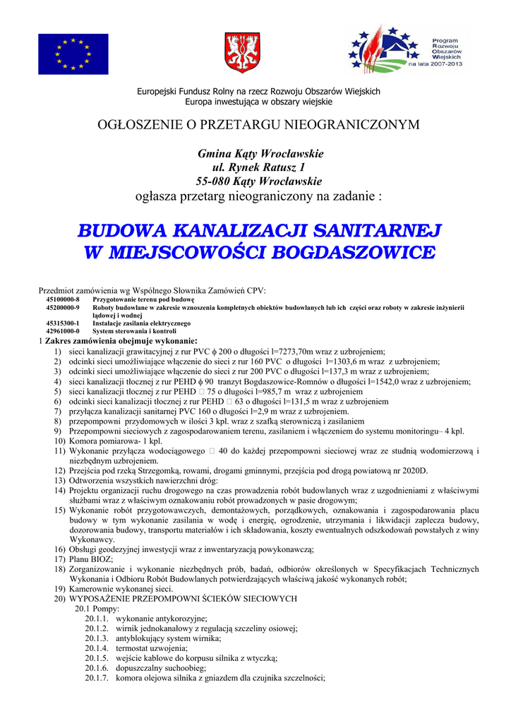 Europejski Fundusz Rolny na rzecz Rozwoju Obszarów Wiejskich Europa inwestująca w obszary wiejskie OGŁOSZENIE O PRZETARGU NIEOGRANICZONYM Gmina Kąty Wrocławskie ul. Rynek Ratusz 1 55-080 Kąty Wrocławskie ogłasza przetarg nieograniczony na zadanie : BUDOWA KANALIZACJI SANITARNEJ W MIEJSCOWOŚCI BOGDASZOWICE Przedmiot zamówienia wg Wspólnego Słownika Zamówień CPV: 45100000-8 45200000-9 45315300-1 42961000-0 Przygotowanie terenu pod budowę Roboty budowlane w zakresie wznoszenia kompletnych obiektów budowlanych lub ich części oraz roboty w zakresie inżynierii lądowej i wodnej Instalacje zasilania elektrycznego System sterowania i kontroli 1 Zakres zamówienia obejmuje wykonanie: 1) sieci kanalizacji grawitacyjnej z rur PVC φ 200 o długości l=7273,70m wraz z uzbrojeniem; 2) odcinki sieci umożliwiające włączenie do sieci z rur 160 PVC o długości l=1303,6 m wraz z uzbrojeniem; 3) odcinki sieci umożliwiające włączenie do sieci z rur 200 PVC o długości l=137,3 m wraz z uzbrojeniem; 4) sieci kanalizacji tłocznej z rur PEHD φ 90 tranzyt Bogdaszowice-Romnów o długości l=1542,0 wraz z uzbrojeniem; 5) sieci kanalizacji tłocznej z rur PEHD 75 o długości l=985,7 m wraz z uzbrojeniem 6) odcinki sieci kanalizacji tłocznej z rur PEHD 63 o długości l=131,5 m wraz z uzbrojeniem 7) przyłącza kanalizacji sanitarnej PVC 160 o długości l=2,9 m wraz z uzbrojeniem. 8) przepompowni przydomowych w ilości 3 kpl. wraz z szafką sterowniczą i zasilaniem 9) Przepompowni sieciowych z zagospodarowaniem terenu, zasilaniem i włączeniem do systemu monitoringu– 4 kpl. 10) Komora pomiarowa- 1 kpl. 11) Wykonanie przyłącza wodociągowego 40 do każdej przepompowni sieciowej wraz ze studnią wodomierzową i niezbędnym uzbrojeniem. 12) Przejścia pod rzeką Strzegomką, rowami, drogami gminnymi, przejścia pod drogą powiatową nr 2020D. 13) Odtworzenia wszystkich nawierzchni dróg: 14) Projektu organizacji ruchu drogowego na czas prowadzenia robót budowlanych wraz z uzgodnieniami z właściwymi służbami wraz z właściwym oznakowaniu robót prowadzonych w pasie drogowym; 15) Wykonanie robót przygotowawczych, demontażowych, porządkowych, oznakowania i zagospodarowania placu budowy w tym wykonanie zasilania w wodę i energię, ogrodzenie, utrzymania i likwidacji zaplecza budowy, dozorowania budowy, transportu materiałów i ich składowania, koszty ewentualnych odszkodowań powstałych z winy Wykonawcy. 16) Obsługi geodezyjnej inwestycji wraz z inwentaryzacją powykonawczą; 17) Planu BIOZ; 18) Zorganizowanie i wykonanie niezbędnych prób, badań, odbiorów określonych w Specyfikacjach Technicznych Wykonania i Odbioru Robót Budowlanych potwierdzających właściwą jakość wykonanych robót; 19) Kamerownie wykonanej sieci. 20) WYPOSAŻENIE PRZEPOMPOWNI ŚCIEKÓW SIECIOWYCH 20.1 Pompy: 20.1.1. wykonanie antykorozyjne; 20.1.2. wirnik jednokanałowy z regulacją szczeliny osiowej; 20.1.3. antyblokujący system wirnika; 20.1.4. termostat uzwojenia; 20.1.5. wejście kablowe do korpusu silnika z wtyczką; 20.1.6. dopuszczalny suchoobieg; 20.1.7. komora olejowa silnika z gniazdem dla czujnika szczelności; 20.1.8. kabel zasilający w miejscu połączeń pozbawiony izolacji i zalany wodoszczelnym szczeliwem; 20.1.9. czujnik wilgoci; 20.1.10. zasilanie prądem trójfazowym; 20.1.11. pompy z wolnym przelotem 20.2. Studnia wykonana z polimerobetonu I powinna posiadać aprobaty techniczne Centralnego Ośrodka BadawczoRozwojowego Techniki Instalacyjnej INSTAL w Warszawie o grubości dna zbiornika przepompowni min 150 mm. 20.3. Studnia z kołnierzem antywyporowym; 20.4. Pokrywa szczelna - stal nierdzewna kwasoodporna 20.5. Drabinka – stal nierdzewna kwasoodporna z profilem antypoślizgowym; 20.6. Poręcz włazowa – stal nierdzewna kwasoodporna; 20.7. Podest obsługi – stal nierdzewna kwasoodporna; 20.8. Oryginalne kompletne stopy sprzęgające dla dane producenta pomp np. Grundfos (lub równoważne); 20.9. Dla każdej pompy dwie prowadnice rurowe ze stali nierdzewnej kwasoodpornej i o klasie 1.4404 wg EN grubości ścianki min. 2 mm; 20.10. Kolektor zbiorczy, piony tłoczne zbudowane ze stali nierdzewnej kwasoodpornej 20.11. Górne uchwyty prowadnic zbudowane ze stali nierdzewnej kwasoodpornej lub żeliwa 20.12. Certyfikowane zawiesia do wyciągania i opuszczania pomp ze stali nierdzewnej kwasoodpornej; 20.13. Wentylacja, grawitacyjna i mechaniczna z teleskopowym kanałem nawiewnym umożliwiającym wymianę powietrza przy dnie przepompowni podczas konserwacji, czyszczenia przepompowni, wentylacja wywiewna przymocowana do słupa oświetleniowego, należy zapewnić wentylację przejścia kablowego od szafy sterowniczej do pompowni. 20.14. Wylot tłoczny z kołnierzem; 20.15. Wszystkie połączenia kołnierzowe (nie dotyczy pomp ściekowych – stopy sprzęgające); 20.16. Elementy mocujące – stal nierdzewna kwasoodporna; 20.17. Na połączeniach kołnierzowych stosować śruby i nakrętki ze stali nierdzewnej gatunku 1.4571 wg EN; 20.18. Studnia separacyjna na piasek z osadnikiem o głębokości 60cm; 20.19. Zawór – zasuwa na wlocie ścieków do pompowni przed studnią separacyjną (możliwość zamknięcia dopływu ścieków do studni separacyjnej i komory przepompowni); 20.20. Możliwość przyłączenia zaworu napowietrzająco - odpowietrzającego lub złączki do płukania. 20.21. Przejścia rurociągów przez ścianę zbiornika wykonać w postaci uszczelnienia Tefix (lub równoważne) ze stali nierdzewnej i gumy NBR odpornej na agresywne działanie substancji zawartych w ściekach. 20.22. Wewnątrz studni zasuwy nożowe ze stali nierdzewnej i kwasoodpornej obustronnie szczelne; 20.23. Wlot zakończony gwintem zewnętrznym; 20.24. Zacisk do podłączenia przewodu uziemiającego; 20.25. Dno studni wykonane ze spadkiem min. 30o w kierunku wlotu pomp. 20.26. Luki montażowe i strop powinny być ocieplone 20.27. Wciągarka do pomp ściekowych. 20.28. Pompa dozująco-s
