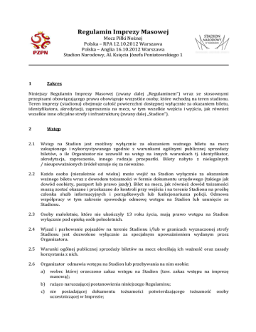 Regulamin Imprezy Masowej Mecz Piłki Nożnej Polska – RPA 12.10.2012 Warszawa Polska – Anglia 16.10.2012 Warszawa Stadion Narodowy, Al. Księcia Józefa Poniatowskiego 1 1 Zakres Niniejszy Regulamin Imprezy Masowej (zwany dalej „Regulaminem”) wraz ze stosownymi przepisami obowiązującego prawa obowiązuje wszystkie osoby, które wchodzą na teren stadionu. Teren imprezy (stadionu) obejmuje całość powierzchni dostępnej wyłącznie za okazaniem biletu, identyfikatora, akredytacji, zaproszenia na mecz, w tym wszelkie wejścia i wyjścia, jak również wszelkie inne oficjalne strefy i infrastrukturę (zwany dalej „Stadion”). 2 Wstęp 2.1 Wstęp na Stadion jest możliwy wyłącznie za okazaniem ważnego biletu na mecz zakupionego i wykorzystywanego zgodnie z warunkami ogólnymi publicznej sprzedaży biletów, o ile Organizator nie zezwolił na wstęp na innych warunkach tj. identyfikator, akredytacja, zaproszenie, innego rodzaju przepustki. Bilety nabyte z nielegalnych / nieupoważnionych źródeł uznaje się za nieważne. 2.2 Każda osoba (niezależnie od wieku) może wejść na Stadion wyłącznie za okazaniem ważnego biletu wraz z dowodem tożsamości w formie dokumentu urzędowego (takiego jak dowód osobisty, paszport lub prawo jazdy). Bilet na mecz, jak również dowód tożsamości muszą zostać okazane i przekazane do kontroli przy wejściu i na terenie Stadionu na prośbę członka służb informacyjnych i porządkowych lub funkcjonariusza policji. Odmowa współpracy w tym zakresie spowoduje odmowę wstępu na Stadion lub usunięcie ze Stadionu. 2.3 Osoby małoletnie, które nie ukończyły 13 roku życia, mają prawo wstępu na Stadion wyłącznie pod opieką osób pełnoletnich. 2.4 Wjazd i parkowanie pojazdów na terenie Stadionu i/lub w granicach wyznaczonej strefy Stadionu jest dozwolone wyłącznie za specjalnym upoważnieniem wydanym przez Organizatora. 2.5 Warunki ogólnej publicznej sprzedaży biletów na mecz określają ich ważność oraz zasady korzystania z nich. 2.6 Organizator odmawia wstępu na Stadion lub przebywania na nim osobie: a) wobec której orzeczono zakaz wstępu na Stadion (tzw. zakaz wstępu na imprezę masową); b) rażąco naruszającej postanowienia niniejszego Regulaminu; c) nie posiadającej dokumentu uczestniczącej w Imprezie; tożsamości potwierdzającego tożsamość osoby d) znajdującej się pod wpływem alkoholu, środków odurzających, psychotropowych lub innych podobnie działających środków; e) posiadającej broń lub inne przedmioty mogące w ocenie Organizatora stanowić zagrożenie, w tym m.in.: butelki, puszki, materiały wybuchowe, wyroby pirotechniczne, materiały pożarowo niebezpieczne, napoje alkoholowe, środki odurzające lub psychotropowe; f) zachowującej się agresywnie, prowokacyjnie albo w inny sposób stwarzającej zagrożenie bezpieczeństwa lub porządku Imprezy; g) używającej przedmiotów utrudniających identyfikację, a w szczególności zasłaniających twarz; h) używającej trąbki lub gwizdka, z uwagi na możliwość zagłuszenia podawanych komunikatów oraz zagrożenia zdrowia dla innych uczestników Imprezy, z uwagi na wytwarzany poziom hałasu; i) wchodzącej na obszary nie przeznaczone dla uczestników Imprezy, tj. płytę boiska, pomieszczenia służbowe, płoty, maszty, itp.; j) rzucającej jakimikolwiek przedmiotami na płytę boiska lub w innych uczestników Imprezy; k) wzniecającej ogień, palącej petardy, fajerwerki, świece dymne oraz inne środki pirotechniczne; l) głoszącej lub wywieszającej hasła, symbole, treści obsceniczne, wulgarne, obraźliwe, rasistowskie, itp.; m) załatwiającej potrzeby fizjologiczne poza toaletami; n) zaśmiecającej teren Stadionu, niszczącej jego urządzenia poprzez malowanie, oklejanie, uszkadzanie. 3 Środki kontroli osobistej 3.1 Członkowie służb informacyjnych i porządkowych lub funkcjonariusze policji są upoważnieni do kontroli – w tym z wykorzystaniem środków technicznych – czy dane osoby stwarzają zagrożenie dla bezpieczeństwa, a w szczególności, czy są pod wpływem alkoholu lub narkotyków bądź w posiadaniu broni lub innych niedozwolonych przedmiotów. Członkowie służb informacyjnych i porządkowych lub funkcjonariusze policji są upoważnieni do przeglądania odzieży danej osoby, bagażu oraz innych posiadanych przez nią przedmiotów. 3.2 Osoby wykorzystujące bilety w sposób niedozwolony, niestosujące się do wytycznych Organizatora (lub dowolnej upoważnionej osoby powołanej przez Organizatora), członka służb informacyjnych i porządkowych lub funkcjonariusza policji na Stadionie, stwarzające zagrożenie dla bezpieczeństwa bądź objęte lokalnym, krajowym lub zagranicznym zakazem wstępu na imprezę masową nie zostaną wpuszczone na Stadion i są zobowiązane niezwłocznie zwrócić bilet do Organizatora, bez prawa do jakiegokolwiek zwrotu pieniężnego z tego tytułu. Regulamin Imprezy Masowej Mecz Piłki Nożnej, Polska – RPA 12.10.2012 Warszawa Mecz Piłki Nożnej, Polska – Anglia 16.10.2012 Warszawa 2 4 4.1 Zachowanie na terenie Stadionu Od momentu wejścia na Stadion, wszystkie osoby zobowiązane są: a) postępować w taki sposób, by nie wyrządzić krzywdy, nie zranić, niepotrzebnie nie blokować innych osób bądź im nie zagrażać i nie przeszkadzać ani nie uszkodzić czegokolwiek; b) stosować się do wytycznych Organizatora (lub dowolnej upoważnionej osoby powołanej przez Organizatora), członka służb informacyjnych i porządkowych, służb ratowniczych lub funkcjonariusza policji obecnego na Stadionie; c) zajmować wyłącznie miejsca im przypisane w posiadanym bilecie na mecz i korzystać z wyznaczonych ścieżek poruszania się. Każdy posiadacz biletu zobowiązuje się do zmiany miejsca wskazanego na bilecie, jeżeli zostanie o to poproszony przez przedstawicieli służb informacyjnych i porządkowych lub funkcjonariuszy policji; Jeżeli ktokolwiek otrzyma informacj