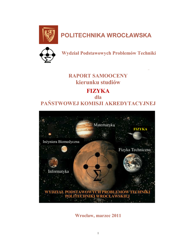 POLITECHNIKA WROCŁAWSKA Wydział Podstawowych Problemów Techniki RAPORT SAMOOCENY kierunku studiów FIZYKA dla PAŃSTWOWEJ KOMISJI AKREDYTACYJNEJ FIZYKA InŜyniera Biomedyczna Wrocław, marzec 2011 1 RAPORT SAMOOCENY Kierunek Fizyka Wydział Podstawowych Problemów Techniki Politechniki Wrocławskiej Wrocław, marzec 2011 Nazwa szkoły wyŜszej Politechnika Wrocławska 50-370, Wrocław WybrzeŜe Wyspiańskiego 27 tel.: (071) 320 22 77, fax.: (071) 322 36 64 e-mail: [email protected] Nazwa szkoły wyŜszej: Politechnika Wrocławska Nazwa wydziału (jednostki) prowadzącej oceniany kierunek (makrokierunek, studia międzykierunkowe): Wydział Podstawowych Problemów Techniki Nazwa ocenianego kierunku (makrokierunku, studiów międzykierunkowych), ze wskazaniem poziomu i formy kształcenia: Fizyka, I – licencjacki i II – magisterski stopień kształcenia, jednolite magisterskie studia stacjonarne, dzienne Skład zespołu przygotowującego raport samooceny Imię i nazwisko Stanowisko/tytuł lub stopień naukowy/funkcja pełniona w Uczelni Włodzimierz Salejda Wacław Urbańczyk Jan Szatkowski Lucjan Jacak Jan Misiewicz Andrzej Radosz, Ewa Popko Ryszard Gonczarek Maciej Muszyński Urszula Wesołowska dr hab. inŜ., z-ca ds. dydaktyki i wychowania dyrektora Instytutu Fizyki PWr, prof. nadzw. prof. dr hab. inŜ., z-ca ds. badań naukowych i współpracy z przemysłem dyrektora Instytutu Fizyki PWr, prof. zw. dr inŜ., adiunkt prof. dr hab. inŜ., przewodniczący komisji programowej kierunku Fizyka, prof. zw. prof. dr hab. inŜ., dyrektor Instytutu Fizyki PWr, prof. zw. dr hab. inŜ. prof. nadzw. dr hab. prof. nadzw. prof. dr hab. inŜ., prodziekan WPPT, prof. nadzw. asystent z-cy ds. dyd. i wych. dyrektora Instytutu Fizyki PWr mgr inŜ. pracownik administracyjny dziekanatu WPPT Nazwa organu opiniującego raport Zespół Oceniający Państwowej Komisji Akredytacyjnej 2 Zawartość FIZYKA 1 RAPORT SAMOOCENY 2 Krótka prezentacja Uczelni Historia uczelni i jej forma prawna Misja Cele strategiczne Relacje z otoczeniem Struktura Uczelni Prezentacja jednostki organizacyjnej Wydział Podstawowych Problemów Techniki (WPPT); http://www.wppt.pwr.wroc.pl/index.dhtml. Instytut Fizyki (http://www.if.pwr.wroc.pl/) Liczba nauczycieli akademickich Instytutu Fizyki Liczba stopni i tyt. nauk. uzyskanych przez pracowników Instytutu Fizyki Liczba studentów WPPT i uczestników studiów doktoranckich Kadra wizytowanego kierunku studiów Wykaz nauczycieli akademickich zgłoszonych do minimum kadrowego na kierunku Fizyka Wykaz pozostałych nauczycieli akademickich prowadzących zajęcia dydaktyczne na kierunku Fizyka Liczba pracowników inŜynieryjno-technicznych i administracyjnych Polityka kadrowa i jej realizacja – trudności i problemy kadrowe 4. Kształcenie Zasady rekrutacji Liczba studentów kierunku Fizyka Relacje pomiędzy liczbą nauczycieli akademickich stanowiących minimum kadrowe a liczbą studentów Liczba absolwentów kierunku Fizyka Struktura kwalifikacji absolwenta Plany studiów i programy nauczania Stosowane metody dydaktyczne i organizacja kształcenia Cele praktyk, formy realizacji, system kontroli, zaliczanie Odsiew studentów Wewnętrzny system zapewnienia jakości kształcenia Zasady dyplomowania 5. Baza dydaktyczna Sale wykładowe Laboratoria dydaktyczne i naukowo-dydaktyczne Dostęp do komputerów i Internetu Zasoby biblioteczne 6. Sprawy studenckie Organizacje studenckie Stypendia i czesne Opłaty za studia Sprawy socjalne 7. Działalność naukowa jednostki organizacyjnej Kategoria przyznana przez Radę Nauki Osiągnięcia naukowe związane z kierunkiem Fizyka Związek prowadzonej działalności naukowo-badawczej z procesem dydaktycznym Stypendia MENiS/MNiSW przyznane studentom kierunku Fizyka Organizacja (współorganizacja) konferencji naukowych związanych tematycznie z kierunkiem Fizyka 8. Współpraca międzyuczelniana i międzynarodowa dotycząca kierunku Fizyka Wymiana studentów i kadry naukowo-dydaktycznej Wykłady dla studentów wygłoszone przez gości zagranicznych Instytutu Fizyki 3 4 4 4 4 5 5 8 8 9 12 12 12 13 13 14 17 17 18 18 18 19 19 19 21 23 24 24 25 25 26 26 27 27 27 27 27 28 28 28 29 29 29 29 29 30 30 30 31 Tematy prac naukowych i dydaktycznych realizowanych wspólnie z ośrodkami krajowymi i zagranicznymi 9. NajwaŜniejsze osiągnięcia Instytutu Fizyki PWr Kadra mająca szczególne uznanie krajowe i międzynarodowe NajwaŜniejsze osiągnięcia naukowe Teoria fazy skondensowanej Fizyka półprzewodników Fizyka dielektryków, ferroelektryków i cienkich warstw Kosmologia i fizyka relatywistyczna Fizyka statystyczna Optyka Znaczące wzbogacenie bazy dydaktyczno – naukowej Inne Artykuły zaproszone 10. Najsłabsze i najmocniejsze strony jednostki organizacyjnej Najsłabsze strony Najmocniejsze strony 11. Plany na najbliŜszą przyszłość: Plany krótkoterminowe Cele długoterminowe Lista załączników: 31 32 32 32 32 33 34 35 35 35 36 37 37 38 38 38 38 38 39 39 Krótka prezentacja Uczelni Historia uczelni i jej forma prawna Politechnika Wrocławska została oficjalnie powołana do Ŝycia 24 VIII 1945 roku. Pierwszy wykład odbył się 15.11.1945 r. – dzień ten obchodzony jest jako Święto Politechniki Wrocławskiej i całej społeczności akademickiej Wrocławia. Poprzez swoje wydziały ma uprawnienia do nadawania stopni naukowych doktora i doktora habilitowanego oraz wnioskowania o nadanie tytułu naukowego profesora. Politechnika Wrocławska jest akademicką uczelnią publiczną o statusie uniwersytetu technicznego, działającą na podstawie ustawy z dnia 27 VII 2005 – „Prawo o szkolnictwie wyŜszym” oraz Statutu Uczelni Misja Politechnika Wrocławska jest autonomiczną uczelnią techniczną, uniwersytecką instytucją badawczą. Jej posłannictwem jest kształtowanie twórczych, krytycznych i tolerancyjnych osobowości studentów i doktorantów oraz wytyczanie kierunków rozwoju nauki i techniki. Uczelnia, w słuŜbie społeczeństwu, realiz