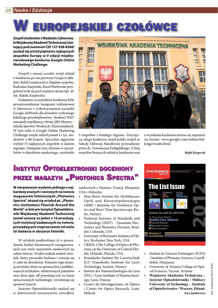 26 Nauka i Edukacja W europejskiej czołówce Zespół studentów z Wydziału Cybernetyki Wojskowej Akademii Technicznej (startujący pod numerem CID 137-928-8308) znalazł się wśród piętnastu najlepszych zespołów Europy w V edycji międzynarodowego konkursu Google Online Marketing Challenge. Zespół z naszej uczelni wziął udział w konkursie po raz pierwszy. Grupa w składzie: Rafał Lemancewicz (kapitan zespołu), Radosław Karpiński, Karol Pawłowski przygotowywała się pod czujnym okiem kpt. dr. inż. Rafała Kasprzyka. Zadaniem uczestników konkursu było przeprowadzenie kampanii reklamowej w Internecie z wykorzystaniem narzędzi Google AdWords dla dowolnie wybranego lokalnego przedsiębiorstwa. Studenci WAT nawiązali współpracę z firmą QRS Mazury – Szkołą Sportów Wodnych i Ekstremalnych. W tym roku w Google Online Marketing Challenge wzięło udział ponad 11 tys. studentów z 86 krajów. Specjalny algorytm wybrał 15 najlepszych zespołów w danym regionie. Następnie jury, złożone ze specjalistów w dziedzinie marketingu, wyróżniło 5 zespołów z każdego regionu. Zwycięzcą całego konkursu został polski zespół ze Szkoły Głównej Handlowej prowadzony przez dr. Tymoteusza Doligalskiego. Z listą zespołów biorących udział w konkursie oraz z wynikami konkursu można się zapoznać na stronie: www.google.com/onlinechallenge/results.html. Rafał Kasprzyk W sierpniowym wydaniu jednego z najbardziej znanych i cenionych na świecie magazynów fotonicznych „Photonics Spectra” ukazał się artykuł pt. „Photonics Institutions Flourish Around the World”, w którym Instytut Optoelektroniki Wojskowej Akademii Technicznej został uznany za jeden z 10 przodujących instytucji badawczych na świecie, prowadzących nieprzerwanie od wielu lat badania w obszarze fotoniki. W artykule podkreślono, iż w prowadzenie badań fotonicznych zaangażowanych jest wiele instytutów naukowych na całym świecie. Trudno jednak znaleźć ośrodek, który prowadzi badania i rozwija się w całej tej dziedzinie. Pomimo tego istnieją instytuty, które za sprawą ilości publikowanych artykułów, zdobywanych patentów oraz firm spin off powstających na bazie opracowanych technologii, wyróżniają się spośród innych. Instytut Optoelektroniki znalazł się w doborowym towarzystwie ośrodków naukowych z Niemiec, Francji, Hiszpanii, USA i Meksyku: • Max-Born-Institut für Nichtlineare Optik und Kurzzeitspektroskopie (MBI) / Institute for Nonlinear Optics and Short-Time Spectroscopy, Berlin, Niemcy • National Institute of Standards and Technology (NIST) – Quantum Electronics and Photonics Division, Boulder, Colorado, USA • University of Rochester Institute of Optics, Rochester, New York, USA • CREOL | The College of Optics & Photonics at the University of Central Florida, Orlando, Florida, USA • Fraunhofer-Institut für Lasertechnik ILT/ Fraunhofer Institute for Laser Technology, Aachen, Niemcy • Institut des Nanotechnologies de Lyon (INL) / Lyon Institute of Nanotechnology, Lyon, Francja • Centro de Investigaciones en Óptica / Center for Optics Research, León, Meksyk • Institut de Ciències Fotòniques (ICFO) / Institute of Photonic Sciences, Castelldefels, Hiszpania • University of Arizona College of Optical Sciences, Tucson, Arizona • Wojskowa Akademia Techniczna – Instytut Optoelektroniki / Military University of Technology – Institute of Optoelectronics / Warsaw, Poland. Ewa Jankiewicz Fot. Archiwum WCY WAT Instytut Optoelektroniki doceniony przez magazyn „Photonics Spectra”