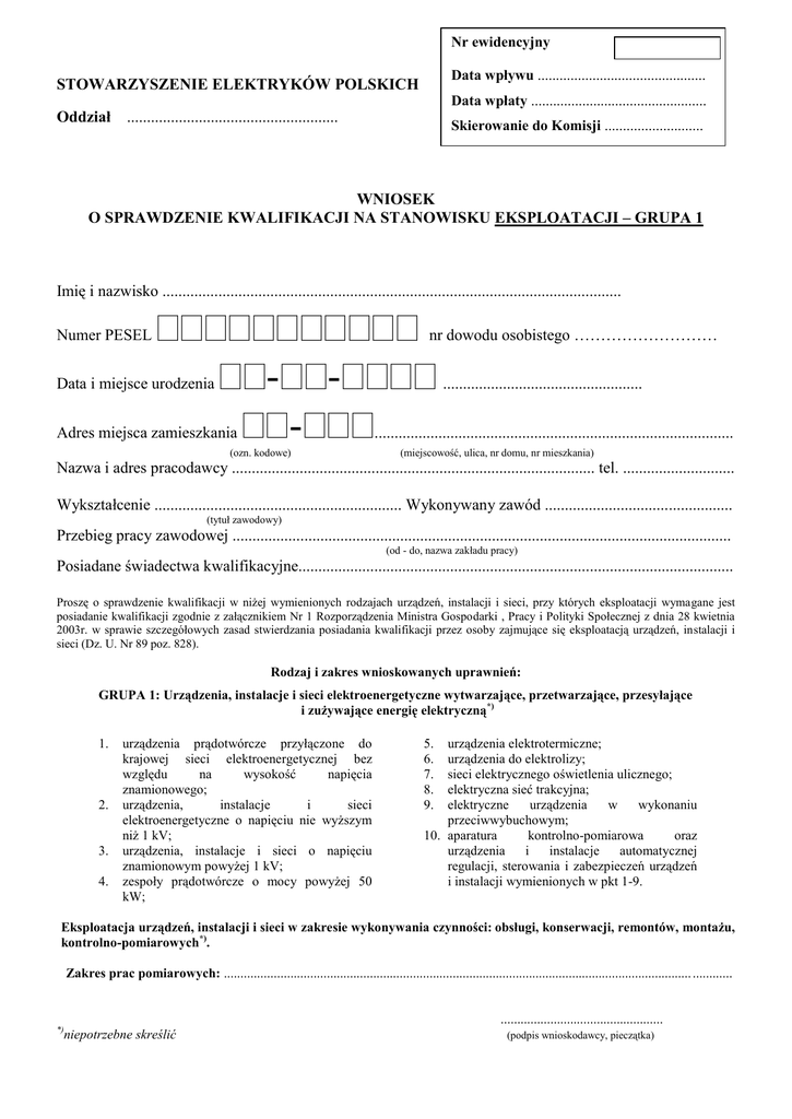 Nr ewidencyjny Data wpływu .............................................. STOWARZYSZENIE ELEKTRYKÓW POLSKICH Oddział Data wpłaty ................................................ ..................................................... Skierowanie do Komisji ........................... WNIOSEK O SPRAWDZENIE KWALIFIKACJI NA STANOWISKU EKSPLOATACJI – GRUPA 1 Imię i nazwisko ................................................................................................................... nr dowodu osobistego ……………………… Numer PESEL - Data i miejsce urodzenia - Adres miejsca zamieszkania (ozn. kodowe) .................................................. .......................................................................................... (miejscowość, ulica, nr domu, nr mieszkania) Nazwa i adres pracodawcy ........................................................................................... tel. ............................ Wykształcenie .............................................................. Wykonywany zawód ............................................... (tytuł zawodowy) Przebieg pracy zawodowej ............................................................................................................................. (od - do, nazwa zakładu pracy) Posiadane świadectwa kwalifikacyjne............................................................................................................. Proszę o sprawdzenie kwalifikacji w niżej wymienionych rodzajach urządzeń, instalacji i sieci, przy których eksploatacji wymagane jest posiadanie kwalifikacji zgodnie z załącznikiem Nr 1 Rozporządzenia Ministra Gospodarki , Pracy i Polityki Społecznej z dnia 28 kwietnia 2003r. w sprawie szczegółowych zasad stwierdzania posiadania kwalifikacji przez osoby zajmujące się eksploatacją urządzeń, instalacji i sieci (Dz. U. Nr 89 poz. 828). Rodzaj i zakres wnioskowanych uprawnień: GRUPA 1: Urządzenia, instalacje i sieci elektroenergetyczne wytwarzające, przetwarzające, przesyłające i zużywające energię elektryczną*) 1. 2. 3. 4. urządzenia prądotwórcze przyłączone do krajowej sieci elektroenergetycznej bez względu na wysokość napięcia znamionowego; urządzenia, instalacje i sieci elektroenergetyczne o napięciu nie wyższym niż 1 kV; urządzenia, instalacje i sieci o napięciu znamionowym powyżej 1 kV; zespoły prądotwórcze o mocy powyżej 50 kW; urządzenia elektrotermiczne; urządzenia do elektrolizy; sieci elektrycznego oświetlenia ulicznego; elektryczna sieć trakcyjna; elektryczne urządzenia w wykonaniu przeciwwybuchowym; 10. aparatura kontrolno-pomiarowa oraz urządzenia i instalacje automatycznej regulacji, sterowania i zabezpieczeń urządzeń i instalacji wymienionych w pkt 1-9. 5. 6. 7. 8. 9. Eksploatacja urządzeń, instalacji i sieci w zakresie wykonywania czynności: obsługi, konserwacji, remontów, montażu, kontrolno-pomiarowych*). Zakres prac pomiarowych: ............................................................................................................................................. ............ ................................................. *) niepotrzebne skreślić (podpis wnioskodawcy, pieczątka) ............................................, dnia .......................... ............................................ (pieczęć Komisji Kwalifikacyjnej) PROTOKÓŁ NR ................................................. z egzaminu sprawdzającego znajomość przepisów i zasad w zakresie eksploatacji na stanowisku EKSPLOATACJI ............................................................................................................................ (imię i nazwisko egzaminowanego) 1. Wynik egzaminu ze znajomości przepisów i zasad: Lp. Wyszczególnienie zakresu 1. 2. Zasady budowy, działania oraz warunki techniczne obsługi urządzeń, instalacji i sieci Zasady eksploatacji oraz instrukcje eksploatacji urządzeń, instalacji i sieci 3. Zasady i warunki wykonywania prac kontrolno-pomiarowych i montażowych 4. Zasady i wymagania bezpieczeństwa pracy i ochrony przeciwpożarowej oraz umiejętności udzielania pierwszej pomocy Instrukcje postępowania w razie awarii, pożaru lub innego zagrożenia bezpieczeństwa obsługi urządzeń lub zagrożenia życia, zdrowia i środowiska 5. Wynik 2. Wynik ogólny egzaminu: pozytywny – negatywny*) 3. W wyniku egzaminu stwierdzono, że egzaminowany spełnia (nie spełnia)*) wymagania kwalifikacyjne do wykonywania prac na stanowisku Eksploatacji w zakresie: obsługi, konserwacji, remontów, montażu, kontrolno-pomiarowym*) dla następujących rodzajów urządzeń, instalacji i sieci wymienionych we wniosku pod pozycją: .................................................................................................................................................................. .................................................................................................................................................................. .................................................................................................................................................................. .................................................................................................................................................................. .................................................................................................................................................................. Zakres uprawnień pomiarowych .............................................................................................................. .................................................................................................................................................................. 4. Wydano świadectwo nr ............................................ ważne do dnia ……………………… 5. Sprawdzono tożsamość: P
