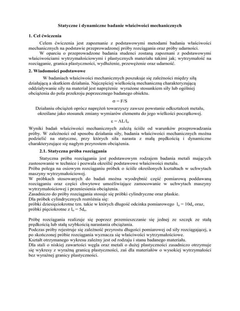 Statyczne i dynamiczne badanie właściwości mechanicznych 1. Cel ćwiczenia Celem ćwiczenia jest zapoznanie z podstawowymi metodami badania właściwości mechanicznych na podstawie przeprowadzonej próby rozciągania oraz próby udarności. W oparciu o przeprowadzone badania studenci zostaną zapoznani z podstawowymi właściwościami wytrzymałościowymi i plastycznych materiału takimi jak; wytrzymałość na rozciąganie, granica plastyczności, wydłużenie, przewężenie oraz udarność. 2. Wiadomości podstawowe W badaniach właściwości mechanicznych poszukuje się zależności między siłą działającą a skutkiem działania. Najczęściej wielkością mechaniczną charakteryzującą oddziaływanie siły na materiał jest naprężenie wyrażone stosunkiem siły lub ogólniej obciążenia do pola przekroju poprzecznego badanego obiektu. = F/S Działaniu obciążeń oprócz naprężeń towarzyszy zawsze powstanie odkształceń metalu, określane jako stosunek zmiany wymiarów elementu do jego wielkości początkowej. = L/lo Wyniki badań właściwości mechanicznych zależą ściśle od warunków przeprowadzania próby. W zależności od sposobu działania siły, badania właściwości mechanicznych można podzielić na statyczne, przy których siła narasta z małą prędkością i dynamiczne charakteryzujące się nagłym przyrostem obciążenia. 2.1. Statyczna próba rozciągania Statyczna próba rozciągania jest podstawowym rodzajem badania metali mających zastosowanie w technice i pozwala określić podstawowe właściwości metalu. Próba polega na osiowym rozciąganiu próbek o ściśle określonych kształtach w uchwytach maszyny wytrzymałościowej. W próbkach stosowanych do badań można wyodrębnić część pomiarową poddawaną rozciąganiu oraz części chwytowe umożliwiające zamocowanie w uchwytach maszyny wytrzymałościowej i przeniesienia obciążenia. Zasadniczo do próby rozciągania stosuje się próbki cylindryczne oraz płaskie. Dla próbek cylindrycznych rozróżnia się: próbki dziesięciokrotne tzn. takie w których długość odcinka pomiarowego lo = 10do oraz, próbki pięciokrotne z lo = 5do. Próbę rozciągania realizuje się poprzez przemieszczanie się jednej ze szczęk ze stałą prędkością lub stałą szybkością narastania obciążania. Podczas próby rejestruje się zależność przyrostu długości pomiarowej od siły rozciągającej, a po skończonej próbie rozciągania wyznacza się właściwości wytrzymałościowe. Kształt otrzymanego wykresu zależny jest od rodzaju i stanu badanego materiału. Dla stali o niskiej zawartości węgla oraz metali o dużej plastyczności zasadniczo otrzymuje się wykresy z wyraźną granicą plastyczności, zaś dla materiałów o wysokiej wytrzymałości bez wyraźnej granicy plastyczności. Wykres z wyraźną granicą plastyczności Fm FeH Obciążenie [kN] FeL dl Wydłużenie dl [mm] Od chwili przyłożenia obciążenia wydłużenie próbki rośnie wprost proporcjonalnie do siły obciążającej aż do osiągnięcia tzw. granicy proporcjonalności (sprężystości) prop. Po przekroczeniu granicy proporcjonalności obserwowany jest wyraźny przyrost wydłużenia próbki przy stałym lub wahającym się poziomie siły obciążającej. Odpowiada to granicy plastyczności Re. Przy dalszym wzroście wydłużenia następuje przyrost siły ale już nie w sposób proporcjonalny jak dla zakresu odkształceń sprężystych. W chwili osiągnięcia wartości maksymalnej siły - Fm, powstaje lokalne przewężenie próbki, zwane szyjką. Jest to przyczyną powolnego spadku siły. W końcowym momencie próby próbka ulega zerwaniu. Po zerwaniu próbki mierzona jest długość odcinka pomiarowego oraz wymiary lokalnego przewężenia (szyjki). W oparciu o otrzymany wykres określamy następujące właściwości: Wytrzymałość na rozciąganie jako naprężenie odpowiadające maksymalnej sile Fm otrzymanej w czasie próby rozciągania odniesione do przekroju poprzecznego próbki So: Rm = Fm/So Granicę plastyczności jako naprężenie w próbce, przy osiągnięciu którego następuje występuje wyraźny wzrost wydłużenia przy ustalonej lecz nieznacznie zmieniającej się sile rozciągającej Fe: Re = Fe/So, Ze względu na zmianę naprężenia w zakresie granicy plastyczności wyodrębnia się górną granicę plastyczności ReH i dolną granicę plastyczności ReL ReH – naprężenie przy którym następuje pierwszy spadek siły, ReL – najmniejsze naprężenie podczas płynięcia. Wydłużenie względne Ap jako stosunek trwałego wydłużenia bezwzględnego próbki po rozerwaniu do długości pomiarowej próbki A = dL/Lo = (L0 - Lo)/Lo Względne przewężenie próbki jako zmniejszenie przekroju poprzecznego próbki w miejscu rozerwania próbki w odniesieniu do pola powierzchni jej pierwotnego przekroju. Z = (Ao - Ak)/Ao Wykres bez wyraźnej granicy plastyczności F0, Obciązenie [kN] 2 0,2 % Wydłużenie [mm] Dla materiałów które charakteryzują się brakiem występowania wyraźnej granicy plastyczności wyznacza się tzw.: Umowną granicę plastyczności R0,2, określaną jako naprężenie, które powoduje trwałe odkształcenie plastyczne wynoszące 0,2 % długości początkowej odcinka pomiarowego. R0,2 = F0,2/So 2.2. Próba udarności Próba udarności jest najprostszą metodą badania odporności na pękanie. Próba polega na złamaniu jednym uderzeniem spadającego młota wahadłowego, próbki z karbem w środku i podpartej na oporach. Do próby łamania stosowane są znormalizowane próbki o przekroju kwadratowym 10 x 10 mm z w połowie naniesionym karbem w: kształcie litery V - o kącie 45 i głębokości 2 mm, kształcie litery U – o szerokości 2 mm, głębokości 2 mm i promieniu dna karbu 1 mm. Energia potencjalna wahadła W wychylonego na wysokości H, przy jego swobodnym spadku zostaje zamieniona na energię kinetyczną, przy łamaniu próbki część energii jest zużyta na prac