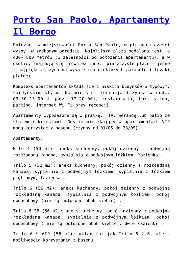 Porto San Paolo, Apartamenty Il Borgo Położne w miejscowości Porto San Paolo, w płn-wsch części wyspy, w zadbanym ogrodzie. Najbliższa plaża oddalona jest o 400- 800 metrów (w zależności od położenia apartamentu), a w okolicy znajdują się również inne, piaszczyste plaże – jedne z najpiękniejszych na wyspie (na niektórych parasole i leżaki płatne). Kompleks apartamentów składa się z niskich budynków w typowym, sardyńskim stylu. Na miejscu: recepcja (czynna w godz. 09.30-13.00 i godz. 17-20.00), restauracja, bar, sklep, parking, internet Wi Fi przy recepcji. Apartamenty wyposażone są w pralkę, TV, werandę lub patio ze stołem i krzesłami. Goście mieszkający w apartamentach VIP mogą korzystać z basenu (czynny od 01/06 do 28/09). Apartamenty: Bilo 4 (50 m2): aneks kuchenny, pokój dzienny z podwójną rozkładaną kanapą, sypialnia z podwójnym łóżkiem, łazienka . Trilo 5 (52 m2): aneks kuchenny, pokój dzienny z rozkładaną kanapą, sypialnia z podwójnym łóżkiem, sypialnia z łóżkiem piętrowym, łazienka . Trilo 6 (56 m2): aneks kuchenny, pokój dzienny z podwójną rozkładaną kanapą, sypialnia z podwójnym łóżkiem, pokój dwuosobowy (nie są położone obok siebie) . Trilo 6 2B (56 m2): aneks kuchenny, pokój dzienny z podwójną rozkładaną kanapą, sypialnia z podwójnym łóżkiem, pokój dwuosobowy ( nie są położone obok siebie), dwie łazienki . Trilo 6 * VIP (56 m2): układ tak jak Trilo 6 2 B, ale z możliwością korzystania z basenu. 12/04 – 31/05 13/09 – 18/10 31/05 – 14/06 06/09 – 13/09 14/06 – 21/06 30/08 – 06/09 Bilo4 2190 2645 3265 3675 3925 4710 5740 6485 Trilo5 2645 2935 3720 4090 4420 5290 6400 7020 Trilo6 2935 3385 4005 4420 4725 5740 6895 7350 Trilo 6 2B 3305 3760 4380 4875 5285 6360 7270 7975 3510 4380 4875 5285 5700 6815 7640 8840 21/06 – 05/07 05/07 – 26/07 23/08 – 30/08 26/07 – 02/08 02/08 – 09/08 16/08 – 23/08 09/08 – 16/08 Trilo 6 2B VIP Cena w PLN obejmuje: wynajęcie apartamentu na 7 nocy, opłatę za wodę, prąd i gaz, końcowe sprzątanie (sprzątanie kuchni w zakresie gości, jeżeli nie zostanie opłata 50 Euro). Cena nie obejmuje: kaucji zwrotnej 200 Euro. Pościel 10 Euro/zmiana. Ręczniki 15 Euro/zmiana. Ręczniki kąpielowe 5 Euro/ręcznik. Pittulongu, Alessandro**** Hotel Położony na wzgórzu, ze wspaniałym widokiem na Zatokę Olbia, z dużym basenem w pięknym ogrodzie ze śródziemnomorską roślinnością. W pobliżu hotelu znajduje się m.in. Olbia – miasto tętniące życiem, Zatoka Aranci, słynna Costa Smeralda (Wybrzeże Szmaragdowe) z Porto Rotondo, do którego przybijają najdroższe jachty świata, plaża Pittulongu (z drobnym piaskiem), do której hotel zapewnia bezpłatny transfer (ok 1 km). Do dyspozycji gości: recepcja, 2 windy, 2 bary (przy basenie i wewnątrz), restauracja z tarasem z panoramicznym widokiem, lobby, bezpłatne Wi Fi na terenie całego hotelu, basen z leżakami i parasolami, jacuzzi, plac zabaw dla dzieci, pralnia, wypożyczalnia samochodów, mini club, sala konferencyjna (do max 50 os). Pokoje są przestronne, niektóre z widokiem panoramicznym, urządzone w typowym stylu dla Sardynii, z prostymi i eleganckimi elementami rękodzieła. Standard: elegancko urządzone, pokoje jedno, dwu i trzyosobowe, klimatyzacja, mini bar, Tv, telefon, Wi Fi, łazienka z prysznicem do hydromasażu, suszarka do włosów. Junior Suite: przestronne, mogą pomieścić od dwóch do czterech osób, z balkonem, klimatyzacją, minibarem, Tv, telefonem, Wi Fi, sejfem, łazienką z prysznicem i hydromasażem, suszarką do włosów. Wyżywienie: śniadanie w formie bufetu, obiady i kolacje serwowane, bufet sałatek, warzyw, owoców i deserów. W tygodniu dwie typowe sardyńskie kolacje, jedna z owocami morza, druga mięsna. Na życzenie (złożone podczas rezerwacji), możliwa kuchnia wegetariańska. 18/04–31/05 31/05–14/06 13/09–25/10 06/09–13/09 14/06–28/06 28/06–19/07 19/07– 26/07–02/08 30/08–06/09 26/07 23/08–30/08 02/08–09/08 09/08–23/08 Osoba w pokoju 2os 260 310 345 395 435 460 505 575 310 355 395 460 505 525 575 665 osoba w pokoju Junior Suite Cena w PLN obejmuje: nocleg osoby w pokoju, śniadania- bufet, kolacja-danie serwowane, bufet sałatek, owoców i deserów. Cena nie obejmuje: dopłata za widok na morze 12 Euro/osoba/doba, dopłata do FB 24 Euro/osoba/dzień, dzieci 3-12 lat 12 Euro/doba. Uwaga: dostawka dla dziecka 6-12 lat 50%, dostawka dla osoby dorosłej 30%. Baia Sardinia, Hotel Club Li Graniti**** Hotel położony jest na Costa Smeralda (Wybrzeże Szmaragdowe) w miejscowości Pulicinu, na wzgórzu z pięknym widokiem na zatokę, w typowym, śródziemnomorskim ogrodzie. Ta spokojna oaza położona jest w pobliżu znanych kurortów Baja Sardinia (2 km) i Porto Cervo (6 km). Piaszczysta plaża Cala dei Ginepri znajduje się 2 km od hotelu (bezpłatny transport), w pobliżu są również inne, piękne, piaszczyste plaże, jak Cala Battistoni, Cala Bitta, Cala Granu czy Cala Arzachena. Hotel posiada szerokie, panoramiczne tarasy, z których rozpościera się widok na malownicze, granitowe skały i szmaragdowe wody Costa Smeralda. Do dyspozycji gości: recepcja, hall, winda, bar, restauracja, Tv, basen, taras do opalania, strefa wellness (masaże i zabiegi upiększające), kącik do czytania, gry planszowe, plac zabaw dla dzieci, sejf w recepcji, siłownia, sala konferencyjna, pralnia, strefa Wi Fi. Pokoje: komfortowo urządzone w tradycyjnym, lokalnym stylu, przy zastosowaniu materiałów miejscowego rękodzieła. Pokoje z 2, 3, 4 łóżkami (rozkładana kanapa z łóżkiem piętrowym), łazienka z prysznicem, klimatyzacja (ogrzewanie), telefon, Tv, suszarka do włosów, mini bar, ekspres do kawy, czajnik, niektóre z balkonem lub z patio. Możliwość dostawki dla dziecka. Wyżywienie: śniadanie w formie bufetu, obiady i kolacje (danie główne serwowane do stolika, dodatki, przystawki i desery w formie bufetu). Trad