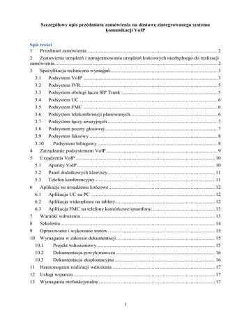 Szczegółowy opis przedmiotu zamówienia na dostawę zintegrowanego systemu komunikacji VoIP Spis treści 1 Przedmiot zamówienia ....................................................................................................... 2 2 Zestawienie urządzeń i oprogramowania urządzeń końcowych niezbędnego do realizacji zamówienia................................................................................................................................. 2 Specyfikacja techniczna wymagań ..................................................................................... 3 3 3.1 Podsystem VoIP .......................................................................................................... 3 3.2 Podsystem IVR. ........................................................................................................... 5 3.3 Podsystem obsługi łącza SIP Trunk ............................................................................ 5 3.4 Podsystem UC ............................................................................................................. 6 3.5 Podsystem FMC .......................................................................................................... 6 3.6 Podsystem telekonferencji planowanych ..................................................................... 6 3.7 Podsystem łączy awaryjnych ....................................................................................... 7 3.8 Podsystem poczty głosowej ......................................................................................... 7 3.9 Podsystem faksowy ..................................................................................................... 8 3.10 Podsystem bilingowy ............................................................................................... 8 4 Zarządzanie podsystemem VoIP ........................................................................................ 9 5 Urządzenia VoIP .............................................................................................................. 10 5.1 Aparaty VoIP ............................................................................................................. 10 5.2 Panel dodatkowych klawiszy..................................................................................... 11 5.3 Telefon konferencyjny ............................................................................................... 11 Aplikacje na urządzenia końcowe .................................................................................... 12 6 6.1 Aplikacja UC na PC .................................................................................................. 12 6.2 Aplikacja wideophone na tablety .............................................................................. 12 6.3 Aplikacja FMC na telefony komórkowe/smartfony. ................................................. 13 7 Warunki wdrożenia .......................................................................................................... 13 8 Szkolenia .......................................................................................................................... 14 9 Opracowanie i wykonanie testów..................................................................................... 15 10 Wymagania w zakresie dokumentacji .............................................................................. 15 10.1 Projekt wdrożeniowy ............................................................................................. 15 10.2 Dokumentacja powykonawcza .............................................................................. 16 10.3 Dokumentacja eksploatacyjna ............................................................................... 16 11 Harmonogram realizacji wdrożenia ................................................................................. 17 12 Usługi wsparcia ................................................................................................................ 17 13 Wymagania niefunkcjonalne ............................................................................................ 17 1 1 Przedmiot zamówienia Przedmiotem zamówienia jest dostawa i wdrożenie zintegrowanego systemu komunikacji VoIP (zwanego dalej Systemem VoIP) dla potrzeb Polskiej Akademii Nauk w siedzibie głównej - Pałac Kultury i Nauki, Plac Defilad 1, 00-901 Warszawa (dalej „Siedziba”) Wszystkie urządzenia powinny być skonfigurowane w taki sposób, aby Zamawiający mógł samodzielnie zainstalować część z nich w oddziałach w Gdańsku, Katowicach, Krakowie, Lublinie, Łodzi, Poznaniu i we Wrocławiu. W każdym oddziale przewiduje się instalację ok. 5 aparatów VoIP. Przedmiot zamówienia obejmuje: 1. Dostawę, uruchomienie i wdrożenie podsystemu VoIP. 2. Dostawę, uruchomienie i wdrożenie podsystemu zapowiedzi słownych IVR. 3. Dostawę, uruchomienie i wdrożenie podsystemu obsługi łącza SIP Trunk. 4. Dostawę podsystemu zunifikowanej komunikacji UC. 5. Dostawę, uruchomienie i wdrożenie podsystemu konwergencji stacjonarno – ruchomej FMC. 6. Dostawę, uruchomienie i wdrożenie podsystemu telekonferencji planowanych. 7. Dostawę, uruchomienie i wdrożenie podsystemu łączy awaryjnych. 8. Dostawę, uruchomienie i wdrożenie podsystemu poczty głosowej. 9. Dostawę, uruchomienie i wdrożenie podsystemu faksowego. 10. Dostawę, uruchomienie i wdrożenie podsystemu bilingowego. 11. Dostawę, uruchomienie i wdrożenie licencji użytkowników końcowych oraz terminali końcowych. 12. Dostawę, uruchomienie i wdrożenie licencji aplikacji UC na PC. 13. Dostawę, uruchomienie i wdrożenie licencji aplikacji wideophone na tablety. 14. Dostawę, uruchomienie i wdrożenie licencji aplikacji FMC na telefony komórkowe i smartfony. 15. Integrację działania wszystkich komponentów Systemu VoIP oraz infrastruktury teleinformatycznej. 16. Przeprowadzenie szkoleń dla administratorów Zam