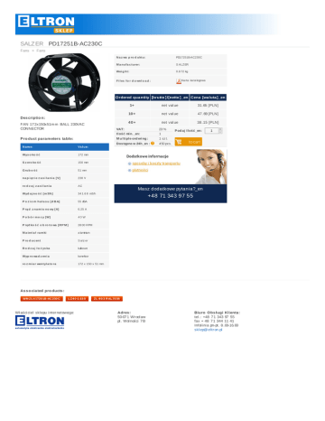 SALZ ERPD17251B-AC230C Fans > Fans N a z wa p ro d u ktu : PD17251B-AC230C M a n u fa c tu rer: S ALZ ER Wei g h t: 0.8 72kg Ka rta ka ta logowa F i l es fo rd o wn l o a d : O rderedqua ntity [brutto ] /[netto ] _en Cena [wa luta ] _en Des criptio n: FAN17 2x150x51m m BALL230VAC CONNECTOR P ro ductpa ra m eters ta ble: N a m e: Va l u e: Wys o ko ś ć 172mm S z ero ko ś ć 150mm Gru b o ś ć 51mm n a p i ęc i ez a s i l a n i a [V] 230V ro d z a j z a s i l a n i a AC Wyd a j n o ś ć [m 3/h ] 34 1.6 8 m3/h P o z i o m h a ł a s u [d B A] 55dBA P rą d z n a m i o n o wy[A] 0.25A P o b ó rm o c y[W] 4 0W P ręd ko ś ć o b ro to wa [R P M ] 28 00RPM M a teri a ł ra m ki a luminium P ro d u c en t S a lz er R o d z a j ł o ż ys ka kulkowe Wyp ro wa d z en i a konektor ro z m i a rwen tyl a to ra 172x150x51mm 1+ netval ue 31.65[PLN] 10 + netval ue 47 .69[PLN] 40+ netval ue 38 .15[PLN] VAT: Ilośćmin._en: M u ltipleord ering : 23% 1 1sz t. Dostępnew24h_en: 450pcs. Pod ajIlość_en: 1 + - tocart Maszdodatkowepytania?_en +48713439755 As s o cia tedpro ducts : WM Z L 4 1725 1B -AC 230 C L Z 4 0 -1-15 0 Wł aści ci el skl epui nter netowego: Z L -8 0 3R AL 70 35 Adres : 50-07 1Wr ocł aw pl .Wol ności 7 B Biuro O bs ługiKlienta : tel .:+48 7 134397 55 fax+48 7 13441141 Infol i ni apn-pt.8 .00-16.00 skl ep@ el tr on.pl