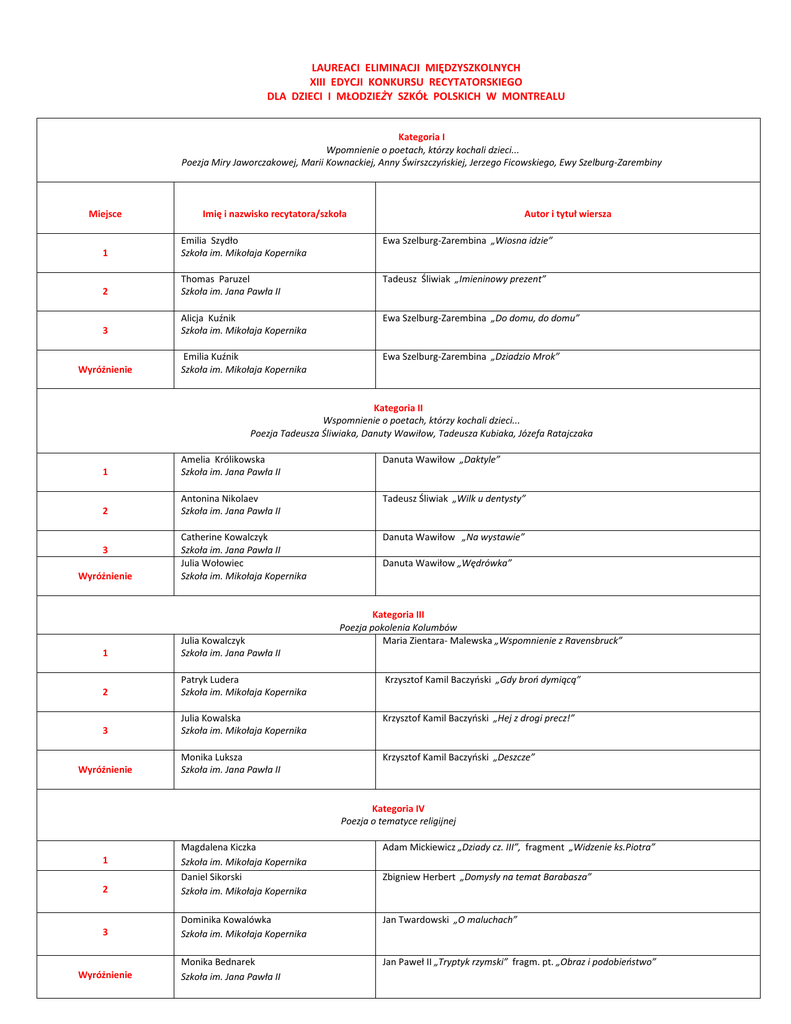 LAUREACI ELIMINACJI MIĘDZYSZKOLNYCH XIII EDYCJI KONKURSU RECYTATORSKIEGO DLA DZIECI I MŁODZIEŻY SZKÓŁ POLSKICH W MONTREALU Kategoria I Wpomnienie o poetach, którzy kochali dzieci... Poezja Miry Jaworczakowej, Marii Kownackiej, Anny Świrszczyoskiej, Jerzego Ficowskiego, Ewy Szelburg-Zarembiny Miejsce Autor i tytuł wiersza Imię i nazwisko recytatora/szkoła Emilia Szydło Szkoła im. Mikołaja Kopernika Ewa Szelburg-Zarembina „Wiosna idzie” 1 Thomas Paruzel Szkoła im. Jana Pawła II Tadeusz Śliwiak „Imieninowy prezent” 2 Alicja Kuźnik Szkoła im. Mikołaja Kopernika Ewa Szelburg-Zarembina „Do domu, do domu” 3 Emilia Kuźnik Szkoła im. Mikołaja Kopernika Ewa Szelburg-Zarembina „Dziadzio Mrok” Wyróżnienie Kategoria II Wspomnienie o poetach, którzy kochali dzieci... Poezja Tadeusza Śliwiaka, Danuty Wawiłow, Tadeusza Kubiaka, Józefa Ratajczaka Amelia Królikowska Szkoła im. Jana Pawła II Danuta Wawiłow „Daktyle” 1 Antonina Nikolaev Szkoła im. Jana Pawła II Tadeusz Śliwiak „Wilk u dentysty” 2 Catherine Kowalczyk Szkoła im. Jana Pawła II Julia Wołowiec Szkoła im. Mikołaja Kopernika Danuta Wawiłow „Na wystawie” 3 Wyróżnienie Danuta Wawiłow „Wędrówka” Kategoria III Poezja pokolenia Kolumbów Maria Zientara- Malewska „Wspomnienie z Ravensbruck” 1 Julia Kowalczyk Szkoła im. Jana Pawła II Patryk Ludera Szkoła im. Mikołaja Kopernika Krzysztof Kamil Baczyoski „Gdy broo dymiącą” 2 Julia Kowalska Szkoła im. Mikołaja Kopernika Krzysztof Kamil Baczyoski „Hej z drogi precz!” 3 Monika Luksza Szkoła im. Jana Pawła II Krzysztof Kamil Baczyoski „Deszcze” Wyróżnienie Kategoria IV Poezja o tematyce religijnej Adam Mickiewicz „Dziady cz. III”, fragment „Widzenie ks.Piotra” 2 Magdalena Kiczka Szkoła im. Mikołaja Kopernika Daniel Sikorski Szkoła im. Mikołaja Kopernika Dominika Kowalówka Szkoła im. Mikołaja Kopernika Jan Twardowski „O maluchach” 3 Monika Bednarek Szkoła im. Jana Pawła II Jan Paweł II „Tryptyk rzymski” fragm. pt. „Obraz i podobieostwo” 1 Wyróżnienie Zbigniew Herbert „Domysły na temat Barabasza”