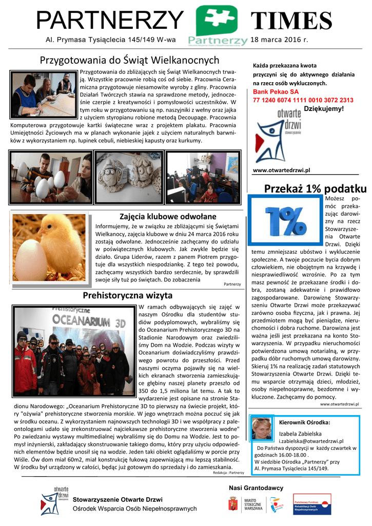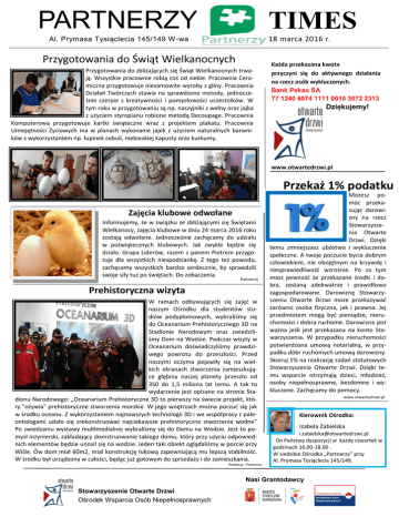 TIMES PARTNERZY Al. Prymasa Tysiąclecia 145/149 W -wa 18 marca 2016 r. Przygotowania do Świąt Wielkanocnych Przygotowania do zbliżających się Świąt Wielkanocnych trwają. Wszystkie pracownie robią coś od siebie. Pracownia Ceramiczna przygotowuje niesamowite wyroby z gliny. Pracownia Działań Twórczych stawia na sprawdzone metody, jednocześnie czerpie z kreatywności i pomysłowości uczestników. W tym roku w przygotowaniu są np. naszyjniki z wełny oraz jajka z użyciem styropianu robione metodą Decoupage. Pracownia Komputerowa przygotowuje kartki świąteczne wraz z projektem plakatu. Pracownia Umiejętności Życiowych ma w planach wykonanie jajek z użyciem naturalnych barwników z wykorzystaniem np. łupinek cebuli, niebieskiej kapusty oraz kurkumy. Każda przekazana kwota przyczyni się do aktywnego działania na rzecz osób wykluczonych. Bank Pekao SA 77 1240 6074 1111 0010 3072 2313 Dziękujemy! www.otwartedrzwi.pl Przekaż 1% podatku Zajęcia klubowe odwołane Informujemy, że w związku ze zbliżającymi się Świętami Wielkanocy, zajęcia klubowe w dniu 24 marca 2016 roku zostają odwołane. Jednocześnie zachęcamy do udziału w poświątecznych klubowych. Jak zwykle będzie się działo. Grupa Liderów, razem z panem Piotrem przygotuje dla wszystkich niespodziankę. Z tego też powodu, zachęcamy wszystkich bardzo serdecznie, by sprawdzili swoje siły tuż po świętach. Do zobaczenia Partnerzy Prehistoryczna wizyta W ramach odbywających się zajęć w naszym Ośrodku dla studentów studiów podyplomowych, wybraliśmy się do Oceanarium Prehistorycznego 3D na Stadionie Narodowym oraz zwiedziliśmy Dom na Wodzie. Podczas wizyty w Oceanarium doświadczyliśmy prawdziwego powrotu do przeszłości. Przed naszymi oczyma pojawiły się na wielkich ekranach stworzenia zamieszkujące głębiny naszej planety przeszło od 350 do 1,5 miliona lat temu. A tak to wydarzenie jest opisane na stronie Stadionu Narodowego: „Oceanarium Prehistoryczne 3D to pierwszy na świecie projekt, który "ożywia" prehistoryczne stworzenia morskie. W jego wnętrzach można poczuć się jak w środku oceanu. Z wykorzystaniem najnowszych technologii 3D i we współpracy z paleontologami udało się zrekonstruować najciekawsze prehistoryczne stworzenia wodne" Po zwiedzaniu wystawy multimedialnej wybraliśmy się do Domu na Wodzie. Jest to pomysł inżynierski, zakładający skonstruowanie takiego domu, który przy użyciu odpowiednich elementów będzie unosił się na wodzie. Jeden taki obiekt oglądaliśmy w porcie przy Wiśle. Ów dom miał 60m2, miał konstrukcję łukową zapewniającą mu lepszą stabilność. W środku był urządzony w całości, będąc już gotowym do sprzedaży i do zamieszkania. Redakcja : Partnerzy Możesz pomóc przekazując darowizny na rzecz Stowarzyszenia Otwarte Drzwi. Dzięki temu zmniejszasz ubóstwo i wykluczenie społeczne. A twoje poczucie bycia dobrym człowiekiem, nie obojętnym na krzywdę i niesprawiedliwość wzrośnie. Po za tym masz pewność że przekazane środki i dobra, zostaną adekwatnie i prawidłowo zagospodarowane. Darowiznę Stowarzyszeniu Otwarte Drzwi może przekazywać zarówno osoba fizyczna, jak i prawna. Jej przedmiotem mogą być pieniądze, nieruchomości i dobra ruchome. Darowizna jest ważna jeśli jest przekazana na konto Stowarzyszenia. W przypadku nieruchomości potwierdzona umową notarialną, w przypadku dóbr ruchomych umową darowizny. Skieruj 1% na realizację zadań statutowych Stowarzyszenia Otwarte Drzwi. Dzięki temu wsparcie otrzymają dzieci, młodzież, osoby niepełnosprawne, bezdomne i wykluczone. Zachęcamy do pomocy. www.otwartedrzwi.pl Kierownik Ośrodka: Izabela Zabielska [email protected] Do Państwa dyspozycji w każdy czwartek w godzinach 16.00-18.00 . W siedzibie Ośrodka „Partnerzy” przy Al. Prymasa Tysiąclecia 145/149. Nasi Grantodawcy Stowarzyszenie Otwarte Drzwi Ośrodek Wsparcia Osób Niepełnosprawnych Anatomia komputera Wizyta w teatrze TR Warszawa W ostatni czwartek wybraliśmy się z wizytą do Teatru TR Warszawa mieszczącego się przy ulicy Marszałkowskiej 8. Teatr TR Warszawa, niegdyś znany pod nazwą Teatr Rozmaitości to samorządowa instytucja kultury. Jego początki sięgają końca lat 30-tych XX wieku. Dzięki programowi Edukacja w TR Warszawa, mieliśmy okazję zobaczyć jak wygląda życie teatralne za tzw. kulis. A o teatrze opowiadała i oprowadzała nas pani Anna Rochowska - kierowniczka działu edukacji TR Warszawa. Zwiedziliśmy miejsca, po których poruszają się aktorzy, garderobę, obie sceny, miejsce, które służy do odpoczynku i przygotowania się do roli. Dowiedzieliśmy się, kim jest i jaką rolę pełni inspicjent oraz jak wygląda jego miejsce pracy. Wizyta w teatrze z pewnością należała do bardzo udanych, a dzięki Pani Annie, dowiedzieliśmy się wielu ciekawych rzeczy o tym wyjątkowym i niepowtarzalnym miejscu, jakim jest teatr TR Warszawa. m Dzisiaj na zajęciach w pracowni komputerowej uczyliśmy się anatomii. Nie była to co prawda anatomia związana z biologią, a z elektroniczną stroną sprzętu komputerowego. Porównaliśmy komputer do organizmu ludzkiego. Tak jak człowiek, który posiada organy niezbędne do życia, tak komputer posiada w swoim wnętrzu części, bez których nie byłby w stanie pracować. Uczyliśmy się zdejmować obudowę, odkręcaliśmy śrubki oraz wyjmowaliśmy poszczególne elementy i uczyliśmy się ich ponownego montażu. Partnerzy Redakcja : Partnerzy Wielkanocna rolada schabowa z szpinakiem i jajkiem To doskonały pomysł na danie Wielkanocne oraz interesująca propozycja na świąteczne śniadanie lub obiad, zważywszy na tradycyjne składniki. Danie najlepiej smakuje z sosem chrzanowym bądź śmietanowym. Składniki : 1kg schabu, 25 dag mielonego, 45 dag mrożonego szpinaku (rozdrobnionego), 4 jajka, kromka chleba, 2-3 ząbki czosnku, sól, pieprz, tłuszcz do smażenia. Sposób przygotowania : Mięso prze