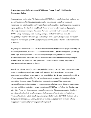 Braterstwo broni: Laboratoire AGIT’ART oraz Tenq w latach 90. XX wieku Clémentine Deliss Na początku, w połowie lat 70., Laboratoire AGIT’ART stanowiło luźną, nieformalną grupę kobiet i mężczyzn. Nie istniała żadna formalna organizacja, nie było prezesa ani sekretarza, ani ustalonych kryteriów członkostwa. Zamiast tego ludzi po prostu zapraszało się na spotkanie. Spotkania te przybierały formę pracowni lub warsztatu. Z początku odbywały się za zamkniętymi drzwiami. Pierwsze warsztaty teatralne miały miejsce w 1974 r. w Cap Manuel, a potem o wiele później na podwórku Gérarda Cheneta, senegalskiego pisarza i dramaturga haitańskiego pochodzenia. Odbywały się również w miejscach publicznych, np. w Musée Dynamique albo na scenie w Centre Culturel Français w Dakarze. Na początku Laboratoire AGIT’ART było połączone z eksperymentalną grupą teatralną Les Tréteaux (dosłownie: „podpórki” lub „drewniane koziołki”), prowadzoną przez śp. Yussufę Johna. Jego trupa oferowała antidotum na oficjalne produkcje teatralne Teatru Narodowego Daniel Sorano w Dakarze, skoncentrowane wokół Aimé Césairego i innych orędowników idei négritude. Następnie, teatr i sztuki wizualne zostały połączone z pojęciem szaleństwa, dewiacji i fałszu. Jednak specyficzne, interdyscyplinarne podejście Laboratoire AGIT’ART, które scaliło jego sojusz ze sztukami wizualnymi, miało swój początek de facto w Tenq ‒ przestrzeni projektowej prowadzonej przeze mnie w pierwszej Village des Arts na początku lat 80. XX w. W tamtym czasie Tenq odsłonił przed nami, artystami, powiązania istniejące między wszystkimi formami sztuki. Mieliśmy tam pracownie, prowadziliśmy warsztaty, stworzyliśmy nawet stację radiową ‒ swego rodzaju mówione pismo. Kiedy wyrzucono nas stamtąd w 1983, przenieśliśmy nasze warsztaty AGIT’ART na podwórko Issy Samba przy ulicy Jules Ferry, aby kontynuować nasze eksperymenty. Od samego początku Issa Samb nie odgrywał roli artysty sztuk plastycznych, lecz raczej filozofa, pisarza i agitatora. Przez blisko dziesięć lat nie działo się nic więcej w Laboratoire AGIT’ART. Stało się tak w dużej mierze dlatego, że poszczególne osoby chciały zdobyć uznanie za swoje własne osiągnięcia i tożsamość grupowa przestała się liczyć. El Hadji Sy, listopad 20131 Kolektywy artystów często zdobywają mistyczny status, chociaż w rzeczywistości rzadko kiedy potrafią przetrwać próbę czasu. Nieporozumienia i konflikty, a także przypadkowe okoliczności, mogą prowadzić do rozbieżności wśród osób, które wcześniej dzieliły wspólne ideały. Przyczyna odejścia z kolektywu może być banalna, czasem ludzie po prostu chcą „iść do przodu”, zająć się czymś innym. Może to też wynikać z mieszanki pasji i wrogości, które są częścią każdej dynamicznej, eksperymentalnej praktyki. Podobnie, narracja na temat kolektywu zmienia się w zależności od tego, czyj głos przeważa w danym momencie. Dlatego też opinia przedstawiona poniżej jest siłą rzeczy subiektywna i stronnicza. Wynika z moich osobistych kontaktów z przyszłymi artystami, filozofami, pisarzami i politykami, którzy mieszkali i pracowali w Dakarze w latach 90. Wśród nich należy wymienić Laboratoire AGIT’ART ‒ grupę, której sama byłam członkiem od 1995 r.; a także Tenq2 i Huit Facettes3 ‒ dwie ważne inicjatywy prowadzone przez artystów i, podobnie jak Laboratoire AGIT’ART, opierające się głównie na pracy kuratorskiej Ela Hadjiego Sy. W tamtym czasie, moje zaangażowanie w te kolektywy polegało na rozszerzonej praktyce, wykraczającej poza organizowanie wystaw.4 Można wręcz powiedzieć, że wystawy tych Rozmowa z autorką, listopad 2013. Tenq w języku Wolof oznacza staw skokowy, przegub lub punkt połączenia, zaś w tym kontekście można go rozumieć jako ‘Spotkania między artystami i publicznością’. Z początku obejmował przestrzeń galeryjną i projektową, gdzie El Hadji Sy i Ali Traore organizowali eksperymentalne sytuacje i wystawy prac artystów w latach od 1980 do 1983. Później przerodził się w projekt międzynarodowych warsztatów, kuratorowany przez Ela Hadjiego Sy i grupę artystów Tenq w 1994 w Saint-Louis (w ramach africa95) oraz w 1996 r. w Dakarze (w ramach Dakar Biennale). 3 Huit Facettes Interaction to oryginalna nazwa tej grupy artystów, jednak często skraca się ją do Huit Facettes. Powstała w 1996, a wśród jej członków byli El Hadji Sy, Kan Si (znany też jako Kane Sy), Fode Camara, Cheikh Niass, Jean Marie Bruce, Abdoulaye Ndoye i Mor Lyssa Ba. Pierwsze zorganizowane przez nich wydarzenie odbyło się w 1996 r. i nosiło tytuł ‘Les Ateliers d’Hamdallaye’ (Warsztaty w Hamdallaye). Grupa pracowała z lokalnymi rzemieślnikami i opracowała alternatywne akcje dla mieszkańców w sezonie zimowym, dając początek wyjątkowym relacjom między miejskimi i wiejskimi praktykami estetycznymi. Projekt uzyskał wsparcie finansowe belgijskiej NGO, zaś pozostałe środki zainwestowali sami artyści. Kolejne wydarzenia zorganizowane przez Huit Facettes to m.in. Carrément pour la paix (Po prostu na rzecz pokoju, 1997); ‘Telefood Dakar’ (1998), warsztaty ‘Ici et maintenant’ (Tu i teraz, JoalFadiouth, 1998); oraz performans/wystawa National Summit on Africa Washington DC (Narodowy szczyt na temat Afryki Waszyngton DC, 2000). W 2002 r., grupa wzięła udział w documenta 11 w Kassel. 4 Poniższa lista zawiera prace kuratorskie, które inicjowałam od 1994 do 2003, w których uczestniczyli El Hadji Sy i Issa Samb, oraz Fode Camara, Kan Si i inni artyści w Dakarze: Tenq 94 (międzynarodowe warsztaty w Saint-Louis, w ramach festiwalu africa95, 1994 r.), Seven Stories about Modern Art in Africa (Siedem opowieści o sztuce nowoczesnej w Afryce, Whitechapel Gallery, Londyn, oraz Malmo Konsthall, 1995–96), Tenq 96 (Chińskie osiedle, Dakar Biennale, 1996), Fama &