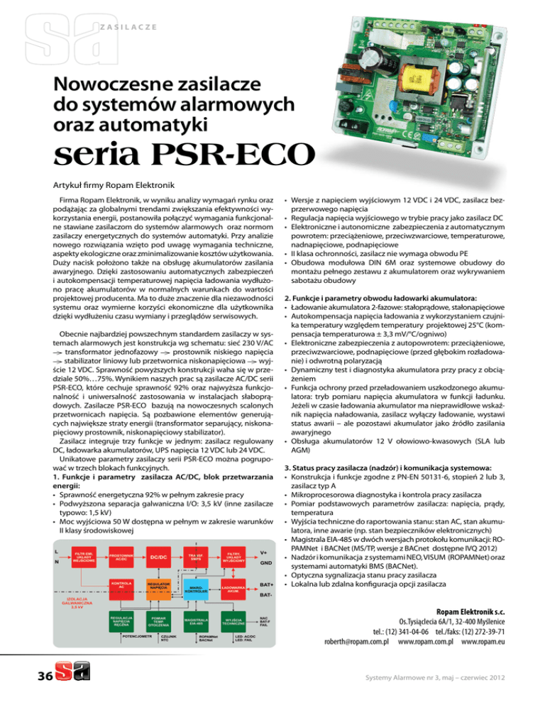 Zasilacze Nowoczesne zasilacze do systemów alarmowych oraz automatyki seria PSR-ECO Artykuł firmy Ropam Elektronik Firma Ropam Elektronik, w wyniku analizy wymagań rynku oraz podążając za globalnymi trendami zwiększania efektywności wykorzystania energii, postanowiła połączyć wymagania funkcjonalne stawiane zasilaczom do systemów alarmowych oraz normom zasilaczy energetycznych do systemów automatyki. Przy analizie nowego rozwiązania wzięto pod uwagę wymagania techniczne, aspekty ekologiczne oraz zminimalizowanie kosztów użytkowania. Duży nacisk położono także na obsługę akumulatorów zasilania awaryjnego. Dzięki zastosowaniu automatycznych zabezpieczeń i autokompensacji temperaturowej napięcia ładowania wydłużono pracę akumulatorów w normalnych warunkach do wartości projektowej producenta. Ma to duże znaczenie dla niezawodności systemu oraz wymierne korzyści ekonomiczne dla użytkownika dzięki wydłużeniu czasu wymiany i przeglądów serwisowych. Obecnie najbardziej powszechnym standardem zasilaczy w systemach alarmowych jest konstrukcja wg schematu: sieć 230 V/AC transformator jednofazowy prostownik niskiego napięcia stabilizator liniowy lub przetwornica niskonapięciowa wyjście 12 VDC. Sprawność powyższych konstrukcji waha się w przedziale 50%…75%. Wynikiem naszych prac są zasilacze AC/DC serii PSR-ECO, które cechuje sprawność 92% oraz najwyższa funkcjonalność i uniwersalność zastosowania w instalacjach słaboprądowych. Zasilacze PSR-ECO bazują na nowoczesnych scalonych przetwornicach napięcia. Są pozbawione elementów generujących największe straty energii (transformator separujący, niskonapięciowy prostownik, niskonapięciowy stabilizator). Zasilacz integruje trzy funkcje w jednym: zasilacz regulowany DC, ładowarka akumulatorów, UPS napięcia 12 VDC lub 24 VDC. Unikatowe parametry zasilaczy serii PSR-ECO można pogrupować w trzech blokach funkcyjnych. 1. Funkcje i parametry zasilacza AC/DC, blok przetwarzania energii: • Sprawność energetyczna 92% w pełnym zakresie pracy • Podwyższona separacja galwaniczna I/O: 3,5 kV (inne zasilacze typowo: 1,5 kV) • Moc wyjściowa 50 W dostępna w pełnym w zakresie warunków II klasy środowiskowej • Wersje z napięciem wyjściowym 12 VDC i 24 VDC, zasilacz bezprzerwowego napięcia • Regulacja napięcia wyjściowego w trybie pracy jako zasilacz DC • Elektroniczne i autonomiczne zabezpieczenia z automatycznym powrotem: przeciążeniowe, przeciwzwarciowe, temperaturowe, nadnapięciowe, podnapięciowe • II klasa ochronności, zasilacz nie wymaga obwodu PE • Obudowa modułowa DIN 6M oraz systemowe obudowy do montażu pełnego zestawu z akumulatorem oraz wykrywaniem sabotażu obudowy 2. Funkcje i parametry obwodu ładowarki akumulatora: • Ładowanie akumulatora 2-fazowe: stałoprądowe, stałonapięciowe • Autokompensacja napięcia ładowania z wykorzystaniem czujnika temperatury względem temperatury projektowej 25°C (kompensacja temperaturowa ± 3,3 mV/°C/ogniwo) • Elektroniczne zabezpieczenia z autopowrotem: przeciążeniowe, przeciwzwarciowe, podnapięciowe (przed głębokim rozładowanie) i odwrotną polaryzacją • Dynamiczny test i diagnostyka akumulatora przy pracy z obciążeniem • Funkcja ochrony przed przeładowaniem uszkodzonego akumulatora: tryb pomiaru napięcia akumulatora w funkcji ładunku. Jeżeli w czasie ładowania akumulator ma nieprawidłowe wskaźnik napięcia naładowania, zasilacz wyłączy ładowanie, wystawi status awarii – ale pozostawi akumulator jako źródło zasilania awaryjnego • Obsługa akumulatorów 12 V ołowiowo-kwasowych (SLA lub AGM) 3. Status pracy zasilacza (nadzór) i komunikacja systemowa: • Konstrukcja i funkcje zgodne z PN-EN 50131-6, stopień 2 lub 3, zasilacz typ A • Mikroprocesorowa diagnostyka i kontrola pracy zasilacza • Pomiar podstawowych parametrów zasilacza: napięcia, prądy, temperatura • Wyjścia techniczne do raportowania stanu: stan AC, stan akumulatora, inne awarie (np. stan bezpieczników elektronicznych) • Magistrala EIA-485 w dwóch wersjach protokołu komunikacji: ROPAMNet i BACNet (MS/TP, wersje z BACnet dostępne IVQ 2012) • Nadzór i komunikacja z systemami NEO, VISUM (ROPAMNet) oraz systemami automatyki BMS (BACNet). • Optyczna sygnalizacja stanu pracy zasilacza • Lokalna lub zdalna konfiguracja opcji zasilacza Ropam Elektronik s.c. Os.Tysiąclecia 6A/1, 32-400 Myślenice tel.: (12) 341-04-06 tel./faks: (12) 272-39-71 [email protected] www.ropam.com.pl www.ropam.eu 36 Systemy Alarmowe nr 3, maj – czerwiec 2012