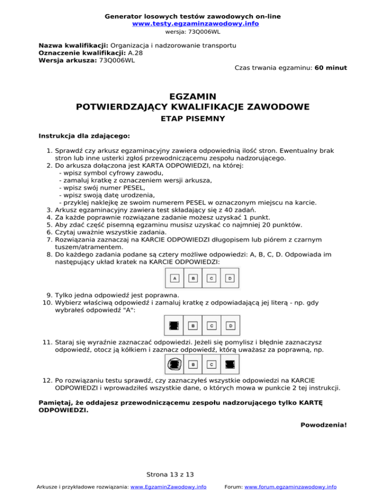 Generator losowych testów zawodowych on-line www.testy.egzaminzawodowy.info wersja: 73Q006WL Nazwa kwalifikacji: Organizacja i nadzorowanie transportu Oznaczenie kwalifikacji: A.28 Wersja arkusza: 73Q006WL Czas trwania egzaminu: 60 minut EGZAMIN POTWIERDZAJĄCY KWALIFIKACJE ZAWODOWE ETAP PISEMNY Instrukcja dla zdającego: 1. Sprawdź czy arkusz egzaminacyjny zawiera odpowiednią ilość stron. Ewentualny brak stron lub inne usterki zgłoś przewodniczącemu zespołu nadzorującego. 2. Do arkusza dołączona jest KARTA ODPOWIEDZI, na której: - wpisz symbol cyfrowy zawodu, - zamaluj kratkę z oznaczeniem wersji arkusza, - wpisz swój numer PESEL, - wpisz swoją datę urodzenia, - przyklej naklejkę ze swoim numerem PESEL w oznaczonym miejscu na karcie. 3. Arkusz egzaminacyjny zawiera test składający się z 40 zadań. 4. Za każde poprawnie rozwiązane zadanie możesz uzyskać 1 punkt. 5. Aby zdać część pisemną egzaminu musisz uzyskać co najmniej 20 punktów. 6. Czytaj uważnie wszystkie zadania. 7. Rozwiązania zaznaczaj na KARCIE ODPOWIEDZI długopisem lub piórem z czarnym tuszem/atramentem. 8. Do każdego zadania podane są cztery możliwe odpowiedzi: A, B, C, D. Odpowiada im następujący układ kratek na KARCIE ODPOWIEDZI: 9. Tylko jedna odpowiedź jest poprawna. 10. Wybierz właściwą odpowiedź i zamaluj kratkę z odpowiadającą jej literą - np. gdy wybrałeś odpowiedź "A": 11. Staraj się wyraźnie zaznaczać odpowiedzi. Jeżeli się pomylisz i błędnie zaznaczysz odpowiedź, otocz ją kółkiem i zaznacz odpowiedź, którą uważasz za poprawną, np. 12. Po rozwiązaniu testu sprawdź, czy zaznaczyłeś wszystkie odpowiedzi na KARCIE ODPOWIEDZI i wprowadziłeś wszystkie dane, o których mowa w punkcie 2 tej instrukcji. Pamiętaj, że oddajesz przewodniczącemu zespołu nadzorującego tylko KARTĘ ODPOWIEDZI. Powodzenia! Strona 13 z 13 Arkusze i przykładowe rozwiązania: www.EgzaminZawodowy.info Forum: www.forum.egzaminzawodowy.info Generator losowych testów zawodowych on-line www.testy.egzaminzawodowy.info wersja: 73Q006WL Zadanie 1. Elektroniczny system poboru opłat działający na terenie Polski to A. ViaToll B. DKV Box C. NAWI-TRANS D. Toll Collect Zadanie 2. Zdjęcie przedstawia naczepę do przewozu A. szkła. B. żywca. C. mąki. D. drewna. Zadanie 3. Tablica przedstawiona na rysunku umieszczana jest na A. przyczepie/naczepie zbyt długiej i ciężkiej. B. pojazdach samochodowych zbyt długich i ciężkich. C. pojazdach wolno poruszających się. D. pojazdach samochodowych przewożących materiały niebezpieczne. Zadanie 4. Polisa chroniąca mienie (towar, ładunek) w transporcie drogowym, kolejowym, lotniczym i śródlądowym wykonywanym na terenie RP lub poza nią to A. gestia transportowa. B. OPWS. C. ubezpieczenie CARGO. D. ubezpieczenie AC. Zadanie 5. Strona 2 z 13 Arkusze i przykładowe rozwiązania: www.EgzaminZawodowy.info Forum: www.forum.egzaminzawodowy.info Generator losowych testów zawodowych on-line www.testy.egzaminzawodowy.info wersja: 73Q006WL Jeżeli kierowca samochodu ciężarowego ma do przejechania 720 km ze średnią prędkością 60 km/h, to zachowując 11 godzinny łączny odpoczynek i stosując minimalne czasy przerw zgodnie z Ustawą o czasie pracy kierowców całkowity czas przejazdu zajmie mu A. 24 h B. 23 h 15 min C. 23 h 45 min D. 30 h Zadanie 6. Materiał ciekły łatwo zapalny (temperatura zapłonu niższa niż 23 °C) oznacza się zgodnie z przepisami ADR liczbą A. 23 B. 33 C. 55 D. 40 Zadanie 7. Do przewozu ładunku w transporcie lotniczym stosuje się kontener A. A B. B C. C D. D Zadanie 8. Załączona tablica informuje o przewozie materiałów Strona 3 z 13 Arkusze i przykładowe rozwiązania: www.EgzaminZawodowy.info Forum: www.forum.egzaminzawodowy.info Generator losowych testów zawodowych on-line www.testy.egzaminzawodowy.info wersja: 73Q006WL A. ponadgabarytowych. B. niebezpiecznych. C. sypkich. D. szybko psujących się. Zadanie 9. Firma transportowa otrzymała do przewozu 2 400 sztuk kartonów o wymiarach (dł. x szer. x wys.) 200 x 200 x 250 mm. Kartony spiętrzone są w czterech warstwach. Ile paletowych jednostek ładunkowych będzie miała do przewozu firma transportowa? A. 25 pjł B. 20 pjł C. l0 pjł D. 30 pjł Zadanie 10. Produkt przetworzony i wyrób gotowy, który przemieszczany jest w opakowaniach jednostkowych lub zbiorczych, to ładunek A. dłużycowy. B. drobnicowy. C. ponadgabarytowy. D. całopojazdowy. Zadanie 11. Dobowy czas prowadzenia samochodu ciężarowego, liczony pomiędzy dobowymi odpoczynkami od prowadzenia pojazdów, nie może przekraczać A. 24 godzin. B. 11 godzin. C. 9 godzin. D. 6 godzin. Zadanie 12. Jeżeli na pasie mocującym brak jest etykiety lub jest ona nieczytelna, to zgodnie z załączonym fragmentem normy EN 12195 taki pas Strona 4 z 13 Arkusze i przykładowe rozwiązania: www.EgzaminZawodowy.info Forum: www.forum.egzaminzawodowy.info Generator losowych testów zawodowych on-line www.testy.egzaminzawodowy.info wersja: 73Q006WL A. może być użyty tylko pod nadzorem służby BHP. B. nigdy nie może być używany do mocowania ładunków. C. wymaga zastosowania odpowiedniego sposobu zamocowania. D. może być użyty bez ograniczeń. Zadanie 13. Zgodnie z Umową AETR maksymalny tygodniowy czas prowadzenia pojazdu wynosi A. 56 h B. 48 h C. 52 h D. 45 h Zadanie 14. W liście przewozowym AWB określenie Shipper's oznacza A. przewoźnika. B. celnika. C. odbiorcę. D. nadawcę. Zadanie 15. Jakiej informacji dostarcza zamieszczony znak? A. Przestrzegać zakresu temperatur. B. Opakowanie hermetyczne. C. Produkty łatwo psujące się. D. Chronić przed nagrzaniem. Zadanie 16. Warunkiem przyjęcia kierowcy na dokształcający kurs początkowy w zakresie przewozu materiałów niebezpiecznych ADR jest ukończenie co najmniej Strona 5 z 13 Arkusze i przykładowe rozwiązania: www.EgzaminZawodowy.info Forum: www.forum.egzaminzawodowy.info Generator losowych testów zawodowych on-line www.te