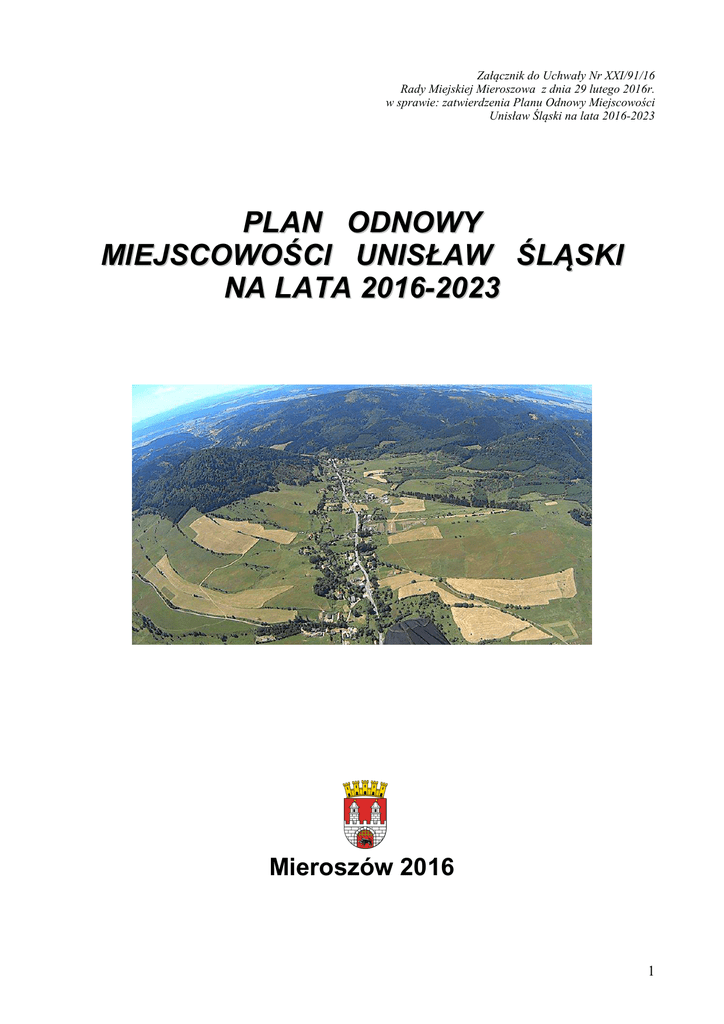 Załącznik do Uchwały Nr XXI/91/16 Rady Miejskiej Mieroszowa z dnia 29 lutego 2016r. w sprawie: zatwierdzenia Planu Odnowy Miejscowości Unisław Śląski na lata 2016-2023 PLAN ODNOWY MIEJSCOWOŚCI UNISŁAW ŚLĄSKI NA LATA 2016-2023 Mieroszów 2016 1 Spis treści: Str.: I. Charakterystyka miejscowości Unisław Śląski........................................................................... 3 II. Inwentaryzacja zasobów ….................................................................................................... 5 III. Ocena mocnych i słabych stron miejscowości Unisław Śląski …........................................... 9 IV. Opis planowanych zadań inwestycyjnych i przedsięwzięć aktywizujących społeczność lokalną w latach 2016-2023 …......................................................................................................10 V. Opis i charakterystyka obszarów o szczególnym znaczeniu dla zaspokojenia potrzeb mieszkańców, sprzyjających nawiązywaniu kontaktów społecznych, ze względu na ich położenie oraz cechy funkcjonalno-przestrzenne, w szczególności poprzez odnawianie lub budowę placów parkingowych, chodników lub oświetlenia ulicznego................................. 13 2 I. CHARAKTERYSTYKA MIEJSCOWOŚCI UNISŁAW ŚLĄSKI Ogólne informacje Wieś Unisław Śląski znajduje się w południowej części województwa dolnośląskiego, w powiecie wałbrzyskim, w przygranicznej gminie Mieroszów. Większość zabudowań sołectwa usytuowana jest wzdłuż drogi krajowej nr 35 biegnącej do przejścia granicznego z Czechami w Golińsku. Przez miejscowość przebiega również linia kolejowa nr 291 z Wałbrzycha do Mieroszowa. Jej przedłużenie na południe od Mieroszowa prowadzi przez granicą do Mezimesti w Czechach. Z punktu widzenia geograficznego miejscowość położona jest w Górach Kamiennych, wchodzących w skład Sudetów Środkowych i Parku Krajobrazowego Sudetów Wałbrzyskich oraz na Wyżynie Unisławskej. Otoczona jest górskimi szczytami w Masywie Stożka: Stożek Wielki (841 m n.p.m.), Stożek Mały (750 m n.p.m.) oraz w Masywie Dzikowca i Lesistej Wielkiej: Lesista Wielka (851 m n.p.m.), Lesista Mała (780 m n.p.m.), Dzikowiec (836 m n.p.m.), Brzozówka (763 m n.p.m.), Sokółka (801 m n.p.m.), Stachonik (692 m n.p.m.), Ostrosz (792 m n.p.m.), Stróżysko (660 m n.p.m.). Wyżyna Unisławska jest źródliskowym wododziałem spływających z niej rzek: Leku – dopływ Bobru, Ogorzelca – dopływ Pełcznicy i odpływów Ścinawki, której dolina tworzy szerokie obniżenie. Klimat występujący w gminie, jak również w miejscowości Unisław Śląski to klimat górski, silnie zróżnicowany w zależności od wysokości i rozkładu form ukształtowania powierzchni. Dość znaczna ilość opadów rzędu 700-800 mm rocznie, a w najwyższych partiach nawet do 900 mm – maksimum opadów przypada na okres letni. Istotną rolę w kształtowaniu warunków klimatycznych odgrwa rzeźba terenu. Unisław Śląski zamieszkuje 598 osób (stan na 04.12.2015 r.). 3 Dawna nazwa miejscowości Lang-Waltersdorf – 1785, Langwaltersdorf, Waltersdorf i Lang-Waltersdorf – 1830 i 1845. Odtąd – Unisław Śląski. Pierwotna nazwa zapewne odimienna (od imienia Walter). Późniejsza bez związku z tradycją. Do miejscowości należała również osada położona na południe od właściwej wsi. Do 1945 r. nosiła nazwę Nieder Waltersdorf (Unisław Dolny). Historia wsi i dóbr Unisław Śląski to wieś o średniowiecznej metryce należąca do lenna zamku Radosno. Podobnie jak cała okolica splądrowana została przez husytów w 1428 r., a następnie opustoszała. W okresie reformacji funkcjonowała jednakże jako całkiem rozwinięta osada, protestanci przejęli wówczas istniejący tu murowany kościół, który pozostał w ich rękach do 1654 r. Nim jednak do tego doszło, w latach 30-tych XVII w., należąca wówczas do Hochbergów wieś została ponownie zniszczona na skutek działań wojny trzydziestoletniej. W 1661 r. przybyły tu z innych terenów na Śląsku Georg Preußer, mistrz szklarski, zakupił we wsi grunt, na którym uruchomił hutę szkła. Akcja rekatolizacji przyniosła niewielkie efekty, ludność w większości pozostała przy wyznaniu ewangelickim. Kościół z czasem stał się, ze względu na małą liczbę wiernych, kościołem filialnym parafii w Mieroszowie a jego utrzymanie zależne było jedynie od sprawujących prawo patronatu Hochbergów. Z ich to funduszy z 1773 cieśla Gottfried Reimann przeprowadził remont wieży. Rozkwit wsi nastąpił w XVIII w. W 1742 r. tutejsza gmina ewangelicka wzniosła typowy dla Śląska bezwieżowy Bethaus – dom modlitwy o szkieletowej konstrukcji. W 1888 r. dokonano istotnej rozbudowy świątyni. Powiększono budowlę od zachodu przez dodanie 1 przęsła. Przemurowaniu uległy ściany obwodowe, wzniesiono również okazałą wieżę. W tym czasie przemysł wiejski zdominowany był przez tkactwo. Liczne tutejsze warsztaty bawełnicze i lniarskie pracowały na usługi pobliskiego ośrodka w Mieroszowie. Funkcjonujące we wsi karczma i zajazd (oraz gospoda w przysiółku Ługowina) obsługiwały rozwijający się dzięki uzdrowisku w Sokołowsku ruch turystyczny. W Ługowinie już od połowy XIX stulecia istniała filia sokołowskiego zakładu wodoleczniczego dla chorych na gruźlicę płuc. 4 2. INWENTARYZACJA ZASOBÓW Struktura funkcjonalno-przestrzenna Zgodnie z zapisami “Studium uwarunkowań i kierunków zagospodarowania przestrzennego miasta i gminy Mieroszów” dla Unisławia Śląskiego– projektowane jest utrzymanie obecnego charakteru wsi tj. rolniczego, usługowo – produkcyjnego oraz w mniejszym zakresie funkcji mieszkaniowej i turystycznej. Obecna zabudowa podlegać będzie modernizacji i rehabilitacji (wszystkie obiekty objęte ochroną konserwatorską). Obszar zabudowy wiejskiej objęty jest różnymi formami ochrony. Tereny Unisławia Śląskiego zgodnie 