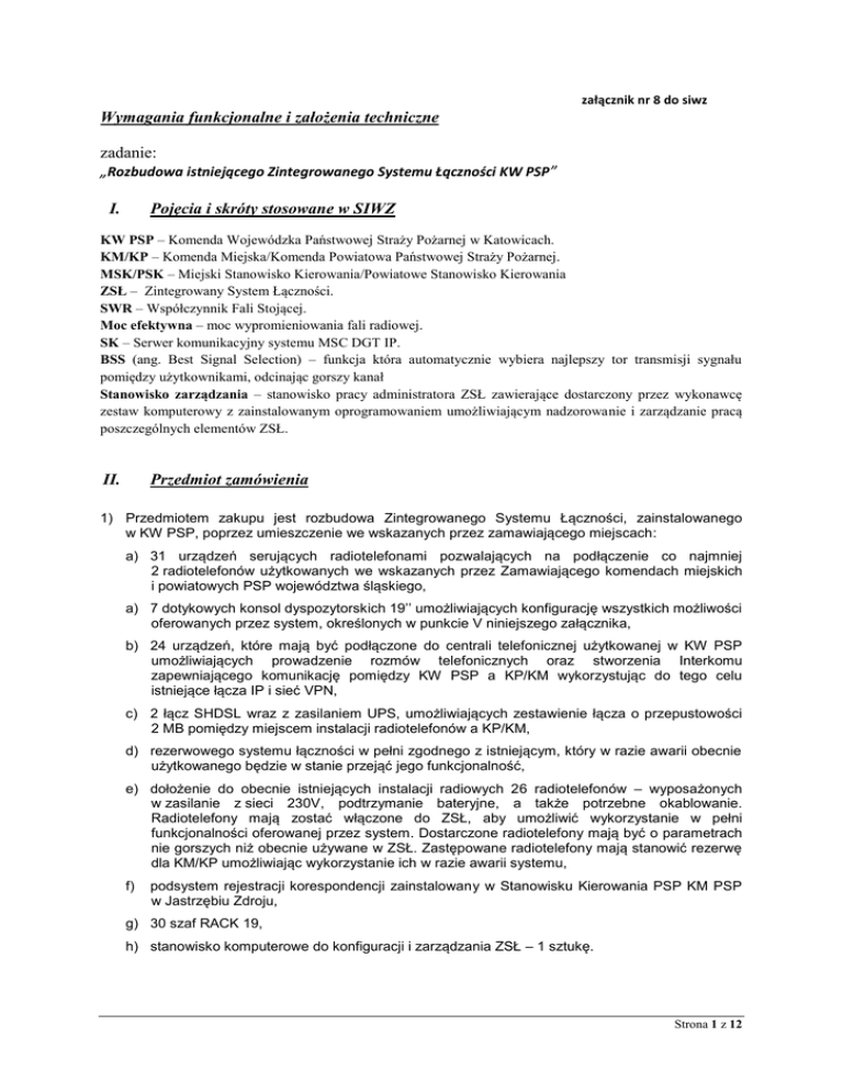 załącznik nr 8 do siwz Wymagania funkcjonalne i założenia techniczne zadanie: „Rozbudowa istniejącego Zintegrowanego Systemu Łączności KW PSP” Pojęcia i skróty stosowane w SIWZ I. KW PSP – Komenda Wojewódzka Państwowej Straży Pożarnej w Katowicach. KM/KP – Komenda Miejska/Komenda Powiatowa Państwowej Straży Pożarnej. MSK/PSK – Miejski Stanowisko Kierowania/Powiatowe Stanowisko Kierowania ZSŁ – Zintegrowany System Łączności. SWR – Współczynnik Fali Stojącej. Moc efektywna – moc wypromieniowania fali radiowej. SK – Serwer komunikacyjny systemu MSC DGT IP. BSS (ang. Best Signal Selection) – funkcja która automatycznie wybiera najlepszy tor transmisji sygnału pomiędzy użytkownikami, odcinając gorszy kanał Stanowisko zarządzania – stanowisko pracy administratora ZSŁ zawierające dostarczony przez wykonawcę zestaw komputerowy z zainstalowanym oprogramowaniem umożliwiającym nadzorowanie i zarządzanie pracą poszczególnych elementów ZSŁ. Przedmiot zamówienia II. 1) Przedmiotem zakupu jest rozbudowa Zintegrowanego Systemu Łączności, zainstalowanego w KW PSP, poprzez umieszczenie we wskazanych przez zamawiającego miejscach: a) 31 urządzeń serujących radiotelefonami pozwalających na podłączenie co najmniej 2 radiotelefonów użytkowanych we wskazanych przez Zamawiającego komendach miejskich i powiatowych PSP województwa śląskiego, a) 7 dotykowych konsol dyspozytorskich 19’’ umożliwiających konfigurację wszystkich możliwości oferowanych przez system, określonych w punkcie V niniejszego załącznika, b) 24 urządzeń, które mają być podłączone do centrali telefonicznej użytkowanej w KW PSP umożliwiających prowadzenie rozmów telefonicznych oraz stworzenia Interkomu zapewniającego komunikację pomiędzy KW PSP a KP/KM wykorzystując do tego celu istniejące łącza IP i sieć VPN, c) 2 łącz SHDSL wraz z zasilaniem UPS, umożliwiających zestawienie łącza o przepustowości 2 MB pomiędzy miejscem instalacji radiotelefonów a KP/KM, d) rezerwowego systemu łączności w pełni zgodnego z istniejącym, który w razie awarii obecnie użytkowanego będzie w stanie przejąć jego funkcjonalność, e) dołożenie do obecnie istniejących instalacji radiowych 26 radiotelefonów – wyposażonych w zasilanie z sieci 230V, podtrzymanie bateryjne, a także potrzebne okablowanie. Radiotelefony mają zostać włączone do ZSŁ, aby umożliwić wykorzystanie w pełni funkcjonalności oferowanej przez system. Dostarczone radiotelefony mają być o parametrach nie gorszych niż obecnie używane w ZSŁ. Zastępowane radiotelefony mają stanowić rezerwę dla KM/KP umożliwiając wykorzystanie ich w razie awarii systemu, f) podsystem rejestracji korespondencji zainstalowany w Stanowisku Kierowania PSP KM PSP w Jastrzębiu Zdroju, g) 30 szaf RACK 19, h) stanowisko komputerowe do konfiguracji i zarządzania ZSŁ – 1 sztukę. Strona 1 z 12 2) W ramach przedmiotu zamówienia Wykonawca przeniesie Serwer Komunikacyjny ZSŁ z serwerowni do nowego pomieszczania serwerowni znajdującego się w tej samej części budynku KW PSP, tj. na niższą kondygnację. 3) System instalowany w jednostkach ma stanowić alternatywę dla obecnie użytkowanych systemów łączności w KM/KP i w żaden sposób nie może zmieniać ich parametrów i ustawień. Nowo instalowane urządzenia i radiotelefony nie mogą zakłócać, ani zmieniać sposobu dotychczasowej pracy stanowisk kierowania KM/KP PSP. Nowo instalowane radiotelefony mają wykorzystywać istniejące instalacje antenowe w KM/KP. Podłączanie do nich ma być zapewnione poprzez przełącznik antenowy, który nie będzie pogarszał zastanych parametrów antenowych tj. SWR co najwyżej 1,2 i mocy efektywnej nie mniej niż 98 %. Zastosowany przełącznik ma w razie awarii systemu umożliwić wykorzystanie zastąpionych przez nowe, a przeznaczone jako rezerwowych radiotelefonów stacjonarnych bez potrzeby przepinania instalacji antenowych. Należy zapewnić także dołożenie odpowiednich przejściówek i dodatkowego okablowania umożliwiających wpięcie do tych instalacji i poprawę jakości połączeń obecnie zastosowanych. Wszystkie urządzenia wykorzystywane do poprawnej pracy systemu mają być zamknięte w odpowiedniej wielkości szafie RACK 19” o parametrach dostosowanych dla warunków miejsca instalacji, umieszczonej w trzydziestu wskazanych przez Zamawiającego obiektach PSP województwa śląskiego. 4) Dodatkowo należy przewidzieć prace związane z poprawą parametrów anten radiowych zamontowanych na maszcie znajdującym się na budynku wspinalni w KW PSP. W szczególności zwrócić należy uwagę na poprawne umieszczenie anten na maszcie i utrzymanie poziomu SWR nie większego niż 1.1 i mocy efektywnej nie mniejszej niż 98%. 5) Do połączenia obecnie stosowanego ZSŁ KW PSP z nowo instalowanymi urządzeniami sterującymi radiotelefonami w KM/KP należy wykorzystać istniejące połączenie VPN. 6) Wymienione powyżej elementy rozbudowy muszą być w pełni kompatybilne z ZSŁ dotychczas użytkowanym przez Zamawiającego. 7) Aktualnie pracujący system MCS DGT IP integruje w jednej platformie sprzętowej środki łączności użytkowane w KW PSP. Ogólny schemat systemu przedstawia rys. 1. Rys.1 Ogólny schemat systemu MCS DGT IP dla KW PSP Strona 2 z 12 System MCS DGT IP składa się z następujących elementów: 1. Serwer Komunikacyjny – składający się z modułu telefonicznego, serwera radiowego (SS) zapewniającego integrację ze zdalnymi radiotelefonami stacjonarnymi oraz radiotelefonami zdalnymi znajdującymi się w KP PSP Lubliniec, serwera zarządzania, taryfikacji i statystyki oraz rejestratora rozmów NetCRR2. SK jest umiejscowiony w serwerowni budynku KW PSP. Do SK podłączone są 3 konsole dyspozytorskie umieszczone w Wojewódzkim Stanowisku Koordynacji Ratownictwa. SK wyposażony jest w 4 interfejsy ISDN BRA, zapewniające integrację systemu z użytko