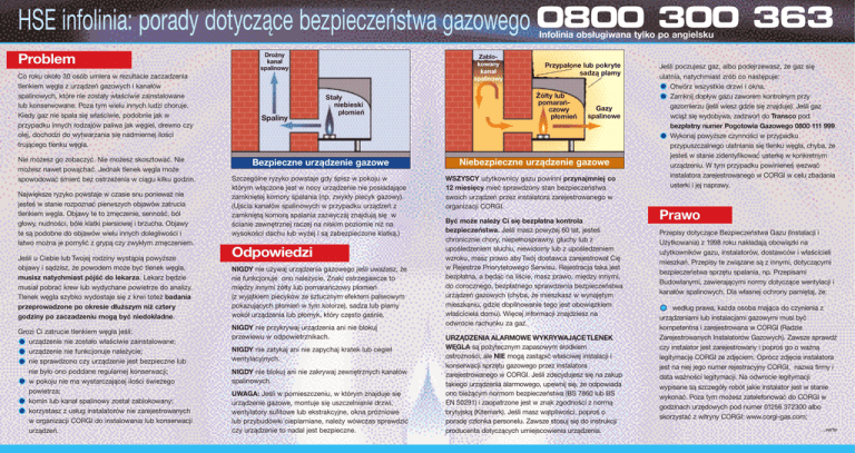 HSE infolinia: porady dotyczące bezpieczeństwa gazowego 0800 300 363 Infolinia obsługiwana tylko po angielsku Problem Co roku około 30 osób umiera w rezultacie zaczadzenia tlenkiem węgla z urządzeń gazowych i kanałów spalinowych, które nie zostały właściwie zainstalowane lub konserwowane. Poza tym wielu innych ludzi choruje. Kiedy gaz nie spala się właściwie, podobnie jak w przypadku innych rodzajów paliwa jak węgiel, drewno czy olej, dochodzi do wytwarzania się nadmiernej ilości trującego tlenku węgla. Nie możesz go zobaczyć. Nie możesz skosztować. Nie możesz nawet powąchać. Jednak tlenek węgla może spowodować śmierć bez ostrzeżenia w ciągu kilku godzin. Największe ryzyko powstaje w czasie snu ponieważ nie jesteś w stanie rozpoznać pierwszych objawów zatrucia tlenkiem węgla. Objawy te to zmęczenie, senność, ból głowy, nudności, bóle klatki piersiowej i brzucha. Objawy te są podobne do objawów wielu innych dolegliwości i łatwo można je pomylić z grypą czy zwykłym zmęczeniem. Jeśli u Ciebie lub Twojej rodziny wystąpią powyższe objawy i sądzisz, że powodem może być tlenek węgla, musisz natychmiast pójść do lekarza. Lekarz będzie musiał pobrać krew lub wydychane powietrze do analizy. Tlenek węgla szybko wydostaje się z krwi toteż badania przeprowadzone po okresie dłuższym niż cztery godziny po zaczadzeniu mogą być niedokładne. Grozi Ci zatrucie tlenkiem węgla jeśli: urządzenie nie zostało właściwie zainstalowane; urządzenie nie funkcjonuje należycie; nie sprawdzono czy urządzenie jest bezpieczne lub nie było ono poddane regularnej konserwacji; w pokoju nie ma wystarczającej ilości świeżego powietrza; komin lub kanał spalinowy został zablokowany; korzystasz z usług instalatorów nie zarejestrowanych w organizacji CORGI do instalowania lub konserwacji urządzeń. Drożny kanał spalinowy Spaliny Zablokowany kanał spalinowy Stały niebieski płomień Bezpieczne urządzenie gazowe Szczególne ryzyko powstaje gdy śpisz w pokoju w którym włączone jest w nocy urządzenie nie posiadające zamkniętej komory spalania (np. zwykły piecyk gazowy). (Ujścia kanałów spalinowych w przypadku urządzeń z zamkniętą komorą spalania zazwyczaj znajdują się w ścianie zewnętrznej raczej na niskim poziomie niż na wysokości dachu lub wyżej i są zabezpieczone klatką.) Odpowiedzi NIGDY nie używaj urządzenia gazowego jeśli uważasz, że nie funkcjonuje ono należycie. Znaki ostrzegawcze to między innymi żółty lub pomarańczowy płomień (z wyjątkiem piecyków ze sztucznym efektem paliwowym pokazujących płomień w tym kolorze), sadza lub plamy wokół urządzenia lub płomyk, który często gaśnie. NIGDY nie przykrywaj urządzenia ani nie blokuj przewiewu w odpowietrznikach. NIGDY nie zatykaj ani nie zapychaj kratek lub cegieł wentylacyjnych. NIGDY nie blokuj ani nie zakrywaj zewnętrznych kanałów spalinowych. UWAGA: Jeśli w pomieszczeniu, w którym znajduje się urządzenie gazowe, montuje się uszczelnianie drzwi, wentylatory sufitowe lub ekstrakcyjne, okna próżniowe lub przybudówki cieplarniane, należy wówczas sprawdzić czy urządzenie to nadal jest bezpieczne. Przypalone lub pokryte sadzą plamy Żółty lub pomarańczowy płomień Gazy spalinowe Niebezpieczne urządzenie gazowe WSZYSCY użytkownicy gazu powinni przynajmniej co 12 miesięcy mieć sprawdzony stan bezpieczeństwa swoich urządzeń przez instalatora zarejestrowanego w organizacji CORGI. Być może należy Ci się bezpłatna kontrola bezpieczeństwa. Jeśli masz powyżej 60 lat, jesteś chronicznie chory, niepełnosprawny, głuchy lub z upośledzeniem słuchu, niewidomy lub z upośledzeniem wzroku, masz prawo aby Twój dostawca zarejestrował Cię w Rejestrze Priorytetowego Serwisu. Rejestracja taka jest bezpłatna, a będąc na liście, masz prawo, między innymi, do corocznego, bezpłatnego sprawdzenia bezpieczeństwa urządzeń gazowych (chyba, że mieszkasz w wynajętym mieszkaniu, gdzie dopilnowanie tego jest obowiązkiem właściciela domu). Więcej informacji znajdziesz na odwrocie rachunku za gaz. URZĄDZENIA ALARMOWE WYKRYWAJĄCE TLENEK WĘGLA są pożytecznym zapasowym środkiem ostrożności, ale NIE mogą zastąpić właściwej instalacji i konserwacji sprzętu gazowego przez instalatora zarejestrowanego w CORGI. Jeśli zdecydujesz się na zakup takiego urządzenia alarmowego, upewnij się, że odpowiada ono bieżącym normom bezpieczeństwa (BS 7860 lub BS EN 50291) i zaopatrzone jest w znak zgodności z normą brytyjską (Kitemark). Jeśli masz wątpliwości, poproś o poradę członka personelu. Zawsze stosuj się do instrukcji producenta dotyczących umiejscowienia urządzenia. Jeśli poczujesz gaz, albo podejrzewasz, że gaz się ulatnia, natychmiast zrób co następuje: Otwórz wszystkie drzwi i okna. Zamknij dopływ gazu zaworem kontrolnym przy gazomierzu (jeśli wiesz gdzie się znajduje). Jeśli gaz wciąż się wydobywa, zadzwoń do Transco pod bezpłatny numer Pogotowia Gazowego 0800 111 999. Wykonaj powyższe czynności w przypadku przypuszczalnego ulatniania się tlenku węgla, chyba, że jesteś w stanie zidentyfikować usterkę w konkretnym urządzeniu. W tym przypadku powinieneś wezwać instalatora zarejestrowanego w CORGI w celu zbadania usterki i jej naprawy. Prawo Przepisy dotyczące Bezpieczeństwa Gazu (Instalacji i Użytkowania) z 1998 roku nakładają obowiązki na użytkowników gazu, instalatorów, dostawców i właścicieli mieszkań. Przepisy te związane są z innymi, dotyczącymi bezpieczeństwa sprzętu spalania, np. Przepisami Budowlanymi, zawierającymi normy dotyczące wentylacji i kanałów spalinowych. Dla własnej ochrony pamiętaj, że: według prawa, każda osoba mająca do czynienia z urządzeniami lub instalacjami gazowymi musi być kompetentna i zarejestrowana w CORGI (Radzie Zarejestrowanych Instalatorów Gazowych). Zawsze sprawdź czy instalator jest zarejes