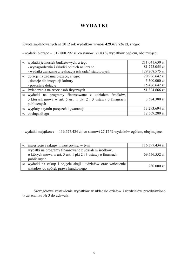 WYDATKI Kwota zaplanowanych na 2012 rok wydatków wynosi 429.477.726 zł, z tego: - wydatki bieżące – 312.800.292 zł, co stanowi 72,83 % wydatków ogółem, obejmujące: • wydatki jednostek budżetowych, z tego - wynagrodzenia i składki od nich naliczane - wydatki związane z realizacją ich zadań statutowych • dotacje na zadania bieżące, z tego: - dotacje dla instytucji kultury - pozostałe dotacje • świadczenia na rzecz osób fizycznych • wydatki na programy finansowane z udziałem środków, o których mowa w art. 5 ust. 1 pkt 2 i 3 ustawy o finansach publicznych • wypłaty z tytułu poręczeń i gwarancji • obsługa długu 211.041.630 zł 81.773.055 zł 129.268.575 zł 20.986.642 zł 5.500.000 zł 15.486.642 zł 51.324.666 zł 3.584.380 zł 13.293.694 zł 12.569.280 zł - wydatki majątkowe – 116.677.434 zł, co stanowi 27,17 % wydatków ogółem, obejmujące: • inwestycje i zakupy inwestycyjne, w tym: wydatki na programy finansowane z udziałem środków, o których mowa w art. 5 ust. 1 pkt 2 i 3 ustawy o finansach publicznych • wydatki na zakup i objęcie akcji i udziałów oraz wniesienie wkładów do spółek prawa handlowego 116.397.434 zł 69.556.552 zł 280.000 zł Szczegółowe zestawienie wydatków w układzie działów i rozdziałów przedstawiono w załączniku Nr 3 do uchwały. 72 Porównanie planowanych wydatków na 2012 r. do przewidywanego wykonania wydatków w 2011 r. według działów /w zł/ Dział 1 010 100 600 630 700 710 750 751 752 754 756 757 758 801 851 852 853 Nazwa działu 2 Rolnictwo i łowiectwo Górnictwo i kopalnictwo Transport i łączność Turystyka Gospodarka mieszkaniowa Działalność usługowa Administracja publiczna Urzędy naczelnych organów władzy państwowej, kontroli i ochrony prawa oraz sądownictwa Obrona narodowa Bezpieczeństwo publiczne i ochrona przeciwpożarowa Dochody od osób prawnych, od osób fizycznych i od innych jednostek nieposiadających osobowości prawnej oraz wydatki związane z ich poborem Obsługa długu publicznego Różne rozliczenia Oświata i wychowanie Ochrona zdrowia Pomoc społeczna Pozostałe zadania w zakresie polityki społecznej Przewidywane wykonanie za Plan na 2012 rok 2011 rok 3 4 134 074,33 40 995,00 12 000,00 0,00 53 382 531,00 79 299 746,00 71 000,00 74 800,00 55 467 533,00 52 521 831,00 1 672 411,00 1 549 000,00 25 585 515,00 22 934 876,00 % 4:3 5 30,58 0,00 148,55 105,35 94,69 92,62 89,64 327 275,00 1 000,00 20 948,00 1 000,00 6,40 100,00 3 541 805,00 3 458 959,00 97,66 62 500,00 16 669 725,00 1 592 760,00 81 989 411,00 2 358 180,00 62 397 851,00 0,00 26 262 760,00 9 467 164,00 79 364 104,00 2 321 178,00 64 767 387,00 0,00 157,55 594,39 96,80 98,43 103,80 2 374 142,00 7 845 339,00 330,45 3 671 320,00 2 418 139,00 65,87 26 444 407,00 21 939 579,00 82,96 42 724 840,00 4 564 624,00 385 044 904,33 50 504 310,00 4 685 611,00 429 477 726,00 118,21 102,65 111,54 854 Edukacyjna opieka wychowawcza 900 Gospodarka komunalna i ochrona środowiska 921 Kultura i ochrona dziedzictwa narodowego 926 Kultura fizyczna Ogółem 73 • Przewidywane wykonanie za 2011 rok – plan po zmianach wprowadzonych w trakcie roku uchwałami Rady Miejskiej Wałbrzycha i zarządzeniami Prezydenta Miasta Wałbrzycha w stosunku do Uchwały budżetowej Miasta Wałbrzycha na 2011 rok Nr VI/30/11 Rady Miejskiej Wałbrzycha z dnia 31 stycznia 2011 roku według stanu na 30.09.2011 r., • Plan na 2012 rok – uchwała budżetowa na 2012 rok, • % - wskaźnik porównawczy do roku bazowego (plan na 2012 rok do przewidywanego wykonania za rok 2011), Zadania zaplanowane do realizacji w poszczególnych działach na 2012 rok przedstawiają się następująco: DZIAŁ 010 - ROLNICTWO I ŁOWIECTWO 40.995 zł W ramach tego działu zabezpieczono środki na: • • bieżące utrzymanie rowów melioracyjnych 2 % odpis od podatku rolnego należny Dolnośląskiej Izbie Rolniczej DZIAŁ 600 - TRANSPORT I ŁĄCZNOŚĆ 39.875 zł 1.120 zł 79.299.746 zł Dział ten obejmuje wydatki związane z organizacją i obsługą transportu zbiorowego oraz utrzymaniem dróg, które realizować będzie przede wszystkim Zarząd Dróg, Komunikacji i Utrzymania Miasta w Wałbrzych. W 2012 roku działania finansowane w dziale 600 skupiać się będą jak w poprzednich latach na: lokalnym transporcie zbiorowym 25.557.140 zł W ramach zadania zaplanowano wydatki na: zakup usług przewozowych komunikacji zbiorowej oraz przewóz osób niepełnosprawnych (25.000.000 zł) W ramach zadania uwzględniono wynagrodzenie za usługi przewozowe. Zakres usług będzie obejmował komunikację na terenie Wałbrzycha oraz na liniach komunikacyjnych miejskich łączących Wałbrzych i Szczawno-Zdrój. • • zakup papierowych blankietów biletów jednorazowych komunikacji miejskiej oraz kart elektronicznych • utrzymanie techniczne infrastruktury przystankowej Zaplanowana kwota obejmuje wydatki ponoszone między innymi na naprawę, malowanie i demontaż wiat przystankowych, zakup oraz montaż tablic pod rozkłady jazdy, naklejanie rozkładów jazdy. 74 W ramach działu zaplanowano również wydatki na dowóz dzieci niepełnosprawnych oraz na wzmożone kontrole pasażerów komunikacji miejskiej i windykację należności z tytułu opłat dodatkowych za jazdę bez biletu lub bez ważnego biletu. Zabezpieczono również wydatki bieżące na zadanie pn. „Modernizacja drogi gminnej prowadzącej do Zabytkowego Śródmieścia Wałbrzycha wraz z pozostałą infrastrukturą drogową - ul. Pługa” – 1.900 zł oraz na zadanie pn. „Modernizacja infrastruktury transportu publicznego w Wałbrzychu obejmującą zakup nowych, przyjaznych dla środowiska autobusów przez Gminę Wałbrzych” w wysokości – 123.000 zł. zadaniach z zakresu utrzymania publicznych dróg gminnych i wewnętrznych 5.574.680 zł W 2012 roku w ramach działu 600 nadal realizowane będą prace pozwalające na utrzymanie w należytym stanie urządzeń infrastruktury drogowej, w tym: a) remonty b