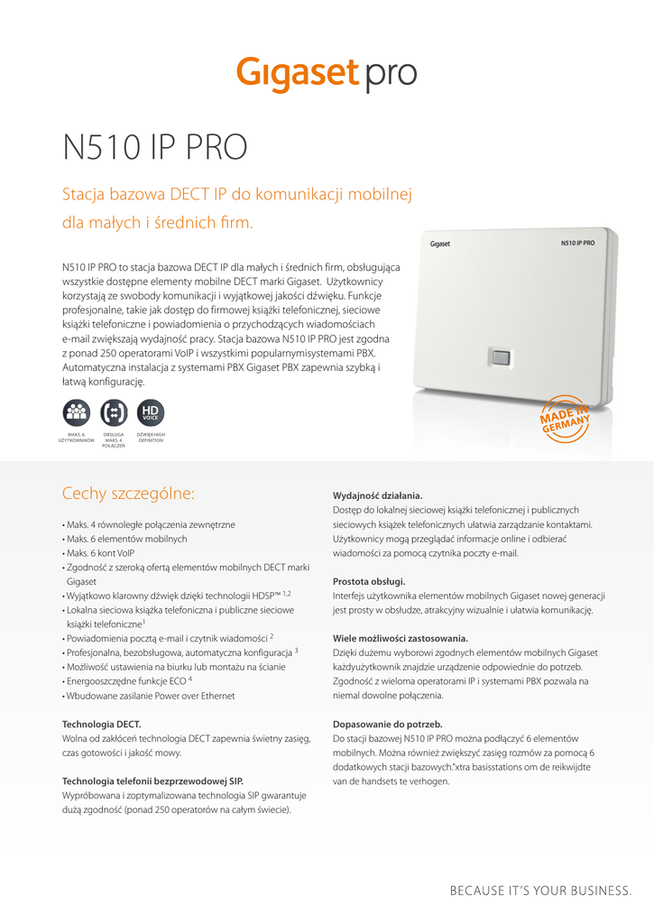 N510 IP PRO Stacja bazowa DECT IP do komunikacji mobilnej dla małych i średnich firm. N510 IP PRO to stacja bazowa DECT IP dla małych i średnich firm, obsługująca wszystkie dostępne elementy mobilne DECT marki Gigaset. Użytkownicy korzystają ze swobody komunikacji i wyjątkowej jakości dźwięku. Funkcje profesjonalne, takie jak dostęp do firmowej książki telefonicznej, sieciowe książki telefoniczne i powiadomienia o przychodzących wiadomościach e-mail zwiększają wydajność pracy. Stacja bazowa N510 IP PRO jest zgodna z ponad 250 operatorami VoIP i wszystkimi popularnymisystemami PBX. Automatyczna instalacja z systemami PBX Gigaset PBX zapewnia szybką i łatwą konfigurację. MAKS. 6 UŻYTKOWNIKÓW OBSŁUGA MAKS. 4 POŁĄCZEŃ DŹWIĘK HIGH DEFINITION Cechy szczególne: • Maks. 4 równoległe połączenia zewnętrzne • Maks. 6 elementów mobilnych • Maks. 6 kont VoIP • Zgodność z szeroką ofertą elementów mobilnych DECT marki Gigaset • Wyjątkowo klarowny dźwięk dzięki technologii HDSP™ 1,2 • Lokalna sieciowa książka telefoniczna i publiczne sieciowe książki telefoniczne1 • Powiadomienia pocztą e-mail i czytnik wiadomości 2 • Profesjonalna, bezobsługowa, automatyczna konfiguracja 3 • Możliwość ustawienia na biurku lub montażu na ścianie • Energooszczędne funkcje ECO 4 • Wbudowane zasilanie Power over Ethernet Technologia DECT. Wolna od zakłóceń technologia DECT zapewnia świetny zasięg, czas gotowości i jakość mowy. Technologia telefonii bezprzewodowej SIP. Wypróbowana i zoptymalizowana technologia SIP gwarantuje dużą zgodność (ponad 250 operatorów na całym świecie). Wydajność działania. Dostęp do lokalnej sieciowej książki telefonicznej i publicznych sieciowych książek telefonicznych ułatwia zarządzanie kontaktami. Użytkownicy mogą przeglądać informacje online i odbierać wiadomości za pomocą czytnika poczty e-mail. Prostota obsługi. Interfejs użytkownika elementów mobilnych Gigaset nowej generacji jest prosty w obsłudze, atrakcyjny wizualnie i ułatwia komunikację. Wiele możliwości zastosowania. Dzięki dużemu wyborowi zgodnych elementów mobilnych Gigaset każdyużytkownik znajdzie urządzenie odpowiednie do potrzeb. Zgodność z wieloma operatorami IP i systemami PBX pozwala na niemal dowolne połączenia. Dopasowanie do potrzeb. Do stacji bazowej N510 IP PRO można podłączyć 6 elementów mobilnych. Można również zwiększyć zasięg rozmów za pomocą 6 dodatkowych stacji bazowych.”xtra basisstations om de reikwijdte van de handsets te verhogen. N510 IP PRO Stacja bazowa DECT IP do komunikacji mobilnej dla małych i średnich firm. Profesjonalny dźwięk HD. Wyjątkowy dźwięk HDSP™1 (High Definition Sound Performance) zwiększa sprawność pracy:rewelacyjna jakość dźwięku w technologii szerokopasmowejsprawia, że połączenia brzmią jak rozmowy twarzą w twarz. Najnowocześniejsze elementy mobilne Gigaset. Użytkownicy mogą przebierać w szerokiej ofercie zgodnych elementów mobilnych Gigaset, aby wybrać te, które odpowiadają ich potrzebom. Elementy mobilne Gigaset są wygodne, nieskomplikowane i niezawodne. Najnowocześniejsza technologia, wspaniały dźwięk i nowatorskie funkcje zapewniają komfort użytkowania, a dokładne testy wykazałyniezawodność. Nowoczesny, elegancki styl pasuje idealnie do środowisk profesjonalnych. Technologia ECO DECT zmniejsza zużycie energii i moc nadawczą, dzięki czemu firmymogą przyczynić się do ochrony środowiska naturalnego. Odbieranie połączeń 2 • Automatyczne wyszukiwanie on-line 1 • Lista połączeń nieodebranych, odebranych, wykonanych • Połączenia oczekujące, przekierowywanie i przekazywanie połączeń • Zawieszanie i wznawianie połączeń • Muzyka przy oczekiwaniu • Blokowanie połączeń anonimowych • DTMF (SIP-INFO/RFC 2833) • Akustyczne sygnały postępu połączenia dla wielu krajów Integracja CTI • Z a pomocą standardowej procedury SIP jak w systemach Gigaset T440 PRO i T640 PRO • BroadSoft: wybieranie numeru i odbieranie połączenia kliknięciem 1 Poczta głosowa • Sygnalizacja SIP MWI • Klawisz dostępu Specyfikacja techniczna: • Książka telefoniczna i wybieranie numerów • Zewnętrzne sieciowe książki telefoniczne w formacie XML lub usłudze LDAP 5 • Odwrotne wyszukiwanie i automatyczne wyszukiwanie online • Wizytówki vCard • Identyfikacja rozmówców1 w przypadku połączeńprzychodzących i wychodzących • Listy nieodebranych połączeń i ponownego wybierania • Funkcja wyszukiwania • Automatyczne wybieranie prefiksu lub wybór operatora Komunikacja Flexible and scalable Funkcje PBX1, 3 • • • • • • • • • • • Poczta głosowa Połączenia konferencyjne Przekazywanie połączeń: ze sprawdzaniem, po rozmowie Zawieszanie połączeń Odrzucanie połączeń Wznawianie połączeń Oddzwanianie CLIR Połączenia oczekujące Przekierowywanie połączeń: CFU, CFNR, CFB Brak wskazania wiadomości oczekującej w razie zakończenia rozmowy gdzie indziej • Rejestr połączeń • Bezobsługowa automatyczna konfiguracja3 connectivity options with the N510 IP PRO. Funktionen mit den Gigaset Telefonanlagen 3, 5 DESKTOP PHONE • Automatyczna konfiguracja • Centralna książka telefoniczna PBX PoE NETWORK SWITCH INTERNET ACCESS GATEWAY N510 IP PRO SIP-Provider or PBX (Gigaset or other manufacturers) or GIGASET PBX T440 / T640 PRO Hosted-PBX possible. Expandable up to 6 DECT handsets GATEWAY Menu zarządzania PBX na elemencie mobilnym3, 5 Funkcje specjalne • • • • • • • • • P owiadomienia pocztą e-mail i czytnik wiadomości (POP3, POP3S) 2 • Maks. 6 kont (1 na użytkownika) • Maks. 560 znaków Internetowa usługa Info Center: pogoda, wiadomości itd. • Zwiększanie zasięgu za pomocą maks. 6 regeneratorów Gigaset Repeater • Możliwość konfiguracji sygnalizacji MWI Hotdesking Listy połączeń Ochrona poł