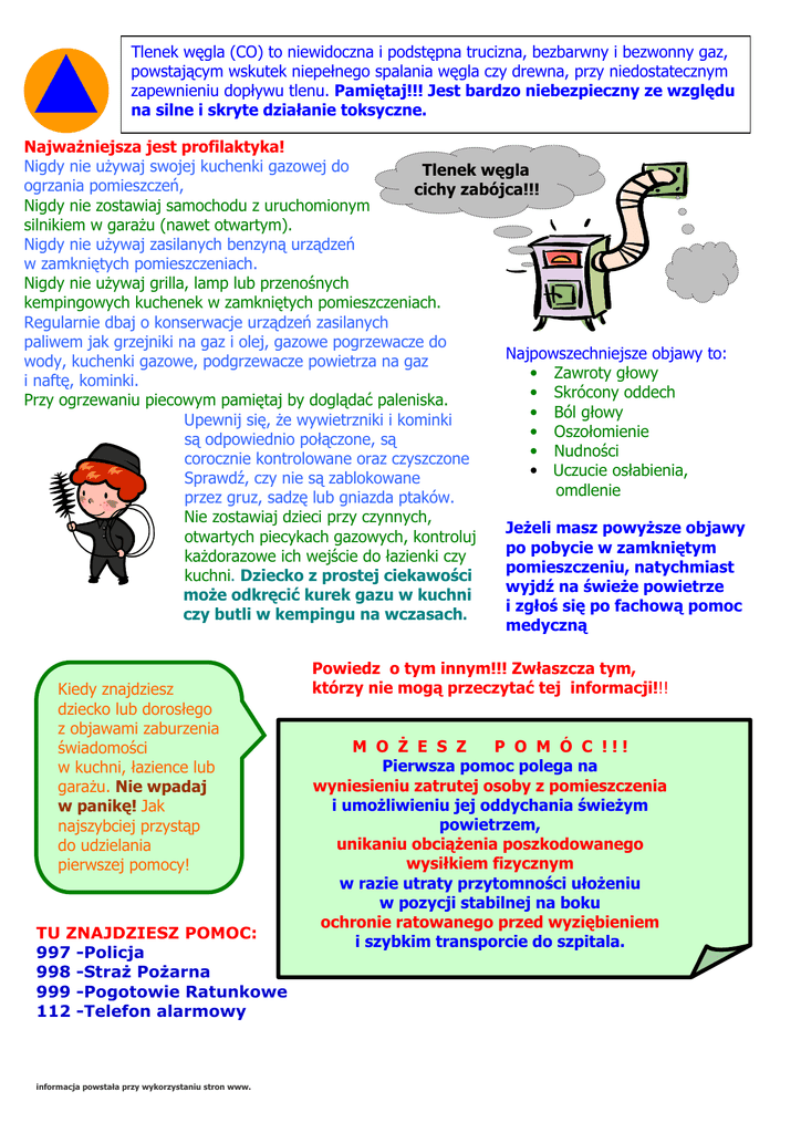 Tlenek węgla (CO) to niewidoczna i podstępna trucizna, bezbarwny i bezwonny gaz, powstającym wskutek niepełnego spalania węgla czy drewna, przy niedostatecznym zapewnieniu dopływu tlenu. Pamiętaj!!! Jest bardzo niebezpieczny ze względu na silne i skryte działanie toksyczne. Najważniejsza jest profilaktyka! Nigdy nie używaj swojej kuchenki gazowej do Tlenek węgla ogrzania pomieszczeń, cichy zabójca!!! Nigdy nie zostawiaj samochodu z uruchomionym silnikiem w garażu (nawet otwartym). Nigdy nie używaj zasilanych benzyną urządzeń w zamkniętych pomieszczeniach. Nigdy nie używaj grilla, lamp lub przenośnych kempingowych kuchenek w zamkniętych pomieszczeniach. Regularnie dbaj o konserwacje urządzeń zasilanych paliwem jak grzejniki na gaz i olej, gazowe pogrzewacze do Najpowszechniejsze objawy to: wody, kuchenki gazowe, podgrzewacze powietrza na gaz • Zawroty głowy i naftę, kominki. • Skrócony oddech Przy ogrzewaniu piecowym pamiętaj by doglądać paleniska. • Ból głowy Upewnij się, że wywietrzniki i kominki • Oszołomienie są odpowiednio połączone, są • Nudności corocznie kontrolowane oraz czyszczone • Uczucie osłabienia, Sprawdź, czy nie są zablokowane omdlenie przez gruz, sadzę lub gniazda ptaków. Nie zostawiaj dzieci przy czynnych, Jeżeli masz powyższe objawy otwartych piecykach gazowych, kontroluj po pobycie w zamkniętym każdorazowe ich wejście do łazienki czy pomieszczeniu, natychmiast kuchni. Dziecko z prostej ciekawości wyjdź na świeże powietrze może odkręcić kurek gazu w kuchni i zgłoś się po fachową pomoc czy butli w kempingu na wczasach. medyczną Kiedy znajdziesz dziecko lub dorosłego z objawami zaburzenia świadomości w kuchni, łazience lub garażu. Nie wpadaj w panikę! Jak najszybciej przystąp do udzielania pierwszej pomocy! TU ZNAJDZIESZ POMOC: 997 -Policja 998 -Straż Pożarna 999 -Pogotowie Ratunkowe 112 -Telefon alarmowy informacja powstała przy wykorzystaniu stron www. Powiedz o tym innym!!! Zwłaszcza tym, którzy nie mogą przeczytać tej informacji!!! M O Ż E S Z P O M Ó C !!! Pierwsza pomoc polega na wyniesieniu zatrutej osoby z pomieszczenia i umożliwieniu jej oddychania świeżym powietrzem, unikaniu obciążenia poszkodowanego wysiłkiem fizycznym w razie utraty przytomności ułożeniu w pozycji stabilnej na boku ochronie ratowanego przed wyziębieniem i szybkim transporcie do szpitala.