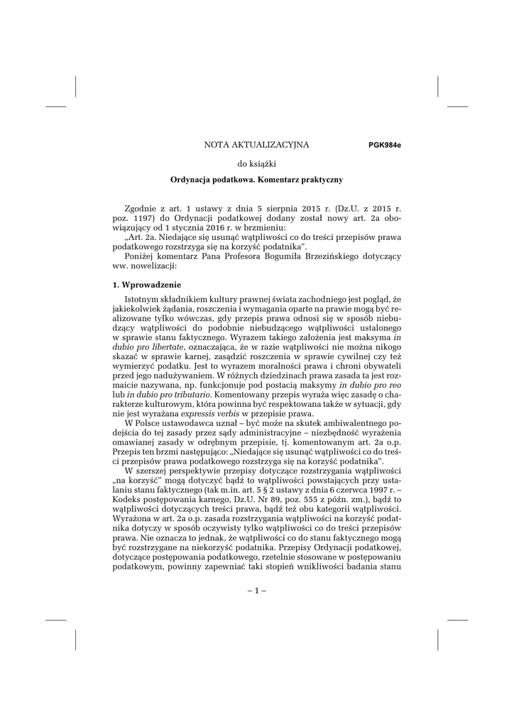 NOTA AKTUALIZACYJNA PGK984e do ksiąŜki Ordynacja podatkowa. Komentarz praktyczny Zgodnie z art. 1 ustawy z dnia 5 sierpnia 2015 r. (Dz.U. z 2015 r. poz. 1197) do Ordynacji podatkowej dodany został nowy art. 2a obowiązujący od 1 stycznia 2016 r. w brzmieniu: „Art. 2a. Niedające się usunąć wątpliwości co do treści przepisów prawa podatkowego rozstrzyga się na korzyść podatnika”. PoniŜej komentarz Pana Profesora Bogumiła Brzezińskiego dotyczący ww. nowelizacji: 1. Wprowadzenie Istotnym składnikiem kultury prawnej świata zachodniego jest pogląd, Ŝe jakiekolwiek Ŝądania, roszczenia i wymagania oparte na prawie mogą być realizowane tylko wówczas, gdy przepis prawa odnosi się w sposób niebudzący wątpliwości do podobnie niebudzącego wątpliwości ustalonego w sprawie stanu faktycznego. Wyrazem takiego załoŜenia jest maksyma in dubio pro libertate, oznaczająca, Ŝe w razie wątpliwości nie moŜna nikogo skazać w sprawie karnej, zasądzić roszczenia w sprawie cywilnej czy teŜ wymierzyć podatku. Jest to wyrazem moralności prawa i chroni obywateli przed jego naduŜywaniem. W róŜnych dziedzinach prawa zasada ta jest rozmaicie nazywana, np. funkcjonuje pod postacią maksymy in dubio pro reo lub in dubio pro tributario. Komentowany przepis wyraŜa więc zasadę o charakterze kulturowym, która powinna być respektowana takŜe w sytuacji, gdy nie jest wyraŜana expressis verbis w przepisie prawa. W Polsce ustawodawca uznał – być moŜe na skutek ambiwalentnego podejścia do tej zasady przez sądy administracyjne – niezbędność wyraŜenia omawianej zasady w odrębnym przepisie, tj. komentowanym art. 2a o.p. Przepis ten brzmi następująco: „Niedające się usunąć wątpliwości co do treści przepisów prawa podatkowego rozstrzyga się na korzyść podatnika”. W szerszej perspektywie przepisy dotyczące rozstrzygania wątpliwości „na korzyść” mogą dotyczyć bądź to wątpliwości powstających przy ustalaniu stanu faktycznego (tak m.in. art. 5 § 2 ustawy z dnia 6 czerwca 1997 r. – Kodeks postępowania karnego, Dz.U. Nr 89, poz. 555 z późn. zm.), bądź to wątpliwości dotyczących treści prawa, bądź teŜ obu kategorii wątpliwości. WyraŜona w art. 2a o.p. zasada rozstrzygania wątpliwości na korzyść podatnika dotyczy w sposób oczywisty tylko wątpliwości co do treści przepisów prawa. Nie oznacza to jednak, Ŝe wątpliwości co do stanu faktycznego mogą być rozstrzygane na niekorzyść podatnika. Przepisy Ordynacji podatkowej, dotyczące postępowania podatkowego, rzetelnie stosowane w postępowaniu podatkowym, powinny zapewniać taki stopień wnikliwości badania stanu –1– faktycznego, który doprowadzi do ustalenia, jakie fakty w sprawie miały miejsce, a jakie nie zaistniały. Nie powinno tu być miejsca na tłumaczenie (rozstrzyganie) wątpliwości na niekorzyść podatnika – chociaŜby ze względu na to, Ŝe Rzeczpospolita Polska jest demokratycznym państwem prawnym (art. 2 Konstytucji RP). 2. Adresaci normy z art. 2a o.p. Przepis nie wskazuje wyraźnie adresatów normy wynikającej z art. 2a o.p.; nie ma jednak takiej potrzeby. Milczenie ustawodawcy oznacza bowiem, Ŝe przepis ma zastosowanie powszechne – moŜe oprzeć się na nim podatnik, obliczając podatek w deklaracji podatkowej, powinien go respektować organ podatkowy weryfikujący poprawność deklaracji, wydający decyzję określającą lub ustalającą zobowiązanie podatkowe i wreszcie sąd administracyjny badający, czy decyzja podatkowa została wydana na podstawie ustalonego w sposób niebudzący wątpliwości znaczenia przepisu prawa podatkowego. To, czy przepis art. 2a o.p. został prawidłowo przez uczestników dyskursu prawniczego zastosowany, podlega weryfikacji na ogólnych zasadach. I tak, jeśli podatnik wybrał znaczenie przepisu mniej przekonujące (odwołując się do wątpliwości, jakie go ogarnęły przy interpretacji przepisu, organ podatkowy moŜe zakwestionować stanowisko podatnika, przyjmując inne niŜ podatnik znaczenie przepisu i w konsekwencji stając na stanowisku, Ŝe przepis niedających się usunąć wątpliwości nie budzi. Z kolei stanowisko organu podatkowego w kontekście niestosowalności w konkretnej sprawie art. 2a o.p. moŜe być weryfikowane w trybie skargi na decyzję ostateczną organu podatkowego. Reasumując, nowy przepis nie zakłóci logiki dyskursu prawniczego i sporów, w ramach jakich dyskurs ten przebiega. Zmieni się tylko jedno – jeśli w sporach podatkowych podatnik powoła się na istnienie niedających się rozstrzygnąć wątpliwości interpretacyjnych, to ani organ podatkowy, ani teŜ sąd – jak to w przeszłości nierzadko miało miejsce – nie będzie mógł stwierdzić, Ŝe zasada rozstrzygania wątpliwości na korzyść podatnika nie istnieje albo Ŝe nie ma przepisu, który taką zasadę by wyraŜał. Organ podatkowy lub sąd administracyjny moŜe oczywiście uznać, Ŝe w konkretnym stanie faktycznym przepisy nie budzą wątpliwości i orzec nie po myśli podatnika. Warunkiem sine qua non poprawności takiego rozstrzygnięcia będzie jednak przeanalizowanie w uzasadnieniu decyzji (wyroku) argumentacji podatnika. Nie wystarczy – tak jak to częstokroć dotychczas bywało – pokazanie w uzasadnieniu argumentacji prowadzącej do zapadłego następnie orzeczenia. Niezbędne będzie wykazanie, Ŝe podatnik, wysuwając inną argumentację i konkludując istnienie niedających się usunąć wątpliwości, nie miał racji (powoływał nieadekwatne do stanu faktycznego przepisy, przyjmował błędne załoŜenia interpretacyjne, mylił się w rozumowaniu bądź teŜ jego argumentacja była na tyle słaba w zestawieniu z argumentacją –2– przeciwną, Ŝe nie moŜna uznać istnienia niedających się usunąć wątpliwości). Stąd teŜ z punktu widzenia ochrony interesów podatnika i wykorzystania do tego celu moŜliwości, jakie daje art. 2a o.p., szczególnie waŜne stanie si