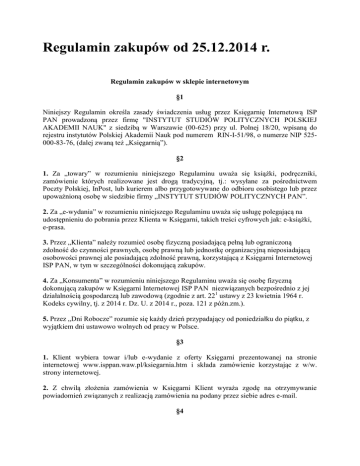 Regulamin zakupów od 25.12.2014 r. Regulamin zakupów w sklepie internetowym §1 Niniejszy Regulamin określa zasady świadczenia usług przez Księgarnię Internetową ISP PAN prowadzoną przez firmę "INSTYTUT STUDIÓW POLITYCZNYCH POLSKIEJ AKADEMII NAUK" z siedzibą w Warszawie (00-625) przy ul. Polnej 18/20, wpisaną do rejestru instytutów Polskiej Akademii Nauk pod numerem RIN-I-51/98, o numerze NIP 525000-83-76, (dalej zwaną też „Księgarnią”). §2 1. Za „towary” w rozumieniu niniejszego Regulaminu uważa się książki, podręczniki, zamówienie których realizowane jest drogą tradycyjną, tj.: wysyłane za pośrednictwem Poczty Polskiej, InPost, lub kurierem albo przygotowywane do odbioru osobistego lub przez upoważnioną osobę w siedzibie firmy „INSTYTUT STUDIÓW POLITYCZNYCH PAN”. 2. Za „e-wydania” w rozumieniu niniejszego Regulaminu uważa się usługę polegającą na udostępnieniu do pobrania przez Klienta w Księgarni, takich treści cyfrowych jak: e-książki, e-prasa. 3. Przez „Klienta” należy rozumieć osobę fizyczną posiadającą pełną lub ograniczoną zdolność do czynności prawnych, osobę prawną lub jednostkę organizacyjną nieposiadającą osobowości prawnej ale posiadającą zdolność prawną, korzystającą z Księgarni Internetowej ISP PAN, w tym w szczególności dokonującą zakupów. 4. Za „Konsumenta” w rozumieniu niniejszego Regulaminu uważa się osobę fizyczną dokonującą zakupów w Księgarni Internetowej ISP PAN niezwiązanych bezpośrednio z jej działalnością gospodarczą lub zawodową (zgodnie z art. 221 ustawy z 23 kwietnia 1964 r. Kodeks cywilny, tj. z 2014 r. Dz. U. z 2014 r., poza. 121 z późn.zm.). 5. Przez „Dni Robocze” rozumie się każdy dzień przypadający od poniedziałku do piątku, z wyjątkiem dni ustawowo wolnych od pracy w Polsce. §3 1. Klient wybiera towar i/lub e-wydanie z oferty Księgarni prezentowanej na stronie internetowej www.isppan.waw.pl/ksiegarnia.htm i składa zamówienie korzystając z w/w. strony internetowej. 2. Z chwilą złożenia zamówienia w Księgarni Klient wyraża zgodę na otrzymywanie powiadomień związanych z realizacją zamówienia na podany przez siebie adres e-mail. §4 1. Cena towaru wyświetlana przy tytule lub nazwie danej pozycji nie obejmuje opłaty za dostawę. Koszt dostawy zostanie doliczony do wartości zakupionego towaru. Na ostateczny koszt zamówienia składają się cena towaru i opłata za przesyłkę. 2. Koszt dostawy nie jest doliczany do e-wydań. §5 1. Księgarnia dokłada najwyższej staranności, aby informacje o towarach i e-wydaniach jak najdokładniej odpowiadały rzeczywistości. 2. O ile wyraźnie nie zaznaczono inaczej, informacje o towarach i e-wydaniach podawane na stronach Księgarni stanowią zaproszenie do zawarcia umowy w rozumieniu przepisów Kodeksu Cywilnego. §6 Warunkiem realizacji zamówienia jest: a) jego potwierdzenie przez Księgarnię, dokonane e-mailem przesłanym na adres podany przez Klienta, zawierające informacją o przyjęciu zamówienia, oraz b) potwierdzenie złożenia zamówienia przez Klienta dokonane na wskazany link w otrzymanej wiadomości (email) z Księgarni, a dodatkowo, z uwzględnieniem § 16 niniejszego Regulaminu, w przypadku dokonania wyboru sposobu płatności przez przelew bankowy, albo w razie złożenia zamówienia dotyczącego e-wydania, wpłynięcie całej należnej kwoty (ceny) na konto Księgarni. §7 W przypadku braku potwierdzenia zamówienia ze strony Księgarni w ciągu dwóch dni roboczych od dnia jego złożenia, należy powiadomić Księgarnię za pośrednictwem poczty email lub telefonicznie, odpowiednio na adres: [email protected], lub pod numerem tel.: (22) 825-52-21 w. 115. §8 1. Zamówienia są realizowane zgodnie z kolejnością ich otrzymywania, do momentu wyczerpania zapasów towarów w magazynie lub dostępności e-wydań na platformie dystrybutora, z usług którego korzysta Księgarnia. 2. Przewidywany czas przygotowania zamówienia do wysyłki wynosi do max 48 godzin, jednakże Księgarnia podejmuje wszelkie kroki, aby zrealizować zamówienie w najkrótszym możliwym czasie. Jest to czas, który rozpoczyna się z dniem złożenia zamówienia przez Klienta i kończy się z dniem przekazania zamówienia z Księgarni do przewoźnika realizującego dostawę. Czas ten uwzględnia tylko Dni Robocze. 3. Przewidywany czas oraz koszt dostawy określony jest przez aktualnie obowiązujący taryfikator Poczty Polskiej lub innego przewoźnika realizującego dostawę. §9 O niedostępności jakiegokolwiek zamówionego tytułu Księgarnia powiadamia za pomocą poczty elektronicznej lub telefonicznie. §10 Na życzenie Klienta Księgarnia może podzielić zamówienie na kilka partii, każdorazowo pobierając od Klienta koszty przesyłki danej partii zamówienia. §11 1. Jeśli zamówienie obejmuje łącznie towary oraz e-wydania, dzielone jest ono na dwa odrębne koszyki i realizowane jest w dwóch odrębnych trybach. 2. E-wydania są gotowe do odbioru (pobrania) w momencie zaksięgowania wpłaty w Księgarni. 3. Towary wysyłane są zgodnie w czasie do 48 godzin. §12 Z uwagi na to, że towary i e-wydania traktowane są jako osobne zamówienia to ich łączne zamawianie nie skutkuje kumulacją łącznej wartości zamówienia, wartości e-wydań nie wlicza się do wartości zamówienia (dotyczącego towarów). §13 Zamówienie na towary zostanie zrealizowane w zależności od informacji o dostępności, która znajduje się przy każdym produkcie plus czas dostawy (średni czas oczekiwania na przesyłkę 5 dni). W przypadku trudności z realizacją zamówienia, Klient zostanie o tym niezwłocznie poinformowany. §14 Zamówienie na towary zostanie zrealizowane, jeżeli będzie zawierało dane odbiorcy (imię i nazwisko w przypadku osoby fizycznej lub nazwę w przypadku osoby prawnej albo jednostki organizacyjnej nieposiadającej osobowości prawnej), a także adres i telefon o