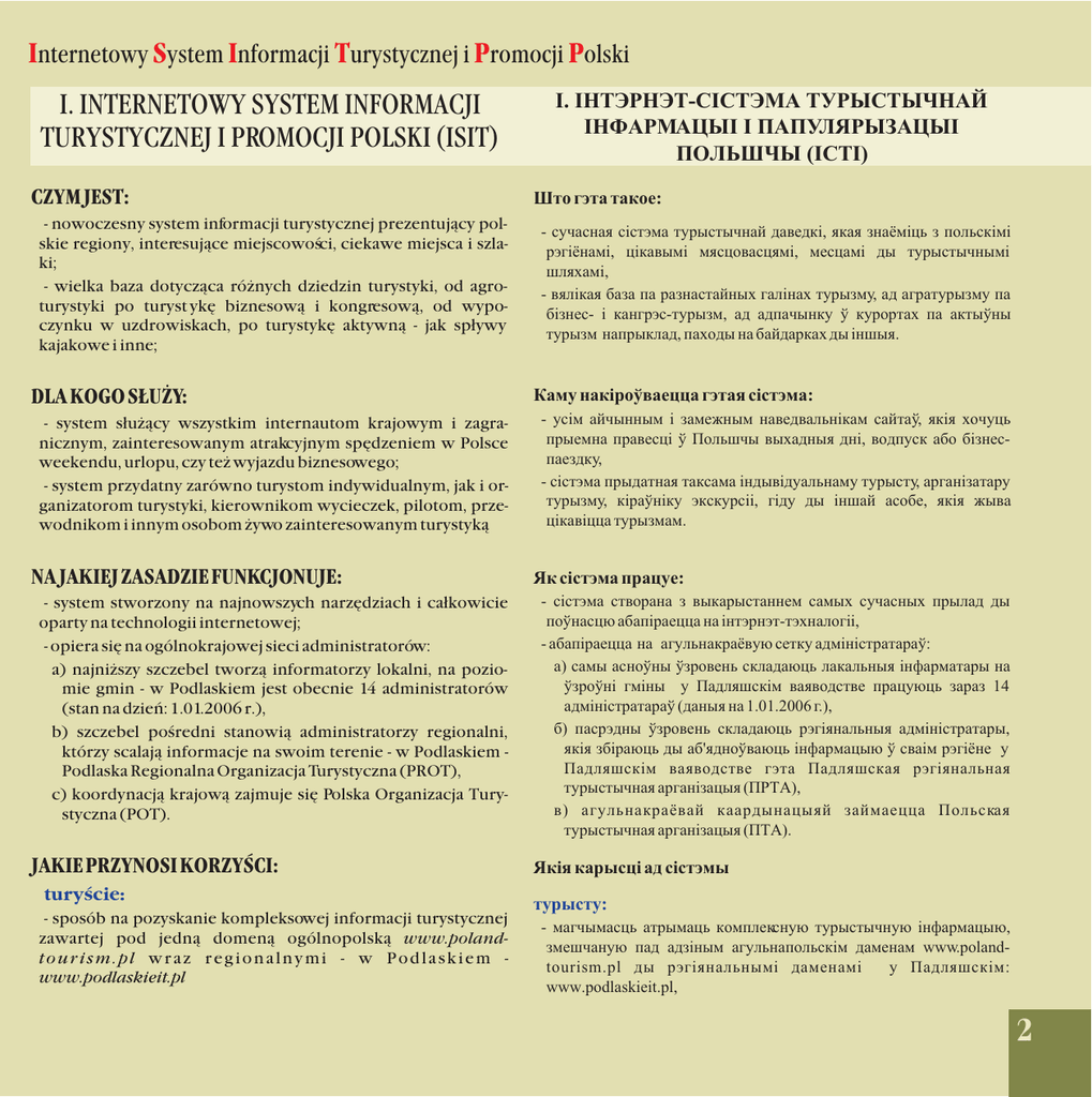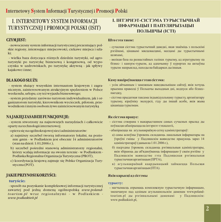 Internetowy System Informacji Turystycznej i Promocji Polski I. INTERNETOWY SYSTEM INFORMACJI TURYSTYCZNEJ I PROMOCJI POLSKI (ISIT) CZYM JEST: - nowoczesny system informacji turystycznej prezentuj¹cy polskie regiony, interesuj¹ce miejscowoœci, ciekawe miejsca i szlaki; - wielka baza dotycz¹ca ró¿nych dziedzin turystyki, od agroturystyki po turyst ykê biznesow¹ i kongresow¹, od wypoczynku w uzdrowiskach, po turystykê aktywn¹ - jak sp³ywy kajakowe i inne; DLA KOGO S£U¯Y: - system s³u¿¹cy wszystkim internautom krajowym i zagranicznym, zainteresowanym atrakcyjnym spêdzeniem w Polsce weekendu, urlopu, czy te¿ wyjazdu biznesowego; - system przydatny zarówno turystom indywidualnym, jak i organizatorom turystyki, kierownikom wycieczek, pilotom, przewodnikom i innym osobom ¿ywo zainteresowanym turystyk¹ NA JAKIEJ ZASADZIE FUNKCJONUJE: - system stworzony na najnowszych narzêdziach i ca³kowicie oparty na technologii internetowej; - opiera siê na ogólnokrajowej sieci administratorów: a) najni¿szy szczebel tworz¹ informatorzy lokalni, na poziomie gmin - w Podlaskiem jest obecnie 14 administratorów (stan na dzieñ: 1.01.2006 r.), b) szczebel poœredni stanowi¹ administratorzy regionalni, którzy scalaj¹ informacje na swoim terenie - w Podlaskiem Podlaska Regionalna Organizacja Turystyczna (PROT), c) koordynacj¹ krajow¹ zajmuje siê Polska Organizacja Turystyczna (POT). JAKIE PRZYNOSI KORZYŒCI: turyœcie: - sposób na pozyskanie kompleksowej informacji turystycznej zawartej pod jedn¹ domen¹ ogólnopolsk¹ www.polandtourism.pl wraz regionalnymi - w Podlaskiem www.podlaskieit.pl I. ²ÍÒÝÐÍÝÒ-ѲÑÒÝÌÀ ÒÓÐÛÑÒÛ×ÍÀÉ ²ÍÔÀÐÌÀÖÛ² ² ÏÀÏÓËßÐÛÇÀÖÛ² ÏÎËÜØ×Û (²ÑÒ²) Øòî ãýòà òàêîå: - ñó÷àñíàÿ ñ³ñòýìà òóðûñòû÷íàé äàâåäê³, ÿêàÿ çíà¸ì³öü ç ïîëüñê³ì³ ðý㳸íàì³, ö³êàâûì³ ìÿñöîâàñöÿì³, ìåñöàì³ äû òóðûñòû÷íûì³ øëÿõàì³, - âÿë³êàÿ áàçà ïà ðàçíàñòàéíûõ ãàë³íàõ òóðûçìó, àä àãðàòóðûçìó ïà á³çíåñ- ³ êàíãðýñ-òóðûçì, àä àäïà÷ûíêó ¢ êóðîðòàõ ïà àêòû¢íû òóðûçì íàïðûêëàä, ïàõîäû íà áàéäàðêàõ äû ³íøûÿ. Êàìó íàê³ðî¢âàåööà ãýòàÿ ñ³ñòýìà: - óñ³ì àé÷ûííûì ³ çàìåæíûì íàâåäâàëüí³êàì ñàéòà¢, ÿê³ÿ õî÷óöü ïðûåìíà ïðàâåñö³ ¢ Ïîëüø÷û âûõàäíûÿ äí³, âîäïóñê àáî á³çíåñïàåçäêó, - ñ³ñòýìà ïðûäàòíàÿ òàêñàìà ³íäûâ³äóàëüíàìó òóðûñòó, àðãàí³çàòàðó òóðûçìó, ê³ðà¢í³êó ýêñêóðñ³³, ã³äó äû ³íøàé àñîáå, ÿê³ÿ æûâà ö³êàâ³ööà òóðûçìàì. ßê ñ³ñòýìà ïðàöóå: - ñ³ñòýìà ñòâîðàíà ç âûêàðûñòàííåì ñàìûõ ñó÷àñíûõ ïðûëàä äû ïî¢íàñöþ àáàï³ðàåööà íà ³íòýðíýò-òýõíàëîã³³, - àáàï³ðàåööà íà àãóëüíàêðà¸âóþ ñåòêó àäì³í³ñòðàòàðà¢: à) ñàìû àñíî¢íû ¢çðîâåíü ñêëàäàþöü ëàêàëüíûÿ ³íôàðìàòàðû íà ¢çðî¢í³ ãì³íû ó Ïàäëÿøñê³ì âàÿâîäñòâå ïðàöóþöü çàðàç 14 àäì³í³ñòðàòàðࢠ(äàíûÿ íà 1.01.2006 ã.), á) ïàñðýäíû ¢çðîâåíü ñêëàäàþöü ðýã³ÿíàëüíûÿ àäì³í³ñòðàòàðû, ÿê³ÿ çá³ðàþöü äû àá'ÿäíî¢âàþöü ³íôàðìàöûþ ¢ ñâà³ì ðý㳸íå ó Ïàäëÿøñê³ì âàÿâîäñòâå ãýòà Ïàäëÿøñêàÿ ðýã³ÿíàëüíàÿ òóðûñòû÷íàÿ àðãàí³çàöûÿ (ÏÐÒÀ), â) àãóëüíàêðà¸âàé êààðäûíàöûÿé çàéìàåööà Ïîëüñêàÿ òóðûñòû÷íàÿ àðãàí³çàöûÿ (ÏÒÀ). ßê³ÿ êàðûñö³ àä ñ³ñòýìû òóðûñòó: - ìàã÷ûìàñöü àòðûìàöü êîìïëåêñíóþ òóðûñòû÷íóþ ³íôàðìàöûþ, çìåø÷àíóþ ïàä àäç³íûì àãóëüíàïîëüñê³ì äàìåíàì www.polandtourism.pl äû ðýã³ÿíàëüíûì³ äàìåíàì³ ó Ïàäëÿøñê³ì: www.podlaskieit.pl, 2 ²íòýðíýò-ѳñòýìà Òóðûñòû÷íàé ³íôàðìàöû³ ³ Ïàïóëÿðûçàöû³ Ïîëüø÷û - informacja dostêpna przez 24h/7dni/tyg. równie¿ za pomoc¹ tzw. kiosku informacyjnego potencjalnemu administratorowi lokalnemu ISIT: - promocja danego obszaru gminy, powiatu; - zwiêkszenie atrakcyjnoœci turystycznej danego obszaru; - szansa na zwiêkszenie iloœci turystów na danym terenie, a co za tym idzie dochodów z turystyki; ïàòýíöûéíàìó ëàêàëüíàìó àäì³í³ñòðàòàðó ²ÑÒ²: w ujêciu wojewódzkim (regionalnym): - zwiêkszenie atrakcyjnoœci i konkurencyjnoœci turystycznej województwa na rynku polskim i zagranicznym jako atrakcyjnego regionu turystycznego; - promocja i eksponowanie specyficznych, unikatowych w skali kraju i Europy walorów przyrodniczych i etniczno - kulturowych; - zwiêkszenie ruchu turystycznego; - stworzenie korzystnych warunków dla rozwoju ma³ej i œredniej przedsiêbiorczoœci turystycznej; - przyci¹gniêcie kapita³u krajowego i zagranicznego. - wykreowanie atrakcyjnego wizerunku województwa jako atrakcyjnego w kraju i na œwiecie regionu turystycznego; - rozwój turystyki transgranicznej i miêdzynarodowej - rozwój kontaktów i wymiany informacji z przygranicznymi obszarami Litwy i Bia³orusi ó âàÿâîäñê³ì (ðýã³ÿíàëüíûì) êàíòýêñöå: - ïàïóëÿðûçàöûÿ äàäçåíàé òýðûòîðû³ ãì³íû, ïàâåòó, - ïàâûøýííå òóðûñòû÷íàé ïðûöÿãàëüíàñö³ äàäçåíàé òýðûòîðû³, - 