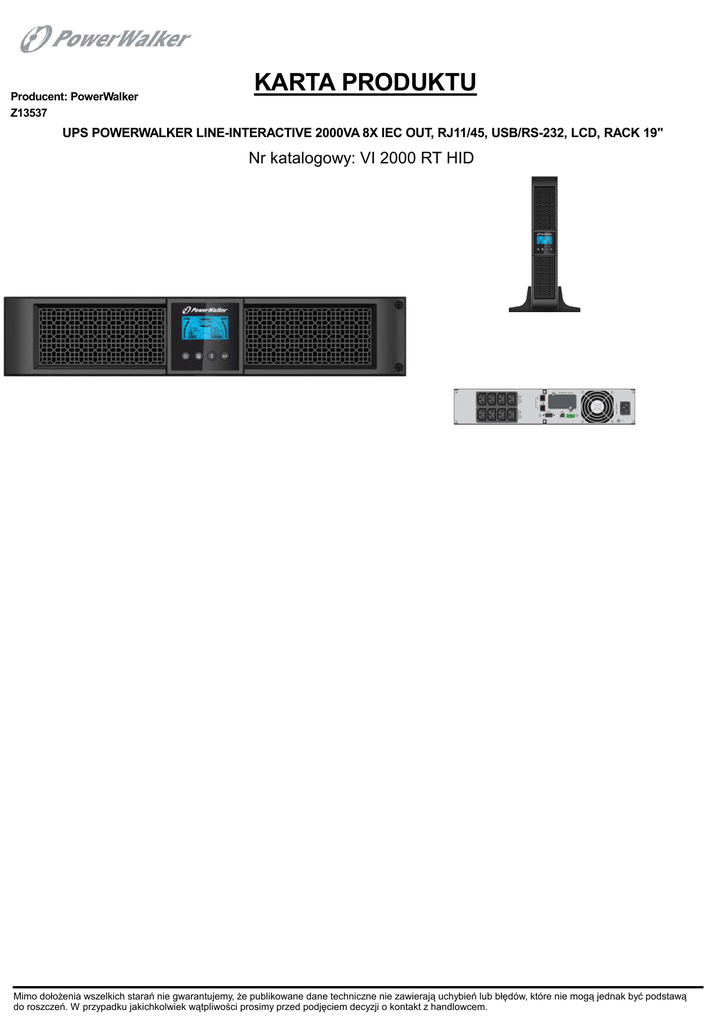 Producent: PowerWalker Z13537 KARTA PRODUKTU UPS POWERWALKER LINE-INTERACTIVE 2000VA 8X IEC OUT, RJ11/45, USB/RS-232, LCD, RACK 19" Nr katalogowy: VI 2000 RT HID Mimo dołożenia wszelkich starań nie gwarantujemy, że publikowane dane techniczne nie zawierają uchybień lub błędów, które nie mogą jednak być podstawą do roszczeń. W przypadku jakichkolwiek wątpliwości prosimy przed podjęciem decyzji o kontakt z handlowcem. Opis produktu Power Walker VI 2000RT HID LCD to zaawansowany UPS Line-Interactive charakteryzujący się czystą falą sinusoidalną i wysokim współczynnikiem mocy wyjściowej 0.9. Oferuje on pełną ochronę dla serwerów, switchy, centrali telefonicznych, kamery IP, nadaje się również do zastosowań przemysłowych. Jego wysokość to zaledwie 2U. UPS może być instalowany w szafie 19 " (uszy montażowe w zestawie), posiada również podstawki do instalacji w pozycji Pionowej (Tower). HID jest podstawowym sterownikiem do monitoringu statusu urządzeń wykorzystywanym od lat w systemach Windows, Mac OS, Linux. Port USB HID umożliwia komunikację z podłączonymi urządzeniami bez instalacji dodatkowego oprogramowania. Do zarządzania zasilaniem awaryjnym wykorzystywane są opcje zasilania awaryjnego w menu systemu operacyjnego, dzięki temu komputer stacjonarny zachowuje się jak laptop z podłączoną baterią. Seria ta jest najlepszym wyborem dla urządzeń w których nie mamy możliwości instalacji dodatkowego oprogramowania np. NAS, niektóre rejestratory cyfrowe, kioski fotograficzne czy bankomaty. - 2000VA Line-Interactive UPS tower/19” rack - Czysta fala sinusoidalna o współczynniku mocy wyjściowej 0.9 - 8x IEC C13, RJ-11/RJ-45 (in/out) - Wbudowany wyświetlacz LCD, możliwość zmiany ułożenia wyświetlacza (Pionowy/Poziomy) - Sygnalizacja błędów na wyświetlaczu – niebieski, czerwony, czerwony migający – w zależności od statusu UPS - Programowalne gniazda ICE C13 – 4 gniazda - Funkcja EPO (Emergency power off) - Automatyczny system diagnostyki UPS - Skrócony czas ładowania - Wbudowany układ stabilizacji napięcia AVR - Automatyczny restart po przywróceniu zasilania sieciowego - Ładowanie w trybie wyłączonym - Funkcja "zimnego startu" - Port komunikacyjny USB/RS-232 - Oprogramowanie do monitorowania pracy UPS - WinPower Software - w języku Polskim - Ochrona przeciwprzepięciowa RJ-11/RJ-45 - Funkcja oszczędzania energii (możliwość wyłączenia w oprogramowaniu) Oprogramowanie: WinPower - Możliwość kontrolowania i monitorowania wielu jednostek UPS z sieci lokalnej i Internetu - Wykresy analizy mocy, statystyki zdarzeń, eksport historii danych - Wykres danych jednostki UPS w czasie rzeczywistym (napięcie, częstotliwość, poziom obciążenia, poziom naładowania baterii) - Bezpieczne wyłączenie systemu i ochrona danych przed awarią zasilania - Powiadomienia za pomocą dźwięków systemowych, e-mail, SMS, do wszystkich komputerów w sieci LAN - Harmonogram włączenia/wyłączenia, test baterii, programowana kontrola gniazda, kontrola alarmów dźwiękowych. - Ochrona dostępu hasłem, dostęp zdalny i zarządzanie - Obsługa wielu języków: Angielski, Chiński, Francuski, Niemiecki, Hiszpański, Rosyjski, Portugalski, Ukraiński, Włoski, Polski, Czeski, Turecki - System operacyjny: Windows/MAC/Linux/Unix/Solaris/AJX/HP-UX/FreeBSD szczegóły pod adresem: - http://www.powerwalker.com/winpower.html Opcjonalne akcesoria: - Szyny montażowe 19": 10120529 - Karta NMC (moduł SNMP): 10120517 - Karta AS/400: 10120527 - Pakiet baterii (Battery Pack): 10134012 Cechy produktu Długość [mm] 608,00 Szerokość [mm] 438,00 Wysokość [mm] 86,50 Obsługiwane systemy operacyjne Win. 98; Win. 2000; Win. XP; Win. Vista; Win. 7; Win. 8; MAC; Linux; FreeBSD; Solaris Złącza USB 2.0; RS-232 Moc [W] 1 800,00 Moc pozorna [VA] 2 000,00 Napięcie wejściowe [VAC] 230,00 Zakres napięcia wejściowego [VAC] od 0,00 do 300,00 Zakres częstotliwości wejściowej [Hz] od 50,00 do 60,00 Napięcie wyjściowe [V] 230,00 Regulacja napięcia wyjściowego [%] +/- 5 Regulacja częstotliwości wyjściowej [Hz] +/- 0,1 Postać fali Sinusoida Liczba baterii 6,00 Czas ładowania baterii [H] 4,00 Gniazda wyjściowe IEC C13 (10A)x8 Gniazdo rozszerzeń Tak Awaryjne wyłączenie (EPO) Tak Zabezpieczenie przeciwprzepięciowe Tak Kolor Czarny Poziom hałasu [dB] 45,00 Zalecana temperatura otoczenia [°C] od 0,00 do 40,00 Zalecana wilgotność otoczenia [%] od 20,00 do 80,00 Maksymalny czas przełączania [ms] 10,00 Oprogramowanie WinPower Częstotliwość wyjściowa [Hz] 50,00 Kontrola wentylacji Nie Pojemność baterii [Ah] 7,00 Liczba gniazd rozszerzeń 1,00 Napięcie baterii [V] 12,00 Waga baterii [kg] 12,36 Czas podtrzymania przy 50% obciążeniu [min] 10,00 Czas podtrzymania przy 100% obciążeniu [min] 4,00 Czas transferu [ms] od 2,00 do 6,00 Dane logistyczne EAN 4260074974324 Szerokość sztuki [cm] 58,50 Wysokość sztuki [cm] 23,00 Długość sztuki [cm] 78,50 Waga sztuki [kg] 31.50000 Stawka VAT [%] 23,00 % Gwarancja 24 Kraj pochodzenia Chiny Kod celny 85044030 Mimo dołożenia wszelkich starań nie gwarantujemy, że publikowane dane techniczne nie zawierają uchybień lub błędów, które nie mogą jednak być podstawą do roszczeń. W przypadku jakichkolwiek wątpliwości prosimy przed podjęciem decyzji o kontakt z handlowcem.