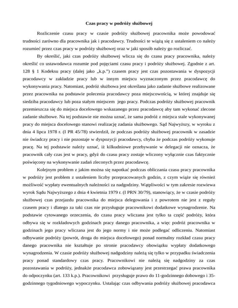 Czas pracy w podróży służbowej Rozliczenie czasu pracy w czasie podróży służbowej pracownika może powodować trudności zarówno dla pracownika jak i pracodawcy. Trudności te wiążą się z ustaleniem co należy rozumieć przez czas pracy w podróży służbowej oraz w jaki sposób należy go rozliczać. By określić, jaki czas podróży służbowej wlicza się do czasu pracy pracownika, należy określić co ustawodawca rozumie pod pojęciami czasu pracy i podróży służbowej. Zgodnie z art. 128 § 1 Kodeksu pracy (dalej jako „k.p.”) czasem pracy jest czas pozostawania w dyspozycji pracodawcy w zakładzie pracy lub w innym miejscu wyznaczonym przez pracodawcę do wykonywania pracy. Natomiast, podróż służbowa jest określana jako zadanie służbowe realizowane przez pracownika na podstawie polecenia pracodawcy poza miejscowością, w której znajduje się siedziba pracodawcy lub poza stałym miejscem jego pracy. Podczas podróży służbowej pracownik przemieszcza się do miejsca docelowego wskazanego przez pracodawcę aby tam wykonać zlecone zadanie służbowe. Na tej podstawie nie można uznać, że sama podróż z miejsca stale wykonywanej pracy do miejsca docelowego stanowi realizację zadania służbowego. Sąd Najwyższy, w wyroku z dnia 4 lipca 1978 r. (I PR 45/78) stwierdził, że podczas podróży służbowej pracownik w zasadzie nie świadczy pracy i nie pozostaje w dyspozycji pracodawcy, chyba że podczas podróży wykonuje pracę. Na tej podstawie należy uznać, iż kilkudniowe przebywanie w delegacji nie oznacza, że pracownik cały czas jest w pracy, gdyż do czasu pracy zostaje wliczony wyłącznie czas faktycznie poświęcony na wykonywanie zadań zleconych przez pracodawcę. Kolejnym problem z jakim można się napotkać podczas obliczania czasu pracy pracownika w podróży jest problem z ustaleniem liczby przepracowanych godzin, z czym wiąże się również możliwość wypłaty ewentualnych należności za nadgodziny. Wątpliwości w tym zakresie rozwiewa wyrok Sądu Najwyższego z dnia 4 kwietnia 1979 r. (I PRN 30/79), stanowiący, że w czasie podróży służbowej czas przejazdu pracownika do miejsca delegowania i z powrotem nie jest z reguły czasem pracy i dlatego za taki czas nie przysługuje pracownikowi dodatkowe wynagrodzenie. Na podstawie cytowanego orzeczenia, do czasu pracy wliczana jest tylko ta część podróży, która odbywa się w rozkładowych godzinach pracy danego pracownika, a więc podróż pracownika w godzinach jego pracy wliczana jest do jego normy i nie może podlegać odliczeniu. Natomiast odbywanie podróży (powrót, droga do miejsca docelowego) ponad normalny rozkład czasu pracy danego pracownika nie kształtuje po stronie pracodawcy obowiązku wypłaty dodatkowego wynagrodzenia. W czasie podróży służbowej nadgodziny należą się tylko w przypadku świadczenia pracy ponad standardowy czas pracy. Pracownikowi nie należą się nadgodziny za czas pozostawania w podróży, jednakże pracodawca zobowiązany jest przestrzegać prawa pracownika do odpoczynku (art. 133 k.p.). Pracownikowi przysługuje prawo do 11-godzinnego dobowego i 35godzinnego tygodniowego wypoczynku. Ustalając czas odbywania podróży służbowej pracodawca zobowiązany jest uwzględnić prawo pracownika do odpoczynku. Zatem, jeżeli czas spędzony w podróży narusza ustaloną w Kodeksie pracy normę nieprzerwanego odpoczynku, wówczas pracownikowi należą się dni wolne lub dodatkowe wynagrodzenie. Warto w tym momencie przytoczyć wyrok Sądu Najwyższego z 23 czerwca 2005 r. (II PK 265/04), w którym Sąd Najwyższy stwierdził, że czas dojazdu i powrotu z miejscowości stanowiącej cel pracowniczej podróży służbowej oraz czas pobytu w tej miejscowości nie są pozostawaniem do dyspozycji pracodawcy w miejscu wyznaczonym do wykonywania pracy, lecz w zakresie przypadającym na godziny normalnego rozkładu czasu pracy podlegają wliczeniu do jego normy (nie mogą być od niej odliczone), natomiast w zakresie wykraczającym poza rozkładowy czas pracy mają w sferze regulacji czasu pracy i prawa do wynagrodzenia doniosłość o tyle, o ile uszczuplają limit gwarantowanego pracownikowi czasu odpoczynku. Podsumowując, czas pracy pracownika w delegacji obliczany jest na podstawie faktycznego świadczenia pracy na rzecz pracodawcy. Zatem samo odbywanie podróży lub pozostawanie w miejscowości docelowej bez świadczenia pracy nie stanowi czasu pracy. Podróż ponad rozkładowe godziny czasu pracy lub w dzień wolny bez świadczenia pracy, nie rodzi obowiązku pracodawcy do wypłaty wynagrodzenia. Pracodawca zobowiązany jest przestrzegać norm związanych z prawem pracownika do odpoczynku. Klaudia Szkodzińska, aplikant radcowski