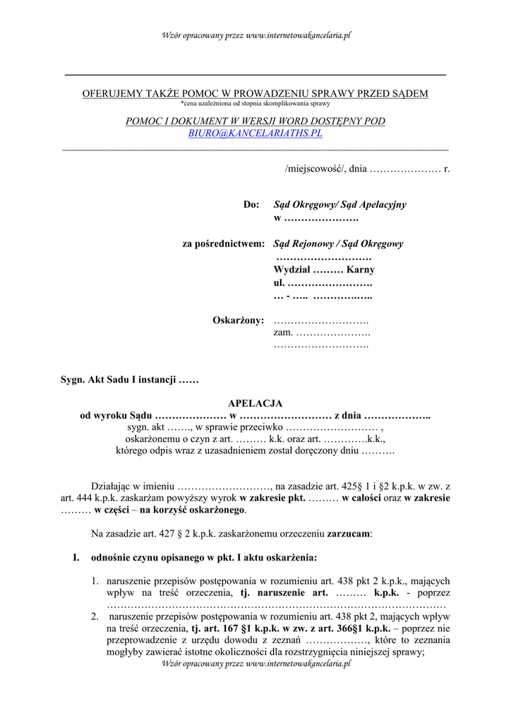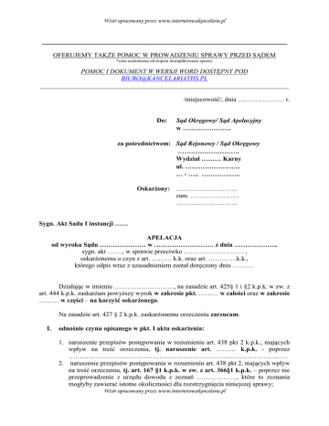 Wzór opracowany przez www.internetowakancelaria.pl __________________________________________________________________________ OFERUJEMY TAKŻE POMOC W PROWADZENIU SPRAWY PRZED SĄDEM *cena uzależniona od stopnia skomplikowania sprawy POMOC I DOKUMENT W WERSJI WORD DOSTĘPNY POD [email protected] ___________________________________________________________________________ /miejscowość/, dnia ………………… r. Do: Sąd Okręgowy/ Sąd Apelacyjny w …………………. za pośrednictwem: Sąd Rejonowy / Sąd Okręgowy ………………………. Wydział ……… Karny ul. ……………………. … - ….. ………….….. Oskarżony: ………………………. zam. …………………. ………………………. Sygn. Akt Sadu I instancji …… APELACJA od wyroku Sądu ………………… w ……………………… z dnia ……………….. sygn. akt ……., w sprawie przeciwko ……………………… , oskarżonemu o czyn z art. ……… k.k. oraz art. ………….k.k., którego odpis wraz z uzasadnieniem został doręczony dniu ………. Działając w imieniu ………………………, na zasadzie art. 425§ 1 i §2 k.p.k. w zw. z art. 444 k.p.k. zaskarżam powyższy wyrok w zakresie pkt. ……… w całości oraz w zakresie ……… w części – na korzyść oskarżonego. Na zasadzie art. 427 § 2 k.p.k. zaskarżonemu orzeczeniu zarzucam: I. odnośnie czynu opisanego w pkt. I aktu oskarżenia: 1. naruszenie przepisów postępowania w rozumieniu art. 438 pkt 2 k.p.k., mających wpływ na treść orzeczenia, tj. naruszenie art. ……… k.p.k. - poprzez ……………………………………………………………………………………… 2. naruszenie przepisów postępowania w rozumieniu art. 438 pkt 2, mających wpływ na treść orzeczenia, tj. art. 167 §1 k.p.k. w zw. z art. 366§1 k.p.k. – poprzez nie przeprowadzenie z urzędu dowodu z zeznań ………………, które to zeznania mogłyby zawierać istotne okoliczności dla rozstrzygnięcia niniejszej sprawy; Wzór opracowany przez www.internetowakancelaria.pl Wzór opracowany przez www.internetowakancelaria.pl 3. naruszenie przepisów postępowania w rozumieniu art. 438 pkt. 2 k.p.k., tj. art. 7 k.p.k. w zw. z 4 k.p.k. poprzez przyjęcie wbrew zasadom prawidłowego rozumowania oraz wskazań wiedzy i doświadczenia życiowego, że zeznania ……………… są w pełni wiarygodne; 4. naruszenie przepisów postępowania w rozumieniu art. 438 pkt 2 k.p.k., mających wpływ na treść wyroku poprzez niewłaściwe zastosowanie tj. art. ……… k.p.k. i wydanie wyroku uniewinniającego podczas gdy oskarżony powinien zostać uznany winnym/niewinnym; 5. błąd w ustaleniach faktycznych w rozumieniu art. 438 pkt. 3 k.p.k. mających wpływ na treść orzeczenia poprzez przyjęcie, że: a) zeznania ……………… nie znajdują potwierdzenia w zebranym materialne dowodowym, podczas gdy znajdują one potwierdzenie w ……………………… b) /inne zarzuty/ II. odnośnie czynu opisanego w pkt. II aktu oskarżenia: 1. błąd w ustaleniach faktycznych w rozumieniu art. 438 pkt 3 k.p.k., mających wpływ na treść orzeczenia poprzez ……………………………… III. odnośnie orzeczenia o kosztach postępowania: a) naruszenie art. ……… k.p.k. poprzez ……………… Z uwagi na wskazane uchybienia wyroku Sądu I instancji, na zasadzie art. 427§1 k.p.k. i art. 437 § 2 k.p.k. wnoszę o uchylenie zaskarżonego wyroku w zaskarżonej części i przekazanie sprawy do ponownego rozpoznania oraz rozstrzygnięcie o kosztach procesu przez Sąd I instancji. UZASADNIENIE I. Zaskarżony wyrok 1. Zaskarżonym wyrokiem wydanym w dniu ………roku w sprawie o sygnaturze akt ……… Sąd ……………………………… ustalił ……………………… 2. W uzasadnieniu wyroku Sąd stwierdził, iż ……………………………………… 3. W ocenie strony ……………………… przedmiotowy wyrok obarczony jest zasadniczymi błędami, wynikającymi z naruszenia przez Sąd pierwszej instancji Wzór opracowany przez www.internetowakancelaria.pl Wzór opracowany przez www.internetowakancelaria.pl przepisów postępowania karnego oraz prawa materialnego, za czym przemawiają w szczególności następujące argumenty. II. Uzasadnienie zarzutu naruszenia art. …… k.p.k. 4. Sąd pierwszej instancji dopuścił się w niniejszej sprawie naruszenia przepisu art. …….. karnego. Stosownie do treści tego przepisu, kodeksu postępowania „…………………………………………………………………………………………” 5. Przechodząc na grunt niniejszej sprawy należy podnieść, iż Sąd pierwszej instancji nie zbadał sprawy w sposób prawidłowy. W szczególności Sąd stanął na stanowisku, iż powinien był …………………………………………… podczas gdy Sąd …………………………………………………………….……………………………… 6. Niemniej jednak pomimo powyższego, Sąd pierwszej instancji dokonał ustalenia, że ………………………………………………………. Tym samym ocena materiału dowodowego dokonana przez Sąd w niniejszej sprawie jest wadliwa i charakteryzuje się dowolnością, a zarzut naruszenia przepisu art. …… k.p.k. jest uzasadniony. III. Uzasadnienie zarzutu naruszenia przepisów prawa materialnego Sąd pierwszej instancji dopuścił się również w niniejszej sprawie naruszenia przepisów prawa materialnego tj. art. …….. kodeksu karnego. /treść uzasadnienia naruszenia prawa materialnego zależna od stanu faktycznego konkretnej sprawy i naruszonych przepisów/ ___________________________________________________________________________ Biorąc pod uwagę przedstawione powyżej argumenty, należy zaznaczyć, iż apelacja jest uzasadniona i zasługuje na uwzględnienie w całości. ……………………….. ….. /czytelny p