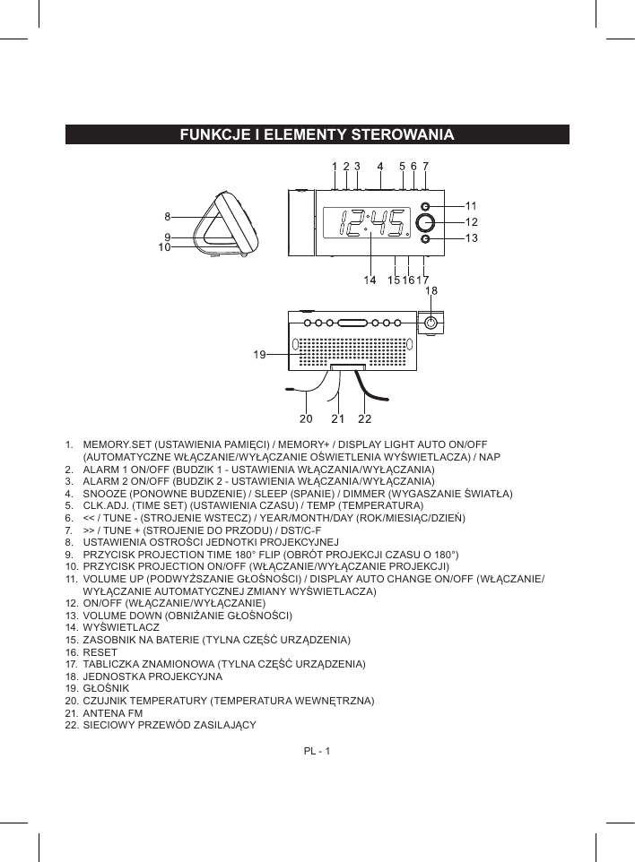 FUNKCJE I ELEMENTY STEROWANIA 1. MEMORY.SET (USTAWIENIA PAMIĘCI) / MEMORY+ / DISPLAY LIGHT AUTO ON/OFF (AUTOMATYCZNE WŁĄCZANIE/WYŁĄCZANIE OŚWIETLENIA WYŚWIETLACZA) / NAP ALARM 1 ON/OFF (BUDZIK 1 - USTAWIENIA WŁĄCZANIA/WYŁĄCZANIA) ALARM 2 ON/OFF (BUDZIK 2 - USTAWIENIA WŁĄCZANIA/WYŁĄCZANIA) SNOOZE (PONOWNE BUDZENIE) / SLEEP (SPANIE) / DIMMER (WYGASZANIE ŚWIATŁA) CLK.ADJ. (TIME SET) (USTAWIENIA CZASU) / TEMP (TEMPERATURA) << / TUNE - (STROJENIE WSTECZ) / YEAR/MONTH/DAY (ROK/MIESIĄC/DZIEŃ) >> / TUNE + (STROJENIE DO PRZODU) / DST/C-F USTAWIENIA OSTROŚCI JEDNOTKI PROJEKCYJNEJ PRZYCISK PROJECTION TIME 180° FLIP (OBRÓT PROJEKCJI CZASU O 180°) PRZYCISK PROJECTION ON/OFF (WŁĄCZANIE/WYŁĄCZANIE PROJEKCJI) VOLUME UP (PODWYŻSZANIE GŁOŚNOŚCI) / DISPLAY AUTO CHANGE ON/OFF (WŁĄCZANIE/ WYŁĄCZANIE AUTOMATYCZNEJ ZMIANY WYŚWIETLACZA) 12. ON/OFF (WŁĄCZANIE/WYŁĄCZANIE) 13. VOLUME DOWN (OBNIŻANIE GŁOŚNOŚCI) 14. WYŚWIETLACZ 15. ZASOBNIK NA BATERIE (TYLNA CZĘŚĆ URZĄDZENIA) 16. RESET 17. TABLICZKA ZNAMIONOWA (TYLNA CZĘŚĆ URZĄDZENIA) 18. JEDNOSTKA PROJEKCYJNA 19. GŁOŚNIK 20. CZUJNIK TEMPERATURY (TEMPERATURA WEWNĘTRZNA) 21. ANTENA FM 22. SIECIOWY PRZEWÓD ZASILAJĄCY 2. 3. 4. 5. 6. 7. 8. 9. 10. 11. PL - 1 WYŚWIETLACZ LED Wskaźnik CZASU Wskaźnik PM (po południu) Wskaźnik TRYBU CZUWANIA Wskaźnik ALARM 1 Wskaźnik MHz Wskaźnik ALARM2 PODŁĄCZANIE ZASILANIA Podłącz przewód zasilający do gniazdka sieciowego z napięciem zmiennym. To urządzenie jest wyposażone w system baterii rezerwowej, który wymaga płaskiej baterii litowej 3V CR2032 (nie wchodzi w skład zestawu). Włóż baterię do zasobnika na baterie tak, aby dodatnie i ujemne bieguny baterii (+ i -) były podłączone do odpowiednich konektorów płytki w zasobniku na baterie. Jeśli dojdzie do przerwy w dostawie zasilania sieciowego, zegar przełączy się automatycznie na zasilanie z baterii, a praca zegara ani pamięci nie zostanie przerwana. Po odnowieniu dostawy prądu elektrycznego zegar przełączy się na zasilanie z sieci. ZACZYNAMY Po podłączeniu zasilania prądem zmiennym (AC) wciśnij przycisk RESET (16) znajdujący się w tylnej części urządzenia. - Urządzenie pokaże na 2 sekundy wszystkie segmenty, a następnie przełączy się na normalny tryb. 1. USTAWIENIA RĘCZNE CZASU I KALENDARZA A. Ustawienia czasu i kalendarza – W normalnym trybie wciśnij przycisk Time set (5) i uruchom tryb ustawienia czasu poprzez przytrzymanie tego przycisku przez min. 2 sekundy. Po otwarciu trybu ustawień możesz poprzez wciśnięcie przycisku Time set (5) zmienić w następujący sposób cykl: Normal (normalny) → Year (rok) → Month (miesiąc) → Day (dzień) → 12/24 H → Real time Hour (dokładny czas, godzina) → Real time Min (dokładny czas, minuta) → Normal (normalny) Czynność (podczas dokonywania ustawień daty): - Poprzez wciśnięcie przycisku << / Tune - (6) przesuniesz dane wstecz. - Poprzez wciśnięcie przycisku >> / Tune + (7) przesuniesz dane do przodu. - Aby uruchomić automatyczne przesuwanie do przodu, wciśnij i przytrzymaj przez 2 sekundy przycisk << lub >>. B. Ustawienia Alarmu 1 i Alarmu 2 – W normalnym trybie wciśnij przycisk Alarm (2/3) i uruchom tryb ustawienia budzika poprzez przytrzymanie tego przycisku przez min. 2 sekundy. Po otwarciu trybu ustawień możesz poprzez wciśnięcie przycisku Alarm (2/3) zmienić w następujący sposób cykl: Normal (normalny) → AL 1 Hour (godzina) → AL 1 Min (minuta) → AL 1 weekday Alarm (budzik weekendowy) → AL 1 wake beep (budzenie dzwonkiem) → AL 1 wake radio (budzenie radiem) → AL 1 wake radio volume (głośność budzenia radiem) → Normal (normalny) Normal (normalny) → AL 2 Hour (godzina) → AL 2 Min (minuta) → AL 2 weekday Alarm (budzik weekendowy) → AL 2 wake beep (budzenie dzwonkiem) → AL 2 wake radio (budzenie radiem) → AL 2 wake radio volume (głośność budzenia radiem) → Normal (normalny) PL - 2 Wybierz jeden z poniższych trybów tygodniowych budzika 1-5: Od poniedziałku do piątku 1-7: Cały tydzień 6-7: Sobota i niedziela 1-1: Jeden dzień w tygodniu Czynność (podczas dokonywania ustawień daty): - Poprzez wciśnięcie przycisku << / Tune - (6) przesuniesz dane wstecz. - Poprzez wciśnięcie przycisku >> / Tune + (7) przesuniesz dane do przodu. - Aby uruchomić automatyczne przesuwanie do przodu, wciśnij i przytrzymaj przez 2 sekundy przycisk << lub >>. 2. USTAWIENIA TRYBU BUDZIKA I JEGO WŁĄCZANIE/WYŁĄCZANIE Przełącz przycisk MEMORY.SET / MEMORY+ / DISPLAY LIGHT AUTO ON/OFF / NAP (1) na tryb Auto off (automatyczne wyłączanie), wyświetlacz budzika włączy się automatycznie. Aby włączyć lub wyłączyć budzik, wciśnij przycisk alarm 1 on/off set (2). Aby włączyć lub wyłączyć budzik, wciśnij przycisk alarm 2 on/off set (3). 3. CZAS BUDZENIA I FUNKCJA SNOOZE (PONOWNE BUDZENIE) Czas budzenia – jeśli nie wciśniesz żadnego przycisku, sygnał dźwiękowy lub radio będą aktywne przez 30 minut, a następnie dojdzie do ich automatycznego wyłączenia. Budzenie zostanie ponownie uruchomione następnego dnia o tej samej porze. Używanie funkcji Snooze (Ponowne budzenie): - W trakcie budzenia wciśnij przycisk Snooze (4) - uruchomi się funkcja snooze, która przerwie sygnał dźwiękowy lub radiowy. - Odstęp czasowy wynosi w przypadku funkcji snooze 9 minut (ustawianie sekund jest niemożliwe). - Ponowne budzenie będzie aktywne do momentu wciśnięcia przycisku ON/OFF (12). W przeciwnym wypadku budzenie za pomocą sygnału dźwiękowego lub radiowego zostanie automatycznie wyłączone po 30 minutach. Przełącz przycisk MEMORY.SET / MEMORY+ / DISPLAY LIGHT AUTO ON/OFF / NAP (1) na tryb automatycznego wyłączania - poprzez wciśnięcie przycisku Snooze / sleep (4) podczas automatycznego włączania budzika uruchomisz funkcję ponownego budzenia. Sygnał dźwiękowy lub radiowy budzika zatrzyma się i wyłączy. 4. ZMIANA EDYCJI EKRANU W normalnym trybi
