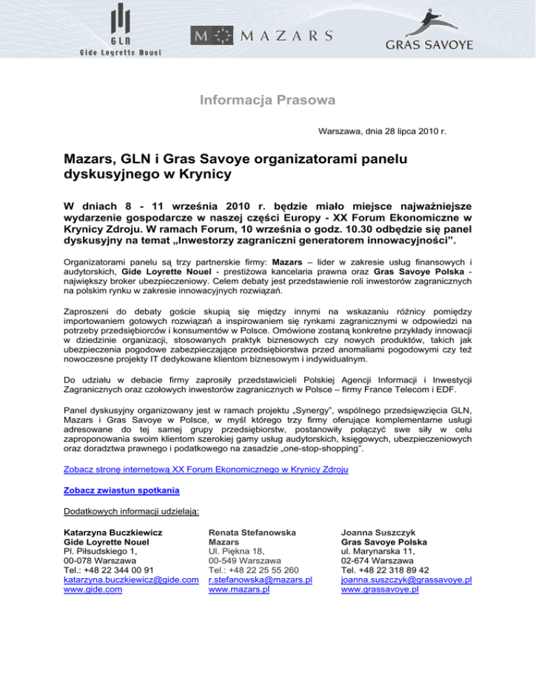 Informacja Prasowa Warszawa, dnia 28 lipca 2010 r. Mazars, GLN i Gras Savoye organizatorami panelu dyskusyjnego w Krynicy W dniach 8 - 11 września 2010 r. będzie miało miejsce najważniejsze wydarzenie gospodarcze w naszej części Europy - XX Forum Ekonomiczne w Krynicy Zdroju. W ramach Forum, 10 września o godz. 10.30 odbędzie się panel dyskusyjny na temat „Inwestorzy zagraniczni generatorem innowacyjności”. Organizatorami panelu są trzy partnerskie firmy: Mazars – lider w zakresie usług finansowych i audytorskich, Gide Loyrette Nouel - prestiżowa kancelaria prawna oraz Gras Savoye Polska największy broker ubezpieczeniowy. Celem debaty jest przedstawienie roli inwestorów zagranicznych na polskim rynku w zakresie innowacyjnych rozwiązań. Zaproszeni do debaty goście skupią się między innymi na wskazaniu różnicy pomiędzy importowaniem gotowych rozwiązań a inspirowaniem się rynkami zagranicznymi w odpowiedzi na potrzeby przedsiębiorców i konsumentów w Polsce. Omówione zostaną konkretne przykłady innowacji w dziedzinie organizacji, stosowanych praktyk biznesowych czy nowych produktów, takich jak ubezpieczenia pogodowe zabezpieczające przedsiębiorstwa przed anomaliami pogodowymi czy też nowoczesne projekty IT dedykowane klientom biznesowym i indywidualnym. Do udziału w debacie firmy zaprosiły przedstawicieli Polskiej Agencji Informacji i Inwestycji Zagranicznych oraz czołowych inwestorów zagranicznych w Polsce – firmy France Telecom i EDF. Panel dyskusyjny organizowany jest w ramach projektu „Synergy”, wspólnego przedsięwzięcia GLN, Mazars i Gras Savoye w Polsce, w myśl którego trzy firmy oferujące komplementarne usługi adresowane do tej samej grupy przedsiębiorstw, postanowiły połączyć swe siły w celu zaproponowania swoim klientom szerokiej gamy usług audytorskich, księgowych, ubezpieczeniowych oraz doradztwa prawnego i podatkowego na zasadzie „one-stop-shopping”. Zobacz stronę internetową XX Forum Ekonomicznego w Krynicy Zdroju Zobacz zwiastun spotkania Dodatkowych informacji udzielają: Katarzyna Buczkiewicz Gide Loyrette Nouel Pl. Piłsudskiego 1, 00-078 Warszawa Tel.: +48 22 344 00 91 [email protected] www.gide.com Renata Stefanowska Mazars Ul. Piękna 18, 00-549 Warszawa Tel.: +48 22 25 55 260 [email protected] www.mazars.pl Joanna Suszczyk Gras Savoye Polska ul. Marynarska 11, 02-674 Warszawa Tel. +48 22 318 89 42 [email protected] www.grassavoye.pl Informacja o partnerach: Kancelaria Gide Loyrette Nouel założona w Paryżu w 1920 roku, jest dzisiaj jedną z największych międzynarodowych kancelarii prawnych. Gide Loyrette Nouel posiada 24 biura na całym świecie i zatrudnia ponad 700 prawników, w tym 108 partnerów, reprezentujących ponad 50 narodowości. Kancelaria oferuje najwyższej jakości pomoc prawną w zakresie licznych dziedzin prawa gospodarczego krajowego i międzynarodowego. Warszawskie biuro utworzone jest przez międzynarodowy zespół prawników, co gwarantuje kompleksową obsługę naszym klientom, szczególnie w takich dziedzinach jak: prawo spółek, prywatyzacje, prawo obrotu nieruchomościami, prawo bankowe i rynki kapitałowe, infrastruktura, koncesje, podatki, prawo pracy, a także prawo konkurencji, własności intelektualnej, sporów sądowych i postępowań arbitrażowych. Mazars jest międzynarodową, zintegrowaną i niezależną organizacją specjalizującą się w audycie, usługach księgowych, doradztwie podatkowym i usługach doradczych. Mazars korzysta z wiedzy 12 500 specjalistów w 56 krajach, które tworzą zintegrowaną sieć biur. Od lat Mazars zajmuje czołowe miejsca w rankingach firm audytorsko-doradczych w Europie i w Polsce. Mazars posiada 18-letnie doświadczenie na rynku polskim, gdzie działając jako grupa dwóch spółek zatrudniających łącznie ponad 160 osób w Warszawie i w Krakowie, oferuje firmom polskim i zagranicznym, działającym w różnych sektorach gospodarczych, pełną gamę usług audytorskich, doradztwo w kwestiach podatkowych oraz usługi finansowo-księgowe i kadrowo-płacowe. Mazars obrał innowacyjny i zarazem wymagający zintegrowany model rozwoju oparty na demokratycznym partnerstwie, które pozwala każdemu ze wspólników na podejmowanie strategicznych decyzji w sprawie przyszłości Grupy. Tak rozumiana odpowiedzialność jest kluczem do zasad i praktyk Mazars. Przejawia się w jego organizacji, sposobie wykonywania zawodu jak również w relacjach z otoczeniem społecznym i gospodarczym. Gwarantuje klientom na całym świecie jednakowo wysoki i stale doskonalony poziom usług. Gras Savoye niezmiennie od 1992 roku zajmuje pierwszą pozycję w rankingach brokerów ubezpieczeniowych we Francji, a od 2004 w Polsce. Firma Gras Savoye została założona w 1907 przez Pierre’a Gras i Gustave’a Savoye w Lille na północy Francji. Obecnie grupa Gras Savoye zatrudnia ponad 3600 osób, a jej sieć obejmuje ponad 70 placówek. Grupa działa w Polsce w ramach dwóch spółek: Gras Savoye Polska – broker ubezpieczeniowy i reasekuracyjny Pol-Assistance – spółka serwisowa Gras Savoye w Polsce, z 280 osobowym zespołem i obrotami przekraczającymi 100 mln PLN zapewnia obsługę wszystkich linii ubezpieczeniowych takich jak ubezpieczenia majątkowe, komunikacyjne, odpowiedzialności cywilnej, osobowe oraz specjalistyczne produkty. Świadczy ponadto usługi w zakresie risk manegementu, reasekuracji, likwidacji szkód, dystrybucji produktów ubezpieczeniowych oraz assistance.