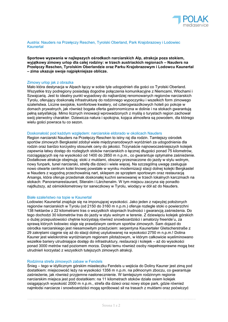 Austria: Nauders na Przełęczy Reschen, Tyrolski Oberland, Park Krajobrazowy i Lodowiec Kaunertal Sportowe wyzwania w najlepszych ośrodkach narciarskich Alp, atrakcje poza stokiem, wyjątkowy zimowy urlop dla całej rodziny: w trzech austriackich regionach – Nauders na Przełęczy Reschen, Tyrolskim Oberlandzie oraz Parku Krajobrazowym i Lodowcu Kaunertal – zima ukazuje swoje najpiękniejsze oblicze. Zimowy urlop jak z obrazka Mało która destynacja w Alpach łączy w sobie tyle udogodnień dla gości co Tyrolski Oberland. Wszystkie trzy podregiony posiadają dogodne połączenia komunikacyjne z Niemcami, Włochami i Szwajcarią. Jest to idealny punkt wypadowy do najbardziej renomowanych regionów narciarskich Tyrolu, oferujący doskonałą infrastrukturę do rodzinnego wypoczynku i wszelkich form zimowego szaleństwa. Liczne swojskie, komfortowe kwatery, od czterogwiazdkowych hoteli po pokoje w domach prywatnych, jak również bogata oferta gastronomiczna w dolinie i na stokach gwarantują pełną satysfakcję. Mimo licznych innowacji wprowadzonych z myślą o turystach region zachował swój pierwotny charakter. Dziewicza natura i spokojna, kojąca atmosfera są powodem, dla którego wielu gości powraca tu co sezon. Doskonałość pod każdym względem: narciarskie eldorado w okolicach Nauders Region narciarski Nauders na Przełęczy Reschen to istny raj dla rodzin. Tamtejszy ośrodek sportów zimowych Bergkastel zdobył wiele międzynarodowych wyróżnień za udogodnienia dla rodzin oraz bardzo korzystny stosunek ceny do jakości. Trzynaście najnowocześniejszych kolejek zapewnia łatwy dostęp do rozległych stoków narciarskich o łącznej długości ponad 75 kilometrów, rozciągających się na wysokości od 1400 do 2850 m n.p.m., co gwarantuje optymalne zaśnieżenie. Dodatkowe atrakcje obejmują: stoki z muldami, obszary przeznaczone do jazdy w stylu wolnym, nowy funpark, tunel narciarski, strefę dla dzieci i wiele więcej. Na szczególną uwagę zasługuje nowo otwarte centrum kolei linowej powstałe w wyniku modernizacji stacji dolnej kolejki Bergkastel w Nauders z wygodną przechowalnią nart, sklepem ze sprzętem sportowym oraz restauracją Arsangs, która oferuje przedsmak doskonałej kuchni serwowanej w trzech lokalnych karczmach na stokach: Panoramarestaurant, Stieralm i Lärchenalm. W tym miejscu zaczyna się ponadto najdłuższy, aż ośmiokilometrowy tor saneczkowy w Tyrolu, wiodący w dół aż do Nauders. Białe szaleństwo na topie w Kaunertal Lodowiec Kaunertal znajduje się na imponującej wysokości. Jako jeden z najwyżej położonych regionów narciarskich w Tyrolu (od 2150 do 3160 m n.p.m.) oferuje rozległe stoki o powierzchni 138 hektarów z 22 kilometrami tras o wszystkich stopniach trudności i gwarancją zaśnieżenia. Do tego dochodzi 30 kilometrów tras do jazdy w stylu wolnym w terenie. Z dziewięciu kolejek górskich o dużej przepustowości chętnie korzystają również snowboardziści i amatorzy freeride’u, za sprawą których lodowiec staje się prawdziwym centrum sportów zimowych. Sam dojazd do ośrodka narciarskiego jest niesamowitym przeżyciem: serpentyna Kaunertaler Gletscherstraße z 29 zakrętami ciągnie się aż do stacji dolnej usytułowanej na wysokości 2750 m n.p.m.! Dolina Kauner jest wielokrotnie wyróżnianym regionem pilotażowym, w którym całkowicie wyeliminowano wszelkie bariery utrudniające dostęp do infrastruktury, restauracji i kolejek – aż do wysokości ponad 3000 metrów nad poziomem morza. Dzięki temu również osoby niepełnosprawne mogą bez utrudnień korzystać z wszystkich tutejszych zimowych atrakcji. Rodzinna strefa zimowych zabaw w Fendels Śnieg – tego w idyllicznym górskim miasteczku Fendels u wejścia do Doliny Kauner jest zimą pod dostatkiem: miejscowość leży na wysokości 1356 m n.p.m. na północnym zboczu, co gwarantuje zaśnieżenie, jak również przyjemne nasłonecznienie. W tamtejszym rodzinnym regionie narciarskim miejsca jest pod dostatkiem: na 11 kilometrach stoków działa osiem kolejek osiągających wysokość 2000 m n.p.m., strefa dla dzieci oraz nowy slope park, gdzie również najmłodsi narciarze i snowboardziści mogą spróbować sił na trasach z muldami oraz poćwiczyć skoki narciarskie na niewielkich skoczniach. W każdy czwartek od grudnia do marca reflektory oświetlają stoki, umożliwiając jazdę pod gwiaździstym niebem, a raz w tygodniu można zjeżdżać nocą po oświetlonym torze saneczkowym w Fendels. Maksymalna różnorodność dzięki dwóm karnetom Z myślą o wszystkich, którzy podczas urlopu narciarskiego cenią urozmaicenie, wprowadzono dwa atrakcyjne karnety obowiązujące w rozległych ośrodkach sportów zimowym ważne przez okres od 4 do 14 dni. Karnet Snowcard Gold upoważnia do korzystania z wszystkich kolejek w regionach Skiarena Samnaun-Ischgl, Skiparadies Nauders am Reschenpass, Kaunertaler Gletscher oraz Familienskigebiet Fendels. Karnet Ski-6 daje jeszcze więcej możliwości: do ośrodków narciarskich w Nauders, Kaunertaler Gletscher i Fendels dochodzi tyrolski region Skidimension Serfaus-FissLadis oraz rodzinny ośrodek narciarski Venet w Zams. Sześć najwyższej klasy ośrodków narciarskich, łącznie 574 km tras i 147 kolejek to dla amatorów sportów zimowych nie lada gradka! Dodatkowe atrakcje obejmują fun parki, strefy dla dzieci, gwarancję zaśnieżenia oraz darmowe busy dowożące do stacji kolejek, co gwarantuje prawdziwie bezstresowe narciarskie safari, czyli zimowy urlop połączony ze zwiedzaniem na zasadzie „codziennie inny stok”. Oczywiście każdy ośrodek narciarski oferuje także jedno- lub wielodniowe karnety indywidualne oraz rodzinne w przystępnych cenach. Łagodne zimowe przeżycia Jazda na nartach i snowboardzie to oczywiście tylko jedna z licznych atrakcji czekających na gości w Tyrolskim Oberlandzie. Amatorzy snowmotion, czyli zimowych doznań w czystej formie, mogą rozkoszować się scenerią 