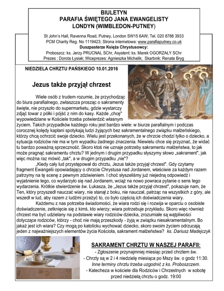 BIULETYN PARAFIA ŚWIĘTEGO JANA EWANGELISTY LONDYN (WIMBLEDON-PUTNEY) St John’s Hall, Ravenna Road, Putney, London SW15 6AW; Tel. 020 8788 3933 PCM Charity Reg. No 1119423; Strona internetowa: www.parafiaputney.co.uk Duszpasterze Księża Chrystusowcy: Proboszcz: ks. Jerzy PRUCNAL SChr, Asystent: ks. Marek OGORZAŁY SChr Prezes : Dorota Łysiak; Wiceprezes: Agnieszka Michalik; Skarbnik: Renata Bryg NIEDZIELA CHRZTU PAŃSKIEGO 10.01.2016 Jezus także przyjął chrzest Wiele osób z trudem rozumie, że przychodząc do biura parafialnego, zwłaszcza prosząc o sakramenty święte, nie przyszło do supermarketu, gdzie wystarczy zdjąć towar z półki i pójść z nim do kasy. Każde „chcę" wypowiedziane w Kościele trzeba potwierdzić własnym życiem. Takich przypadków każdego roku jest bardzo wiele: w biurze parafialnym i podczas corocznej kolędy kapłani spotykają ludzi żyjących bez sakramentalnego związku małżeńskiego, którzy chcą ochrzcić swoje dziecko. Wielu jest przekonanych, że w chrzcie chodzi tylko o dziecko, a sytuacja rodziców nie ma w tym wypadku żadnego znaczenia. Niewielu chce się przyznać, że widać tu bardzo poważną sprzeczność. Skoro ktoś nie uznaje potrzeby sakramentu małżeństwa, to jak może pragnąć sakramentu chrztu? W jednym i drugim przypadku słyszymy słowo „sakrament", jak więc można raz mówić „tak", a w drugim przypadku „nie"? „Kiedy cały lud przystępował do chrztu, Jezus także przyjął chrzest". Gdy czytamy fragment Ewangelii opowiadający o chrzcie Chrystusa nad Jordanem, właściwie za każdym razem patrzymy na tę scenę z pewnym zdziwieniem. I choć słyszeliśmy już niejedną odpowiedź i wyjaśnienie tego, co wydarzyło się nad Jordanem, wciąż na nowo powraca pytanie o sens tego wydarzenia. Krótkie stwierdzenie św. Łukasza, że „Jezus także przyjął chrzest", pokazuje nam, że Ten, który przyszedł nauczać wiary, nie stanął z boku, nie nauczał, patrząc na wszystkich z góry, ale wszedł w lud, aby razem z ludźmi przeżyć to, co było częścią ich doświadczenia wiary. Każdemu z nas potrzeba świadomości, że wiara rodzi się i rozwija w oparciu o osobiste doświadczenie, zetknięcie się z kimś, kto wierzy; wiara potrzebuje przykładu. Skoro więc również chrzest ma być udzielany na podstawie wiary rodziców dziecka, zrozumiałe są wątpliwości dotyczące rodziców, którzy - choć nie mają przeszkody - żyją w związku niesakramentalnym. Bo jakaż jest ich wiara? Czy mogą po katolicku wychować dziecko, skoro swoim życiem odrzucają jeden z najważniejszych elementów życia Kościoła, sakrament małżeństwa? ks. Dariusz Madejczyk SAKRAMENT CHRZTU W NASZEJ PARAFII: - Zgłoszenie przynajmniej miesiąc przed chrztem św. - Chrzty są w 2 i 4 niedzielę miesiąca po Mszy św. o godz 11:30. Inne terminy chrztu trzeba uzgodnić z ks. Proboszczem. - Katecheza w kościele dla Rodziców i Chrzestnych w sobotę przed niedzielą chrztu o godz. 19:00 9.01 Sobota 10.01 NIEDZIELA CHRZEST PAŃSKI 18:00 Śp. Genowefa Urbaniak - k. biały ŚWIĘTO CHRZTU PAŃSKIEGO 8:30 10:00 11:30 19:00 Wimbledon koronka do Bożego Miłosierdzia 12:45 18:00 W intencji Prezydenta, Rządu i Narodu Polskiego Śp. Elżbieta i Andrzej Wieczorek O światło Ducha Św. i uzdrowienie wewnetrzne dla Teresy O Boże błog. dla rodziny Pierzgalskich W intencji Dominika w 9 rocz. urodzin z prośbą o zdrowie i Boże błogosławieństwo 11.01 Poniedziałek Okres zwykły k. zielony 10.30 O miłosierdzie Boże dla śp. Rodziców Aleksandra i Stefanię Jakubowskich (22r. śm.) i za zmarłych z rodziny 19.00 Dziękczynna za wszelką pomoc od Jarosławy Kukurudza 12.01 Wtorek Okres zwykły k. zielony 10.30 Śp. Jakub Białka 19.00 o Boże błogosławieństwo w obronie doktoratu dla córki 13.01 Środa Okres zwykły k. zielony 10.30 O zerwanie z nałogiem i głębokie nawrócenie dla Iwony 19.00 Msza św. dziękczynna za okazaną pomoc 14.01 Czwartek Okres zwykły k. zielony 10.30 O Boże błogosław. dla Seniorów i ich rodzin 19.00 W pewnej intencji 15.01 Piątek Okres zwykły k. zielony 10.30 O zdrowie i błogosławieństwo Boże dla Macieja i jego rodziny 19.00 W pewnej intencji 16.01 Sobota Okres zwykły k. zielony II NIEDZIELA ZWYKŁA 10.30 Podziękowanie Panu Bogu za szczęśliwą operację 18:00 Dziękczynna za poczęcie dzieci po długim okresie oczekiwania 17.01 NIEDZIELA II NIEDZIELA ZW. DZIECI 8:30 Za Parafian 10:00 o uzdrowienie z ciężkiej choroby i łaskę bliskości z Bogiem dla Iwony 11:30 Śp. Zygmunt Gołębiowski (27r. śm.) 12:45 W pewnej intencji 18:00 Śp. Jerzy Owoc (14r. śm.) 19:00 Wimbledon koronka do Bożego Miłosierdzia KLUB SENIORA zaprasza na spotkanie 14 stycznia 2016 r. W programie: Msza św. w intencji Seniorów i ich rodzin, dzielenie się opłatkiem, śpiewanie NIEDZIELA CHRZTU PAŃSKIEGO. Dzisiaj kończy kolęd i uroczysty obiad. Zapisy na obiad u p. Krystyny się okres Narodzenia Pańskiego. Tradycyjnie kolędy Holland - tel. 0208 946 7070. śpiewamy do 2 lutego. KSIĄŻKI „ŻYCIE NA PEŁNEJ PETARDZIE” KS. JANA OPŁATEK PARAFIALNY. Zapraszamy naszych Parafian na ŚPIEWANIE KOLĘD ORAZ OPŁATEK KACZKOWSKIEGO są jeszcze do nabycia w zakrystii za £10. PARAFIALNY dzisiaj w niedzielę 10 stycznia 2016 o godz. 13.00 w sali parafialnej na górze. NAUCZYCIEL KATECHEZY. Nasza parafia pilnie PSALM (Ps 104) - 10 stycznia 2016: „Chwal i błogosław duszo moja, Pana” ODWIEDZINY DUSZPASTERSKIE - KOLĘDA 2016. Trwają odwiedziny duszpasterskie tradycyjnie zwane kolędą. W biuletynie wyznaczane są dla orientacji dzielnice (post kod) gdzie będziemy kolędować w danym tygodniu. Zawsze staramy się telefonicznie informować naszych Parafian kiedy i o której godzinie będzie wizyta. - 11 - 17 stycznia 2016 r. - SW 15 - 18 - 24 stycznia 2016 r. - SW 19 BIURO PARAFIALNE. Na czas kolędy kancelaria czynna od poniedziałku do piątku w godzinach porannych po Mszy św. o godz. 10.30. ADORACJA