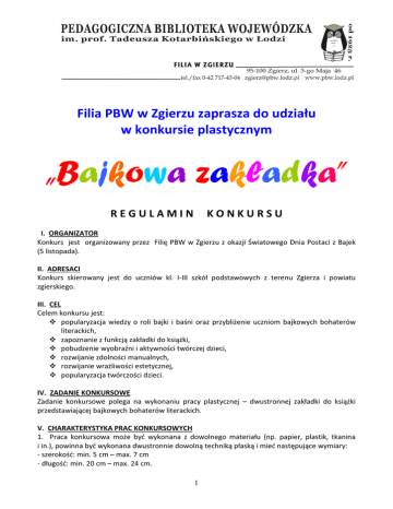 Filia PBW w Zgierzu zaprasza do udziału w konkursie plastycznym „Bajkowa zakładka” REGULAMIN KONKURSU I. ORGANIZATOR Konkurs jest organizowany przez Filię PBW w Zgierzu z okazji Światowego Dnia Postaci z Bajek (5 listopada). II. ADRESACI Konkurs skierowany jest do uczniów kl. I-III szkół podstawowych z terenu Zgierza i powiatu zgierskiego. III. CEL Celem konkursu jest: popularyzacja wiedzy o roli bajki i baśni oraz przybliżenie uczniom bajkowych bohaterów literackich, zapoznanie z funkcją zakładki do książki, pobudzenie wyobraźni i aktywności twórczej dzieci, rozwijanie zdolności manualnych, rozwijanie wrażliwości estetycznej, popularyzacja twórczości dzieci. IV. ZADANIE KONKURSOWE Zadanie konkursowe polega na wykonaniu pracy plastycznej – dwustronnej zakładki do książki przedstawiającej bajkowych bohaterów literackich. V. CHARAKTERYSTYKA PRAC KONKURSOWYCH 1. Praca konkursowa może być wykonana z dowolnego materiału (np. papier, plastik, tkanina i in.), powinna być wykonana dwustronnie dowolną techniką płaską i mieć następujące wymiary: - szerokość: min. 5 cm – max. 7 cm - długość: min. 20 cm – max. 24 cm. 1 2. Na konkurs będą przyjmowane tylko prace wykonane indywidualnie – przez jedną osobę. Uczestnik konkursu może zgłosić 1 pracę. Każda placówka może zgłosić dowolną liczbę prac konkursowych. 3. Do każdej z prac powinna być dołączona metryczka (ZAŁĄCZNIK 1), zawierająca: imię i nazwisko autora pracy oraz jego wiek, pełną nazwę, adres, telefon i adres e-mail placówki (w celu sprawnego kontaktu), nazwisko nauczyciela – jeśli praca była wykonywana pod kierunkiem nauczyciela, lub nazwisko i nr telefonu rodzica (opiekuna) – jeśli praca była wykonywana pod kierunkiem rodzica (opiekuna). Nauczyciel powinien uzyskać zgodę rodziców (opiekunów) dziecka na udostępnienie jego danych osobowych, wizerunku oraz ekspozycję prac (ZAŁĄCZNIK 2) Wszystkie prace traktowane będą z należytą starannością, jednak organizatorzy nie biorą na siebie odpowiedzialności za ich ewentualne uszkodzenie lub zaginięcie w transporcie pocztowym. Prace należy dostarczyć do Filii PBW w Zgierzu, ul. 3 Maja 46 w godzinach pracy biblioteki lub za pośrednictwem poczty. VI. OCENA PRAC 1. Kryteria oceny prac: zgodność z tematem, estetyka wykonania, oryginalność i pomysłowość, samodzielność wykonania. 2. Konkurs ma charakter jednoetapowy. Prace zostaną ocenione przez komisję, którą powoła organizator konkursu. 3. Decyzja komisji ma charakter ostateczny. VII. NAGRODY I EKSPOZYCJA PRAC 1. Uczestnicy konkursu otrzymają dyplomy, a autorzy nagrodzonych prac nagrody rzeczowe. 2. Laureaci konkursu zostaną powiadomieni o wynikach w trakcie uroczystego finału, który odbędzie się w Filii PBW w Zgierzu. 3. Prace przechodzą na własność organizatora i nie będą zwracane. Organizator zastrzega sobie prawo prezentacji wybranych prac (lub fotografii je przedstawiających) na wystawie pokonkursowej i/lub na stronie internetowej i profilu Facebook biblioteki, a także w publikacjach promujących placówkę. VIII. HARMONOGRAM KONKURSU 1. Termin składania i nadsyłania prac upływa 17 października 2016 r. 2. Termin spotkania finałowego zostanie umieszczony na stronie internetowej organizatora. IX. POSTANOWIENIA KOŃCOWE 1. Nadesłanie prac oznacza akceptację warunków konkursu. 2. Organizator konkursu zastrzega sobie prawo do ostatecznej interpretacji regulaminu oraz wprowadzenia w nim zmian wynikających z powodów organizacyjnych od niego niezależnych. 2 ZAŁĄCZNIK 1 INFORMACJE O AUTORZE PRACY: ……………………………………………………………………………………………………………………………………………………………………….. imię i nazwisko autora pracy wiek …………………………………………………………………………………………………………………………….………………………………….……… nazwa i adres placówki ………………………………………………………………………………………………………….……………………………………………….………..….. nr tel. i adres e-mail placówki ……………………………………………………………………………………………………………………………………………………………….………. nazwisko nauczyciela ……………………………………………………………………………………………………………………………………………………………….………. nazwisko i nr tel. rodzica (opiekuna) -----------------------------------------------------------------------------------------------------------------------ZAŁĄCZNIK 2 OŚWIADCZENIE RODZICA Wyrażam zgodę na udział mojego dziecka/podopiecznego: imię i nazwisko ___________________________________________________________________ ucznia szkoły_____________________________________________________________________ w konkursie „Bajowa zakładka” organizowanym z okazji Światowego Dnia Postaci z Bajek, przez Pedagogiczną Bibliotekę Wojewódzką w Łodzi, Filia w Zgierzu. Oświadczam, iż zapoznałem się z regulaminem Konkursu i wyrażam zgodę na publikowanie w mediach wizerunku i danych osobowych mojego dziecka, a także wykorzystanie przez organizatora w celach promocyjnych i informacyjnych pracy konkursowej wykonanej przez moje dziecko. ………………………… …………………………………… data podpis rodzica/opiekuna 3