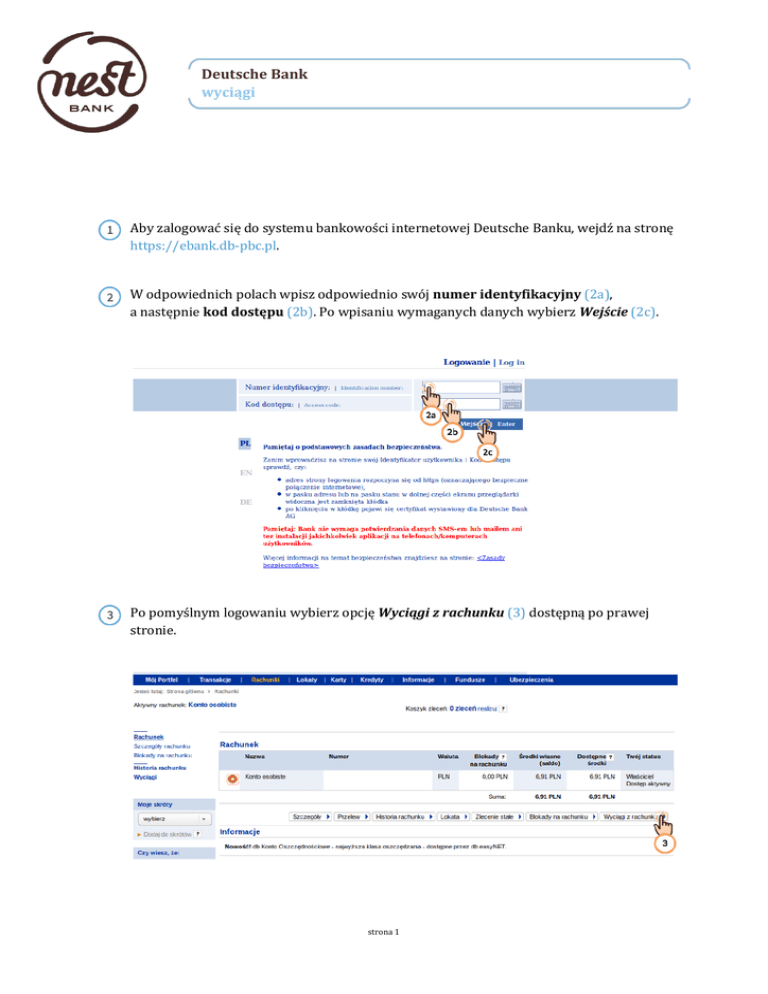 Deutsche Bank wyciągi D Aby zalogować się do systemu bankowości internetowej Deutsche Banku, wejdź na stronę https://ebank.db-pbc.pl. W odpowiednich polach wpisz odpowiednio swój numer identyfikacyjny (2a), a następnie kod dostępu (2b). Po wpisaniu wymaganych danych wybierz Wejście (2c). Po pomyślnym logowaniu wybierz opcję Wyciągi z rachunku (3) dostępną po prawej stronie. strona 1 Wybierz rachunek, z którego chcesz pobrać wyciąg, a następnie wybierz odpowiedni okres: a) Od ... do ... (4a) – dla wskazania konkretnych dat wyciągu, który chcesz wygenerować; b) Z ostatnich... (4b) – aby określić ilość ostatnich okresów (np. dzień lub miesiąc) za jaki chcesz pobrać wyciąg. Po wybraniu zakresu dat, poniżej ukaże się lista dostępnych z tego okresu wyciągów. Zaznacz odpowiednie wyciągi, a następnie kliknij przycisk Pobierz wyciąg (5) dostępny po prawej stronie na dole. strona 2