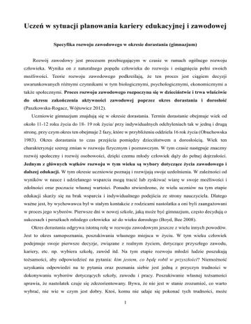 Uczeń w sytuacji planowania kariery edukacyjnej i zawodowej Specyfika rozwoju zawodowego w okresie dorastania (gimnazjum) Rozwój zawodowy jest procesem przebiegającym w czasie w ramach ogólnego rozwoju człowieka. Wynika on z naturalnego popędu człowieka do rozwoju i osiągnięcia pełni swoich możliwości. Teorie rozwoju zawodowego podkreślają, że ten proces jest ciągiem decyzji uwarunkowanych różnymi czynnikami w tym biologicznymi, psychologicznymi, ekonomicznymi a także społecznymi. Proces rozwoju zawodowego rozpoczyna się w dzieciństwie i trwa właściwie do okresu zakończenia aktywności zawodowej poprzez okres dorastania i dorosłość (Paszkowska-Rogacz, Wójtowicz 2012). Uczniowie gimnazjum znajdują się w okresie dorastania. Termin dorastanie obejmuje wiek od około 11-12 roku życia do 18- 19 rok życia/ przy indywidualnych odchyleniach tak w jedną i drugą stronę, przy czym okres ten obejmuje 2 fazy, które w przybliżeniu oddziela 16 rok życia (Obuchowska 1983). Okres dorastania to czas przejścia pomiędzy dzieciństwem a dorosłością. Wiek ten charakteryzuje szereg zmian w rozwoju fizycznym i poznawczym. W tym czasie następuje znaczny rozwój społeczny i rozwój osobowości, dzięki czemu młody człowiek dąży do pełnej dojrzałości. Jednym z głównych wątków rozwoju w tym wieku są wybory dotyczące życia zawodowego i dalszej edukacji. W tym okresie uczniowie poznają i rozwijają swoje uzdolnienia. W zależności od wyników w nauce i udzielanego wsparcia mogą tracić lub zyskiwać wiarę w swoje możliwości i zdolności oraz poczucie własnej wartości. Ponadto stwierdzono, że wielu uczniów na tym etapie edukacji skarży się na brak wsparcia i indywidualnego podejścia ze strony nauczyciela. Dlatego ważne jest, by wychowawca był w stałym kontakcie z rodzicami nastolatka a oni byli zaangażowani w proces jego wyborów. Pierwsze dni w nowej szkole, jaką może być gimnazjum, często decydują o sukcesach i porażkach młodego człowieka aż do wieku dorosłego (Boyd, Bee 2008). Okres dorastania odgrywa istotną rolę w rozwoju zawodowym jeszcze z wielu innych powodów. Jest to okres samopoznania, poszukiwania własnego miejsca w życiu. W tym wieku człowiek podejmuje swoje pierwsze decyzje, związane z realnym życiem, dotyczące przyszłego zawodu, kariery, etc. np. wybiera szkołę, zawód itd. Na tym etapie rozwoju młodzi ludzie poszukują tożsamości, aby odpowiedzieć na pytania: kim jestem, co będę robił w przyszłości? Niemożność uzyskania odpowiedzi na te pytania oraz poznania siebie jest jedną z przyczyn trudności w dokonywaniu wyborów dotyczących szkoły, zawodu i pracy. Poszukiwanie własnej tożsamości sprawia, że nastolatek czuje się zdezorientowany. Bywa, że nie jest w stanie zrozumieć, co warto wybrać, nie wie w czym jest dobry. Ktoś, komu nie udaje się pokonać tych trudności, może 1 doświadczać probemów z podjęciem dalszych działań, związanych z edukacją i pracą. Osoba taka nie jest pewna swoich celów, nie potrafi zdefiniować sukcesu, do którego dąży, a przyszła kariera może nie spełniać oczekiwań. Jeśli nastolatek pozna siebie, to rozwinie poczucie tożsamości, indywidualności, pewność siebie oraz poczucie bezpieczeństwa, co do przyszłości. Dlatego budowanie tożsamości i poznawanie siebi jest jednym z najważniejszych celów społecznej aktywności młodzieży w okresie gimnazjalnym. Na tym etapie rozwoju kariery zawodowej, nastolatek lub młody dorosły eksperymentuje z rolami społecznymi i zawodowymi, wypróbowuje różne wizje samego siebie, traktuje je jako możliwości do wykorzystania w przyszłym zawodzie (Paszowska-Rogacz, Wójtowicz 2012). Teorie rozwoju zawodowego podkreślają, że proces rozwijania potencjalnych możliwości rozpoczyna się w dzieciństwie i trwa do wieku dojrzałego, a jest ciągiem decyzji uwarunkowanych różnymi czynnikami w tym biologicznymi, psychologicznymi, ekonomicznymi a także społecznymi. „Rozwój zawodowy, zwany także rozwojem kariery zawodowej to proces rośnięcia i uczenia się, któremu podporządkowane są wszystkie czynniki zachowania zawodowego”. Rozwój zawodowy obejmuje praktycznie całe życie w zakresie postaw, wartości, umiejętności, zdolności, zainteresowań, cech osobowości i wiedzy, odnoszących się do pracy (Paszkowska-Rogacz 2009). Dwie najbardziej znane teorie rozwoju zawodowego oparte na koncepcji rozwoju osobistego to teoria D.E. Supera oraz teoria E. Ginzberga. Pierwszy z autorów zwraca uwagę na to, że podejmowane przez jednostkę zadania zawodowe wiążą się z zadaniami z zakresu innych ról społecznych. Super w swojej teorii wprowadza pojęcie zawodowego obrazu siebie (vocational selfconcept). Człowiek rozwija się poprzez obserwację pracy. Identyfikowanie się z pracującymi dorosłymi wzbogaca zawodowy obraz siebie, co służy jako wzorzec realizowanej przez całe życie kariery. Zgodnie z teorią Supera ludzie kwalifikują się do różnych zawodów, ponieważ różnią się w zakresie zdolności, zainteresowań, osobowości. D.E. Super wyróżnił znaczenie trzech rodzajów czynników wpływających na rozwój zawodowy człowieka, to: czynnik roli, czynniki sytuacyjne i czynniki osobiste. Czynniki roli angażuje strukturę “ja” poprzez procesy modelowania, naśladownictwa i identyfikacji, których źródłem są osoby znaczące dla jednostki. Pierwszymi modelami mogą być rodzice, opiekunowie. Czynniki sytuacyjne są utożsamiane przez Supera z położeniem społeczno-ekonomicznym rodziców, przekonaniami religijnymi, atmosferą domową, postawami rodziców wobec dziecka i wobec dalszej jego nauki, sytuacją ekonomiczną kraju oraz sytuacją międzynarodową. Czynniki osobiste związane są z bezpośrednimi cechami człowieka, np. osobowością (Paszkowska-Rogacz, Wójtowicz 2012). Według teorii Supera każdy człowiek w rozwoju zawodowym przechodzi pięć etapów: r