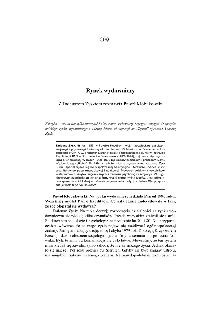 143 Rynek wydawniczy Z Tadeuszem Zyskiem rozmawia Paweł Kłobukowski Książka – czy to już tylko przeżytek? Czy rynek wydawniczy przeżywa kryzys? O specyfice polskiego rynku wydawniczego i własnej ścieżce od socjologii do „Zysku” opowiada Tadeusz Zysk. Tadeusz Zysk, dr (ur. 1953, w Porębie Kocębach, woj. mazowieckie); absolwent socjologii i psychologii Uniwersytetu im. Adama Mickiewicza w Poznaniu; doktor socjologii (1984, UW, promotor Stefan Nowak). Pracował jako adiunkt w Instytucie Psychologii PAN w Poznaniu i w Warszawie (1982–1990); zajmował się psychologią ekonomiczną. W latach 1990–1993 był współwłaścicielem i prezesem Domu Wydawniczego „Rebis”. W 1994 r. założył własne wydawnictwo rodzinne Zysk i S-ka, specjalizujące się we współczesnej beletrystyce, literaturze science fiction oraz literaturze popularnonaukowej i naukowej. Przyswoił polskiemu czytelnikowi wiele ważnych książek zagranicznych z zakresu psychologii i socjologii. W ciągu pierwszych dziesięciu lat istnienia firmy wydał ponad tysiąc tytułów. Jest animatorem społeczności lokalnej w zakresie przywracania tradycji w dolinie Warty; sponsoruje wiele tego typu inicjatyw. Paweł Kłobukowski: Na rynku wydawniczym działa Pan od 1990 roku. Wcześniej myślał Pan o habilitacji. Co ostatecznie zadecydowało o tym, że socjolog stał się wydawcą? Tadeusz Zysk: Na moją decyzję rozpoczęcia działalności na rynku wydawniczym złożyło się kilka czynników. Przede wszystkim zmienił się ustrój. Studiowałem socjologię i psychologię na przełomie lat 70. i 80. Nie przypuszczałem wówczas, że za mego życia pojawi się możliwość ogólnospołecznej zmiany. Pamiętam taką sytuację: to był chyba 1979 rok. Z kolegą Krzysztofem Kosełą – dziś profesorem socjologii – jechaliśmy na seminarium profesora Nowaka. Była to zima i z komunikacją nie było łatwo. Mówiliśmy, że ten system musi kiedyś się zawalić, tylko szkoda, że nie za naszego życia. Jednak okazało się inaczej. Pół roku później był Sierpień. Gdyby nie było zmiany ustroju, nie mógłbym założyć własnego biznesu. Najprawdopodobniej zrobiłbym ha- 144 Rynek wydawniczy bilitację i funkcjonował jako pracownik naukowy. Na moją decyzję wpłynęła również sytuacja rodzinna. W rodzinie zawsze ktoś prowadził prywatną działalność. Wyrastałem w środowisku, w którym wzięcie spraw we własne ręce było dość naturalne. Poza tym zawsze kręciłem się wokół książek. Zakładając firmę wydawniczą mogłem więc realizować własne zainteresowania. Ponadto rozpoczęcie własnego biznesu umożliwiła mi wiedza wyniesiona ze studiów. Socjologia jest takim kierunkiem, który łączy zagadnienia ekonomiczne, społeczne i psychologiczne. Daje wiedzę niezbędną do funkcjonowania w różnych strukturach zarządzania i organizowania. Wszystkie te czynniki złożyły się na moje obecne, nie najgorsze chyba, funkcjonowanie w branży wydawniczej. Czy socjologowie mają jakieś predyspozycje do pisarstwa? Myślę, że najmniejsze predyspozycje do pisania mają poloniści, zajmujący się tym zawodowo. Socjologowie są w tej komfortowej sytuacji, że dysponując fachową wiedzą o społeczeństwie, spotykają się z dużym pluralizmem w poglądach, wartościach i postawach. Nie wyobrażam sobie, by socjolog mógł być zamknięty na świat. A otwartość na świat i elastyczność własnej postawy są w branży pisarskiej bardzo ważne. Oczywiście liczy się naturalny talent. Żeby być dobrym pisarzem, trzeba przede wszystkim dobrze opowiadać. Na przykład Wojciech Cejrowski, który studiował socjologię, dziś pisze powieści podróżnicze. Czerpie z własnych doświadczeń, z podróży. Jednak gdzieś głęboko musi mieć talent, umiejętność pisania. Pani Małgorzata Kalicińska, parającą się problemem kobiet czterdziesto-pięćdziesięcioletnich, czy pan Jan Grzegorczyk z problemem życia księży poruszają w swoich książkach tematy nowe, świeże i oczekiwane przez ludzi. Nic to jednak nie będzie znaczyło, jeśli te ciekawe problemy będą źle opowiedziane. Z umiejętnością opowiadania ściśle wiąże się jeszcze jedna bardzo ważna rzecz. Każda dobra powieść musi być uwiarygodniona, czyli osadzona w dobrym miejscu i dobrym czasie, prawdziwym i rzeczywistym. Jedną z największych wad polskich książek jest to, że akcja dziejąca się w określonym środowisku równie dobrze mogłaby dziać się gdzieś indziej. Książkom brak realiów, szczegółów, smaku codzienności, dotyku. Detal jest w książkach niesłychanie ważny. Wielu pisarzy odnosi sukces przez to, że dociera do jakichś źródeł, że potrafi w sposób wiarygodny przekazać wiedzę o konkretnym środowisku. Odnosząc się do Pana pytania – socjolog ma szansę być pisarzem dlatego, że jest zanurzony w życiu społecznym. Ja nie wierzę w pisarza, który usiądzie i napisze dobrą powieść, nie przeżywając jej akcji w jakiś sposób. Nie wierzę w książki, które są wymyślone, wydumane. Największe polskie powieści, jak Lalka Prusa czy Chłopi Reymonta, można by postawić na półce z dobrą literaturą zachodnią i w niczym by jej nie ustępowały. Teraz chętnie do nich wracamy właśnie dlatego, że opisują realia konkretnego miejsca i czasu. Z Tadeuszem Zyskiem rozmawia Paweł Kłobukowski 145 Co w prowadzeniu biznesu ma według Pana kluczowe znaczenie. Co decyduje o powodzeniu bądź porażce? W biznesie bardzo ważną rzeczą jest budowanie kadry i utrzymywanie przyjaznej atmosfery. Jeśli firma traci większość czasu na rozwiązywanie wewnętrznych problemów generowanych przez zły dobór ludzi i nieumiejętne zarządzanie, to jest to zasadniczy problem. Wiedza o byciu w zespole i kierowaniu zespołem jest niesłychanie ważna. Praca w firmie w 80–90% skupia się na efektywnym wykorzystaniu tej właśnie wiedzy. W praktyce sprowadza się to na przykład do um