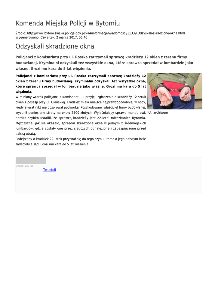 Komenda Miejska Policji w Bytomiu Źródło: http://www.bytom.slaska.policja.gov.pl/ka4/informacje/wiadomosci/11339,Odzyskali-skradzione-okna.html Wygenerowano: Czwartek, 2 marca 2017, 06:40 Odzyskali skradzione okna Policjanci z komisariatu przy ul. Rostka zatrzymali sprawcę kradzieży 12 okien z terenu firmy budowlanej. Kryminalni odzyskali też wszystkie okna, które sprawca sprzedał w lombardzie jako własne. Grozi mu kara do 5 lat więzienia. Policjanci z komisariatu przy ul. Rostka zatrzymali sprawcę kradzieży 12 okien z terenu firmy budowlanej. Kryminalni odzyskali też wszystkie okna, które sprawca sprzedał w lombardzie jako własne. Grozi mu kara do 5 lat więzienia. W miniony wtorek policjanci z Komisariatu III przyjęli zgłoszenie o kradzieży 12 sztuk okien z posesji przy ul. Ułańskiej. Kradzież miała miejsce najprawdopodobniej w nocy, kiedy akurat nikt nie dozorował podwórka. Poszkodowany właściciel firmy budowlanej, wycenił poniesione straty na około 2500 złotych. Wyjaśniający sprawę mundurowi, fot. archiwum bardzo szybko ustalili, że sprawcą kradzieży jest 22-letni mieszkaniec Bytomia. Mężczyzna, jak się okazało, sprzedał skradzione okna w jednym z śródmiejskich lombardów, gdzie zostały one przez śledczych odnalezione i zabezpieczone przed dalszą utratą. Podejrzany o kradzież 22-latek przyznał się do tego czynu i teraz o jego dalszym losie zadecyduje sąd. Grozi mu kara do 5 lat więzienia. Ocena: 0/5 (0) Tweetnij