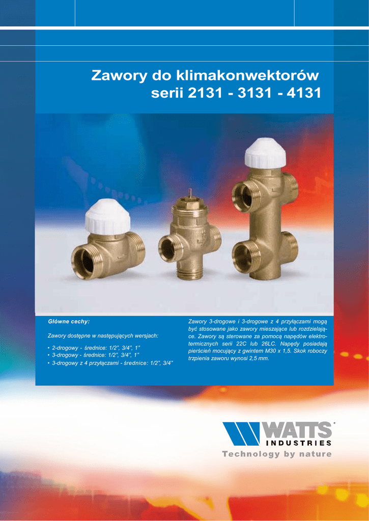 Zawory do klimakonwektorów serii 2131 - 3131 - 4131 Główne cechy: Zawory dostępne w następujących wersjach: • 2-drogowy - średnice: 1/2”, 3/4”, 1” • 3-drogowy - średnice: 1/2”, 3/4”, 1” • 3-drogowy z 4 przyłączami - średnice: 1/2”, 3/4” Zawory 3-drogowe i 3-drogowe z 4 przyłączami mogą być stosowane jako zawory mieszające lub rozdzielające. Zawory są sterowane za pomocą napędów elektrotermicznych serii 22C lub 26LC. Napędy posiadają pierścień mocujący z gwintem M30 x 1,5. Skok roboczy trzpienia zaworu wynosi 2,5 mm. ZAWORY DO KLIMAKONWEKTORÓW Opis Zawory do klimakonwektorów serii 2131, 3131, 4131, są stosowane do regulowania przepływu gorącej i zimnej wody w instalacjach ogrzewania i klimatyzacji. Są one sterowane za pomocą napędów elektrotermicznych serii 22C lub 26LC, o maks. skoku roboczym 2,5 mm. 2 Standardowo zawory są dostępne w następujących wersjach: • 2-drogowe - seria 2131, • 3-drogowe - seria 3131, • 3-drogowy z 4 przyłączami (z wbudowanym by-pasem) - seria 4131. Zawory sterowane są przez napędy elektrotermiczne serii 22C lub 26LC, które są dostępne w następujących wersjach: • NO (normalnie otwarty), 2-przewodowy (Standard) lub 4-przewodowy (mikroprzełącznik ze stykiem pomocniczym), • NC (normalnie zamknięty), 2-przewodowy (Standard) lub 4-przewodowy (mikroprzełącznik ze stykiem pomocniczym), • zasilanie 24 V lub 230 V. Wszystkie napędy serii 22C i 26LC można w łatwy sposób zainstalować na korpusie zaworu za pomocą gwintowanego pierścienia (M30 x 1,5). 2131 2131 2-drogowy mosiężny zawór do klimakonwektorów. Sterowanie otwarty / zamknięty za pomocą napędu elektrotermicznego 22C lub 26LC. Maks. temperatura pracy: 100°C. Skok roboczy trzpienia: 2,5 mm. Ciśnienie nominalne: 16 bar. Typ Kod produktu 2131 2131 2131 10004128 10001544 10001545 Przyłącze Kvs Waga [g] 1/2" gw. zewn. 3/4" gw. zewn. 1" gw. zewn. 1,7 2,8 4,5 200 250 500 3131 3-drogowy mosiężny zawór do klimakonwektorów. Sterowanie otwarty / zamknięty za pomocą napędu elektrotermicznego 22C lub 26LC. Maks. temperatura pracy: 100°C. Skok roboczy trzpienia: 2,5 mm. Może być stosowany zarówno jako zawór rozdzielający jak i mieszający za wyjątkiem zaworu 3131 - 1”, który może być stosowany wyłącznie jako zawór rozdzielający. Ciśnienie nominalne: 16 bar. Typ Kod produktu 3131 3131 3131 10001546 10001547 10001549 Przyłącze 1/2" gw. zewn. 3/4" gw. zewn. 1" gw. zewn. Kvs By-pass Kvs Waga [g] 1,7 2,8 4,5 1,3 1,8 3,1 200 250 500 Podane w tabeli wartości współczynników Kvs odnoszą się do zastosowania zaworu jako rozdzielającego. VU Złączka do tworzenia obwodu by-pass przy zaworach serii 3131 (dotyczy tylko średnicy 1”). Typ Kod produktu Przyłącze VU 10026056 1" gw. zewn. Waga [g] 650 ZAWORY DO KLIMAKONWEKTORÓW ZAWORY DO KLIMAKONWEKTORÓW ZAWORY DO KLIMAKONWEKTORÓW 4131 3-drogowy mosiężny zawór do klimakonwektorów z 4 przyłączami. Sterowanie otwarty / zamknięty za pomocą napędu elektrotermicznego 22C lub 26LC. Maks. temperatura pracy: 100°C. Skok roboczy trzpienia: 2,5 mm. Mogą być stosowanie zarówno jako zawory rozdzielające jak i mieszające. Ciśnienie nominalne: 16 bar. Wartości Kvs i by-pass Kvs podane w tabeli poniżej dotyczą zaworów stosowanych jako rozdzielające. Typ 4131 4131 Kod produktu 10001557 10001558 Przyłącze 1/2" gw. zewn. 3/4" gw. zwen. Kvs 1,7 2,8 by-pass Kvs 1,3 1,8 Waga [g] 350 400 840 Półśrubunek z uszczelką oring i z gwintowaną nakrętką do zaworów serii 2131, 3131, 4131. Typ Kod produktu Przyłącze 840 840 840 8401212GAS 8403434GAS 84011GAS 1/2" gw. wewn. x 1/2" gw. zewn. 3/4" gw. wewn. x 3/4" gw. zewn. 1" gw. wewn. x 1" gw. zewn. Waga [g] 50 50 50 ZASTOSOWANIE W zależności od typu, w/w zawory są stosowane do odcinania (seria 2131, 2-drogowe) lub rozdzielania / mieszania czynnika (seria 3131 i 4131, 3-drogowe i 3-drogowe z 4 przyłączami o rozmiarze 1/2" i 3/4"). Przepływ czynnika grzewczego / chłodniczego w instalacjach ogrzewania lub klimatyzacji, realizowany jest zgodnie z zapotrzebowaniem zgłaszanym przez termostaty pokojowe (sterowniki). Dzięki zastosowaniu specjalnej złączki do tworzenia obwodu by-pass dla zaworów 3-drogowych serii 3131, uzyskujemy kompaktowe rozwiązanie ułatwiające montaż. Rozdział Klimakonwektor Mieszanie Klimakonwektor 3 ZAWORY DO KLIMAKONWEKTORÓW DZIAŁANIE 4 Zawory do klimakonwektorów serii 2131, 3131, 4131, sterowane są za pomocą napędów elektrotermicznych ON / OFF serii 22C lub 26LC, które działając na trzpień zaworu powodują ruch zawieradła zaworu, a tym samym zamykają lub otwierają przepływ czynnika w instalacji. Element termostatyczny napędu jest załączany przez sygnał zewnętrzny pochodzący z termostatu lub sterownika pokojowego, które kontrolują temperaturę za pomocą czujnika temperatury PTC. Napędy serii 22C i 26LC w wersji 4-przewodowej, są wyposażone w wewnętrzne wyjście sterujące, umożliwiające sterowanie dodatkowymi urządzeniami (pomiar, sterowanie pompami, wentylatorami, itp.) Zawory bez zainstalowanych napędów pozostają w pozycji otwartej. Można je regulować lub całkowicie zamknąć przez ręczne obrócenie białego gwintowanego pokrętła z tworzywa sztucznego, dostarczanego wraz z zaworem. Pokrętła te podobnie jak napędy, działają bezpośrednio na trzpień zaworu. W połączeniu z napędem 22C lub 26LC typu NC (normalnie zamknięty), w warunkach spoczynku (bez zasilania) napędu, zawór pozostaje: • normalnie zamknięty NC (przepływ na wprost zamknięty i otwarty by-pass, jeśli jest to typ 3-drogowy); gdy napęd jest zasilany, zawór jest otwarty. W połączeniu z napędem 22C lub 26LC typu NA (normalnie otwarty), w warunkach spoczynku (bez zasilania) napędu, zawór pozostaje: • normalnie otwarty NO (przepływ na wprost otwarty i zamknięty by-pass, jeśli jest to typ 3-drogowy); gdy napęd jest zasilany, zawór jest zamknięty. 