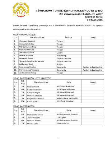 II ŚWIATOWY TURNIEJ KWALIFIKACYJNY DO IO W RIO styl klasyczny, zapasy kobiet, styl wolny Istambuł, Turcja 04-09.05.2016 Polski Związek Zapaśniczy powołuje na II ŚWIATOWY TURNIEJ KWALIFIKACYJNY do Igrzysk Olimpijskich w Rio de Janeiro: OSOBY TOWARZYSZĄCE: L. p. Nazwisko i imię 1. 2. 3. 4. 5. 6. 7. 8. 9. 10. 11. 12. Ołenczyn Krzysztof Stecyk Władysław Maksymiuk Andrzej Gicewicz Mariusz Jakubowski Adam Nowak Martyna Dopierała Aneta Skwarek-Paradowska Natalia Łebkowski Karol Fedorowicz Damian Pieronkiewicz Grzegorz Abdusalamov Yusup SKŁAD ZAWODNIKÓW – STYL KLASYCZNY: Kat. L.p. Nazwisko i imię wag 1. 59 Ersetic Dawid 2. 66 Kareciński Dawid 3. 75 Babayan Edgar 4. 85 Michalik Tadeusz 5. 98 Grzybicki Radosław 6. 130 Banak Łukasz SKŁAD ZAWODNICZEK: Kat. L.p. Nazwisko i imię wag 1. 48 Matkowska Iwona 2. 58 Zasina Roksana 3. 63 Michalik Monika 4. 75 Osocka Daria Funkcja Trener Trener Trener Trener Lekarz Psycholog Fizjoterapeutka Fizjoterapeutka Sędzia Kierownik Kierownik Trener Klub Uwagi Podróż indywidualna Podróż indywidualna Uwagi MKZ Unia Racibórz WKS Śląsk Wrocław KS Sobieski Poznań KS Sobieski Poznań AKS Piotrków Trybunalski WKS Śląsk Wrocław Klub WKS Grunwald Poznań ZTA Zgierz WKS Grunwald Poznań KS Wrestler24 1 Uwagi SKŁAD ZAWODNIKÓW – STYL WOLNY: Kat. L.p. Nazwisko i imię wag 1. 57 Bieńkowski Krzysztof 2. 74 Brzozowski Krystian Klub Uwagi AKS Białogard Orzeł Namysłów brak tolerancji wagowej W przypadku braku możliwości uczestnictwa w zawodach prosimy o tym niezwłocznie powiadomić biuro PZZ na e-mail: [email protected] lub tel. (22) 624 81 11, 624 01 69. Zawodnik zobowiązany jest posiadać aktualne badania lekarskie oraz paszport ważny minimum 6 miesięcy. Przysługuje zwrot kosztów podróży (PKP II kl. posp. lub PKS) na podstawie załączonego biletu (bez kosztów diety i dojazdów) przesłanego zgodnie z obowiązującymi przepisami do biura PZZ w Warszawie w terminie nieprzekraczającym 14 dni od dnia zakończenia akcji. SZCZEGÓŁY PRZELOTÓW: I. Łebkowski Karol, Jakubowski Adam, Skwarek-Paradowska Natalia Zbiórka na Lotnisku im. F. Chopina w dniu 04.05.2016 o godzinie 12:55 04.05.2016 TK 1766 Warszawa - Istambuł 14:55 – 18:35 09.05.2016 TK 1765 Istambuł - Warszawa 12:35 – 14:00 II. STYL KLASYCZNY Zbiórka na Lotnisku im. F. Chopina w dniu 04.05.2016 o godzinie 12:55 04.05.2016 LO 5133 Warszawa - Istambuł 14:55 – 18:35 07.05.2016 LO 136 Istambuł - Warszawa 17:30 – 19:00 III. ZAPASY KOBIET Zbiórka na Lotnisku im. F. Chopina w dniu 05.05.2016 o godzinie 10:55 05.05.2016 LO 135 Warszawa - Istambuł 12:55 – 16:35 08.05.2016 LO 136 Istambuł - Warszawa 17:30 – 19:00 2 IV. STYL WOLNY Zbiórka na Lotnisku im. F. Chopina w dniu 06.05.2016 o godzinie 10:55 06.05.2016 LO 135 Warszawa - Istambuł 12:55 – 16:35 09.05.2016 LH 1301 Istambuł – Frankfurt 17:45 – 19:55 09.05.2016 LH 1352 Frankfurt – Warszawa 20:45 – 22:20 http://www.stambul.msz.gov.pl/pl/informacje_konsularne/dodatkowa_mozliwosc_uzyskania_wi zy_do_turcji/ Posiadacze polskich paszportów zwykłych podlegają obowiązkowi wizowemu i mogą nabyć wizę turystyczną w następujący sposób: - na stronie www.evisa.gov.tr wielokrotną wizę elektroniczną (e-wizę) lub - na lotnisku po przylocie do Turcji wielokrotną wizę typu wklejka. Minimalna ważność paszportu do uzyskania wizy elektronicznej lub na lotnisku wynosi 180 dni od daty wjazdu do Turcji. 3