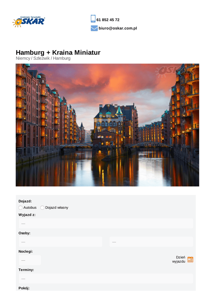 61 852 45 72 [email protected] Hamburg + Kraina Miniatur Niemcy / Szlezwik / Hamburg Dojazd: Autobus Dojazd własny Wyjazd z: Osoby: Noclegi: Dzień wyjazdu Terminy: Pokój: Wyżywienie: Najtańsza oferta Styczniowe Rabaty zniżka 20% cena katalogowa do 5 marca 2017: 227,00 zł do 5 marca 2017: 68,10 zł do 3 maja 2017: 0,00 zł do 3 maja 2017: 158,90 zł Suma: 227,00 zł Suma: 227,00 zł Opis oferty Miejscowość Kraina Miniatur Wunderland + Hamburg Kraina M iniatur Wunderland to największa miniaturowa wystawa na świecie. Wiosną 2013 roku Opinie otwarta ponownie po ponad 5 tysiącach godzin pracy na nową atrakcją - "największym, najmniejszym ogrodem świata", w którym zobaczyć można ponad 150 tysięcy modeli kwiatów. Cały park liczy ponad Rozkład jazdy 1500 m2 powierzchni, na której podziwiać możemy ponad tysiąc pociągów, samolotów, samochodów, statków. Znaczna część z prezentowanych budowli jest ruchoma - wystawa podzielona jest na różne sekcje: Niemcy (kilka działów), Austria, Szwajcaria, Ameryka, Skandynawia, Francja. Wizyta w parku, to niezapomniane wrażania i pełne emocji obserwacje części świata w mikro pigułce. Hamburg - "Perła Północy" to zielone miasto nad wodą nie bez powodu uchodzi za jedno z najpiękniejszych miast Niemiec. Nawet zwykle bardzo powściągliwym Hanzeatom trudno jest ukryć dumę ze "swojego" miasta. Swoją atmosferą i nadmorskim urokiem Hamburg oczaruje każdego, kto był tu choćby raz. Łaba, Alster, dzielnica Hafencity, Dzielnica Spichlerzy (Speicherstadt), Targ Rybny (Fischmarkt) lub ulica Reeperbahn - każdego dnia można tu odkryć, przeżyć i podziwiać coś nowego. TOUR GUIDE oprowadzanie z indywidualnym systemem nagłośnieniowym Mobilny zestaw audio: indywidulany zestaw słuchawkowy połączony bezprzewodowo z mikrofonem pilota/przewodnika. Zakwaterowanie Oferta nie obejmuje zakwaterowania. Karta Dużej Rodziny www.oskar.com.pl/zalaczniki/karta_duzej_rodziny Turystyczny Fundusz Gwarancyjny W związku z powołaniem do życia w dniu 26.11.2016 Turystycznego Funduszu Gwarancyjnego każdy klient Biura Podróży Oskar zobowiązany jest do zapłaty kwoty w wysokości 10zł/os. przy każdorazowej rezerwacji imprezy turystycznej (obowiązuje od dnia 26.11.2016). Kwota przeznaczona na Turystyczny Fundusz Gwarancyjny zostanie automatycznie doliczona do wartości rezerwacji (w momencie jej dokonania). Wyjątkiem są imprezy turystyczne odbywające się w krajach posiadających granicę z Rzeczpospolitą Polską. Składka nie jest przychodem biura. Warunki promocji FIRST MINUTE www.oskar.com.pl/zalaczniki/warunki_promocji Ubezpieczenie Warunki ubezpieczenia Bezpieczne Podróże Signal Iduna dokument do pobrania www.oskar.com.pl/zalaczniki/owu Warunki ubezpieczenia Kosztów Imprezy Turystycznej Signal Iduna dokument do pobrania www.oskar.com.pl/zalaczniki/owurg DWUpak i TRZYpak DWUpak z rabatem do 25% na osobe TRZYpak z rabatem do 50% na osobe Promocja obowiązuje przy zakupie 2 lub 3 spośród typów ofert: Karnawał w Wenecji, Wyspa Tropikalna, Legoland, Heide Park, Alzacja: Strasburg + Colmar, Festiwal Tulipanów i Amsterdam, Parada Kwiatów, Hamburg + Kraina M iniatur, Kopenhaga + Ogrody Tivoli, Salzburg i Hallstatt, Wodospad Rheinfall i Wyspa M ainau. Rabat naliczany jest od ceny podstawowej i dotyczy najtańszej spośród wybranych ofert. Istnieje możliwość dowolnej kombinacji rezerwacji wyjazdów przy zalożeniu, że dane osobowe uczestników nie ulegają zmianie. Udogodnienia Klimatyzacja Regulowane fotele Tacki Nowoczesna flota Zawodowy kierowca Pasy bezpieczeństwa Toaleta w autokarze Podnóżki City breaks Dla rodzin z dziećmi Wi-Fi Bez paszportu Tour guide Program ramowy Dzień 1 Wyjazd zgodnie z rozkładem jazdy autokarów. Przejazd przez Niemcy. Przyjazd do Hamburga około godz. 9:00. Zwiedzanie rozpoczniemy od głównego punktu programu - wejście do Krainy M iniatur Wunderland (przewidywany czas pobytu 4-6 godzin; pilot informuje o godzinie zbiórki). Następnie po zakończeniu wizyty w parku Wunderland zwiedzanie miasta Hamburg: Dzielnica Spichlerzy (Speicherstadt), Targ Rybny (Fischmarkt) ulica Reeperbahn, Łaba, Alster, dzielnica Hafencity. W czasie zwiedzania czas wolny na zakupy i posiłek. Na zakończenie wieczorny przejazd autokarem po mieście. Wyjazd w drogę powrotną do Polski w godzinach wieczornych. Dzień 2 Przyjazd w zależności od miasta godzinach nocnych/porannych zgodnie z rozkładem jazdy autokarów. Cena obejmuje przejazd autokarem klasy LUX (klimatyczcja, cafe-bar, DVD,WC) opiekę pilota w czasie podróży zwiedzanie wg programu ubezpieczenie KL, NNW, bagaż (utrata do 500 zł) Cena nie obejmuje Dopłaty wymagane na miejscu koszty programowe: 25 €/os (bilet wstępu do Krainy Miniatur Wunderland, opłatę przewodnicką oraz opłaty loalne) - płatne u pilota w autokarze; opłata nie podlega rozliczneiu Dopłaty opcjonalne ubezpieczenie od chorób przewlekłych i nowotworowych: 20 zł/os ubezpieczenie od kosztów rezygnacji: 3,5% wartości rezerwacji Informacje dodatkowe program jest programem ramowym - kolejność zwiedzanie może ulec zmianie dokumenty: paszport lub dowód osobisty Chcesz wiedzieć szybciej? Polub nas na facebooku OSKAR Sp. z o.o. pl.Wolności 2/4c, 61-738 Poznań Potrzebujesz pomocy? Zadzwoń lub napisz: 61 852 45 72 [email protected] Zadzwoń Projekt i wdrożenie: Simply User
