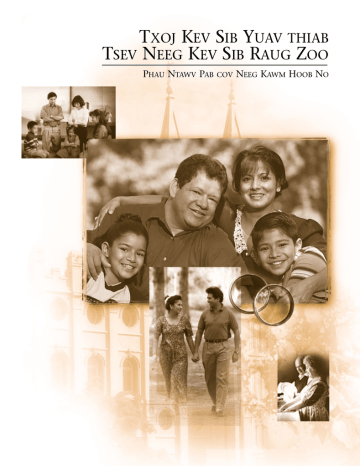 TXOJ KEV SIB YUAV THIAB TSEV NEEG KEV SIB RAUG ZOO PHAU NTAWV PAB COV NEEG KAWM HOOB NO TXOJ KEV SIB YUAV THIAB TSEV NEEG KEV SIB RAUG ZOO PHAU NTAWV PAB COV NEEG KAWM HOOB NO Luam tawm los ntawm Yexus Khetos lub Koom Txoos ntawm Tsoom Haiv Neeg Ntseeg hauv Hnub Nyoog Kawg Salt Lake City, Utah Cov Lus thiab cov Tswv Yim Peb yeej xav hnov nej cov lus thiab cov tswv yim txog phau kawm no. Thov xa mus rau: Curriculum Planning 50 East North Temple Street, Floor 24 Salt Lake City, UT 84150-3200 USA Chaw E-mail: [email protected] Thov sau koj lub npe, chaw nyob, pawg ntseeg, thiab ceg txheem ntseeg. Yuav tsum qhia tias koj hais txog phau kawm twg. Ces cia li hais qhia tawm koj cov lus thiab cov tswv yim uas qhia tias phau kawm no zoo li cas thiab koj xav tias yuav tau muab kho li cas. © 2005 los ntawm Intellectual Reserve, Inc. Ceev txhua txoj cai Luam tawm hauv Teb Chaws Amelikas Pub txhais ua lus Askiv: 8/97 Pub txhais ua lus Hmoob: 8/97 Kev txhais Marriage and Family Relations: Participant’s Study Guide Hmong TEJ YAM UAS NYOB HAUV “Tsev Neeg: Ib Zaj Lus Tshaj Tawm rau lub Ntiaj Teb” . . . . . . . . . . . . . . . . . . . . . . . . . . . . . . . . . . . . . . . . . iv Lus Cev . . . . . . . . . . . . . . . . . . . . . . . . . . . . . . . . . . . . . . . . . . . . . . . . . . . . . . . . . . . . . . . . . . . . . . . . . . . . . v Kev Tshab Hoob Kawm rau txoj Kev Sib Yuav thiab Tsev Neeg Kev Sib Raug Zoo . . . . . . . . . . . . . . . . . . . . vii KEM A: NTXIV DAG NTXIV ZOG RAU IB KHUB NIAM TXIV 1. “Tsev Neeg Yog lub Hauv Paus rau tus Tsim Txoj Hau Kev” . . . . . . . . . . . . . . . . . . . . . . . . . . . . . . . . . . . 3 2. Ua Kom Niam Txiv Sib Koom Siab . . . . . . . . . . . . . . . . . . . . . . . . . . . . . . . . . . . . . . . . . . . . . . . . . . . . . . 8 3. Tu txoj Kev Hlub thiab Kev Ua Phooj Ua Ywg ntawm Ib Khub Niam Txiv . . . . . . . . . . . . . . . . . . . . . . . 13 4. Kev Kho tej Teeb Meem ntawm Ib Khub Niam Txiv . . . . . . . . . . . . . . . . . . . . . . . . . . . . . . . . . . . . . . . . 17 5. Kev Kho tej Teeb Meem los ntawm Kev Sib Txuas Lus Zoo . . . . . . . . . . . . . . . . . . . . . . . . . . . . . . . . . . 20 6. Ntxiv Dag Ntxiv Zog Rau Ib Khub Niam Txiv los ntawm Kev Ntseeg thiab Kev Thov Vajtswv . . . . . . . . 24 7. Lub Hwj Chim ntawm Kev Zam Txim Uas Kho Tau Tib Neeg . . . . . . . . . . . . . . . . . . . . . . . . . . . . . . . . 29 8. Saib Xyuas Tsev Neeg tej Nyiaj Txiag . . . . . . . . . . . . . . . . . . . . . . . . . . . . . . . . . . . . . . . . . . . . . . . . . . . 32 KEM B: NIAM TXIV TXOJ KEV LAV RIS YUAV TAU NTXIV DAG NTXIV ZOG RAU TSEV NEEG 9. “Me Nyuam Yog tej Paj Tshab uas tus Tswv Pub Rau Neeg” . . . . . . . . . . . . . . . . . . . . . . . . . . . . . . . . . . 39 10. Niam thiab Txiv txoj Ntiag Tug Hauj Lwm Dawb Ceev (Qhov 1: Leej Txiv txoj Hauj Lwm) . . . . . . . . . 44 11. Niam thiab Txiv txoj Ntiag Tug Hauj Lwm Dawb Ceev (Qhov 2: Leej Niam txoj Hauj Lwm) . . . . . . . . 48 12. Qhia cov Me Nyuam los ntawm Yus tus Yam Ntxwv thiab Kev Qhuab Qhia . . . . . . . . . . . . . . . . . . . . . 54 13. Qhia txoj Moo Zoo tej Ntsiab Cai rau cov Me Nyuam (Qhov 1) . . . . . . . . . . . . . . . . . . . . . . . . . . . . . . 61 14. Qhia txoj Moo Zoo tej Ntsiab Cai rau cov Me Nyuam (Qhov 2) . . . . . . . . . . . . . . . . . . . . . . . . . . . . . . 66 15. Cob Qhia cov Me Nyuam Thaum Lawv Txiav Txim Siab . . . . . . . . . . . . . . . . . . . . . . . . . . . . . . . . . . . . 73 16. Tsev Neeg Kev Thov Vajtswv, Tsev Neeg Kev Kawm Vaj Lug Kub, thiab Tsev Neeg Hmo Ua Ke . . . . . . . 77 iii TSEV NEEG THAWJ PAWG THAWJ TSWJ HWM THIAB PAWG KAUM OB TUG THWJ TIM NTAWM YEXUS KHETOS LUB KOOM TXOOS NTAWM TSOOM HAIV NEEG NTSEEG HAUV HNUB NYOOG KAWG P EB, UAS YOG THAWJ PAWG THAWJ TSWJ HWM thiab Pawg Kaum Ob tug Thwj Tim ntawm Yexus Khetos lub Koom Txoos ntawm Tsoom Haiv Neeg Ntseeg hauv Hnub Nyoog Kawg, tshaj tawm tiag tiag hais tias txoj kev sib yuav ntawm ib tug txiv neej thiab ib tug poj niam yog raug tsa los ntawm Vajtswv thiab tias tsev neeg yog lub ntsiab ntawm tus Tsim lub tswv yim rau nws cov me nyuam txoj hmoov nyob mus ib txhis li. TXHUA TXHIA TUS TIB NEEG—txiv neej thiab poj niam—raug tsim muaj yam ntxwv zoo li Vajtswv. Txhua txhia tus yog nkawm niam txiv saum ntuj ceeb tsheej ib tug tub ntsuj plig los yog ib tug ntxhais ntsuj plig uas nkawd hlub thiab xws li txhua tus yog li ntawd, txhua txhia tus muaj ib tug xeeb ceem thiab txoj hmoov los saum ntuj los. Txoj kev ua ib tug poj niam los sis ib tug txiv neej yog ib yam tseem ceeb ntawm ib tug neeg tus xeeb ceem thiab lub ntsiab, txawm hais tias nyob lub qub neej los yog, lub neej no los yog, lub neej nyob mus ib txhis li los yog. NYOB RAU LUB QUB NEEJ, tej tub ntsuj plig thiab tej ntxhais ntsuj plig tau paub thiab teev tiam Vajtswv ua lawv Leej Txiv uas Nyob Mus Ib Txhis Li thiab lawv tau txais yuav nws lub tswv yim uas npaj tseg hais tias nws cov me nyuam yuav tau ib lub cev nqaij daim tawv thiab yuav tau ib lub sij hawm saum ntiaj teb no kom xyaum tau ua neeg zoo tag nrho thiab thaum kawg ncav tau lawv txoj hmoov los saum ntuj los ua cov uas txais txoj sia nyob mus ib txhis ua lawv tug. Txoj kev zoo siab los saum ntuj los ua rau kev ua niam ua txiv, ua tub ua ntxhais, ua kwv ua tij, ua neej ua tsa nyob mus li dhau lub qhov ntxa. Tej kab ke tseem ceeb dawb ceev thiab tej kev cog lus uas muaj hauv tej tuam tsev dawb huv ua rau tib neeg rov qab mus nyob tau ntawm Vajtswv lub xub ntiag thiab ua rau tsev neeg nyob tau ua ke mus ib txhis li. THAWJ LO LUS TXIB uas Vajtswv txib kom Adas thiab E-vas ua hais ntsig txog nkawd txoj kev ua niam ua txiv. Peb tshaj tawm hais tias Vajtswv lo lus txib uas hais kom nws cov me nyuam huaj vam mus puv tas lub ntiaj teb tseem muaj zog lawm. Tsis tas li ntawd xwb, peb tshaj tawm ntxiv hais tias Vajtswv tau txib kom tej hwj chim tseem ceeb dawb ceev ntawm txoj kev muaj tub muaj ki yuav tsum siv tsuas yog ntawm ib tug txiv neej thiab ib tug poj niam xwb, uas tau sib yuav raw