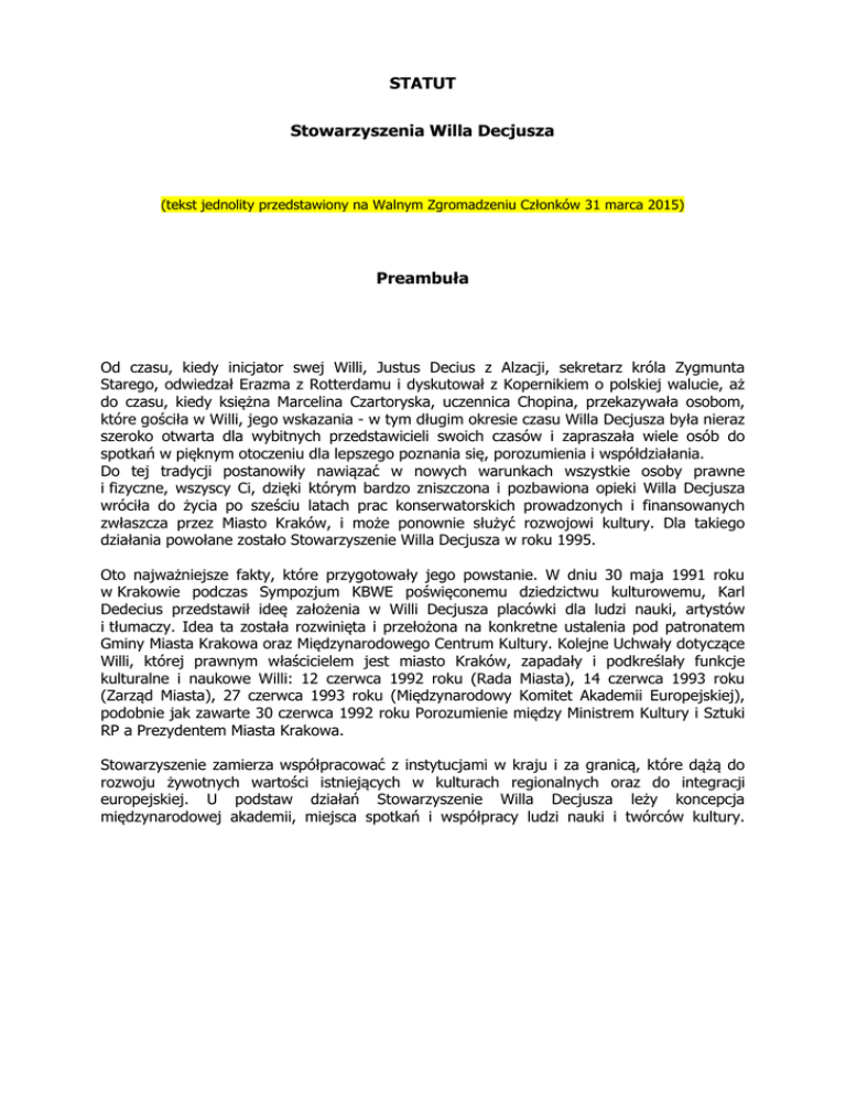 STATUT Stowarzyszenia Willa Decjusza (tekst jednolity przedstawiony na Walnym Zgromadzeniu Członków 31 marca 2015) Preambuła Od czasu, kiedy inicjator swej Willi, Justus Decius z Alzacji, sekretarz króla Zygmunta Starego, odwiedzał Erazma z Rotterdamu i dyskutował z Kopernikiem o polskiej walucie, aż do czasu, kiedy księżna Marcelina Czartoryska, uczennica Chopina, przekazywała osobom, które gościła w Willi, jego wskazania - w tym długim okresie czasu Willa Decjusza była nieraz szeroko otwarta dla wybitnych przedstawicieli swoich czasów i zapraszała wiele osób do spotkań w pięknym otoczeniu dla lepszego poznania się, porozumienia i współdziałania. Do tej tradycji postanowiły nawiązać w nowych warunkach wszystkie osoby prawne i fizyczne, wszyscy Ci, dzięki którym bardzo zniszczona i pozbawiona opieki Willa Decjusza wróciła do życia po sześciu latach prac konserwatorskich prowadzonych i finansowanych zwłaszcza przez Miasto Kraków, i może ponownie służyć rozwojowi kultury. Dla takiego działania powołane zostało Stowarzyszenie Willa Decjusza w roku 1995. Oto najważniejsze fakty, które przygotowały jego powstanie. W dniu 30 maja 1991 roku w Krakowie podczas Sympozjum KBWE poświęconemu dziedzictwu kulturowemu, Karl Dedecius przedstawił ideę założenia w Willi Decjusza placówki dla ludzi nauki, artystów i tłumaczy. Idea ta została rozwinięta i przełożona na konkretne ustalenia pod patronatem Gminy Miasta Krakowa oraz Międzynarodowego Centrum Kultury. Kolejne Uchwały dotyczące Willi, której prawnym właścicielem jest miasto Kraków, zapadały i podkreślały funkcje kulturalne i naukowe Willi: 12 czerwca 1992 roku (Rada Miasta), 14 czerwca 1993 roku (Zarząd Miasta), 27 czerwca 1993 roku (Międzynarodowy Komitet Akademii Europejskiej), podobnie jak zawarte 30 czerwca 1992 roku Porozumienie między Ministrem Kultury i Sztuki RP a Prezydentem Miasta Krakowa. Stowarzyszenie zamierza współpracować z instytucjami w kraju i za granicą, które dążą do rozwoju żywotnych wartości istniejących w kulturach regionalnych oraz do integracji europejskiej. U podstaw działań Stowarzyszenie Willa Decjusza leży koncepcja międzynarodowej akademii, miejsca spotkań i współpracy ludzi nauki i twórców kultury. Rozdział I Postanowienia ogólne §1 Stowarzyszenie Willa Decjusza, zwane dalej „Stowarzyszeniem” jest dobrowolnym, samorządnym, trwałym zrzeszeniem o celach niezarobkowych, działającym na podstawie przepisów ustawy z dnia 7 kwietnia 1989 roku Prawo o stowarzyszeniach (Dz. U. z 2001 r. Nr 79, poz. 855) oraz na podstawie niniejszego statutu. §2 Nazwa Stowarzyszenia brzmi: „Stowarzyszenie Willa Decjusza”. §3 1. Terenem działania Stowarzyszenia jest obszar Rzeczpospolitej Polskiej. 2. Dla właściwej realizacji statutowych celów Stowarzyszenie może prowadzić działalność poza granicami Rzeczpospolitej Polskiej zgodnie z obowiązującym porządkiem prawnym. §4 Siedzibą Stowarzyszenia jest Kraków. §5 Stowarzyszenie posiada osobowość prawną i działa przez wymienione w niniejszym statucie organy. Czas trwania Stowarzyszenia jest nieoznaczony. §6 §7 Stowarzyszenie opiera swoją działalność na pracy społecznej członków. Do prowadzenia swych spraw może zatrudniać pracowników. §8 Świadczenia odpowiadające świadczeniu pracy, w zakresie i na zasadach określonych w odrębnych przepisach, mogą wykonywać na rzecz Stowarzyszenia wolontariusze. §9 Stowarzyszenie może być członkiem krajowych i międzynarodowych organizacji o podobnym celu działania. § 10 Znakiem Stowarzyszenia jest prawnie chroniony znak, którego wzór stanowi załącznik do Statutu. § 11 Stowarzyszenie używa pieczęci podłużnej z napisem „Stowarzyszenie Willa Decjusza”. Rozdział II Cele i sposoby działania § 12 Cele Stowarzyszenia: a) rozwijanie i propagowanie twórczości artystycznej i literackiej, b) międzynarodowa współpraca kulturalna i intelektualna, c) podtrzymywanie tradycji oraz rozwój świadomości narodowej, obywatelskiej i kulturowej, d) tworzenie i prowadzenie studiów zaawansowanych, programów stypendialnych i szkół letnich, e) prowadzenie działalności wspomagającej rozwój i integrację wspólnot i społeczności lokalnych, w tym grup zagrożonych wykluczeniem społecznym, f) prowadzenie edukacji kulturalnej i ekologicznej wspierającej zrównoważony rozwój, g) wspieranie i stymulowanie prac naukowo-badawczych, 2 h) prowadzenie działalności na rzecz integracji europejskiej oraz rozwijania kontaktów i współpracy między społeczeństwami, i) ochrona i udostępnianie zabytkowego zespołu pałacowo-parkowego Willi Decjusza, j) utrzymywanie, ochrona zgromadzonych w Willi Decjusza dóbr kultury polskiej i tradycji oraz ich pomnażanie i udostępnianie, k) wspieranie rozwoju krajoznawstwa i turystyki kulturowej w obszarze dziedzictwa materialnego i krajobrazowego, l) prowadzenie działalności na rzecz upowszechniania i ochrony wolności i praw człowieka oraz swobód obywatelskich, a także innych działań wspomagających rozwój demokracji, m) działalność na rzecz mniejszości narodowych, n) promocja i organizacja wolontariatu, o) podejmowanie innych inicjatyw kulturalnych i społecznych. § 13 Stowarzyszenie realizuje cele określone w § 12 niniejszego statutu poprzez organizowanie: a) konferencji i seminariów, b) koncertów i spektakli, c) wystaw, d) warsztatów, e) zajęć edukacyjnych, f) pobytów studyjnych i stypendialnych, g) wycieczek turystycznych i krajoznawczych, h) wydawanie publikacji związanych z działalnością statutową. §14 1. Prowadzona przez Stowarzyszenie działalność ma charakter kulturalny. Dla lepszego realizowania celów statutowych może być ona prowadzona w różnych dziedzinach, jednak wyłącznie w zakresie określonym niniejszym statutem. Działalność określona statutem prowadzona jest przez Stowarzyszenie na rzecz ogółu społeczności i jest wy
