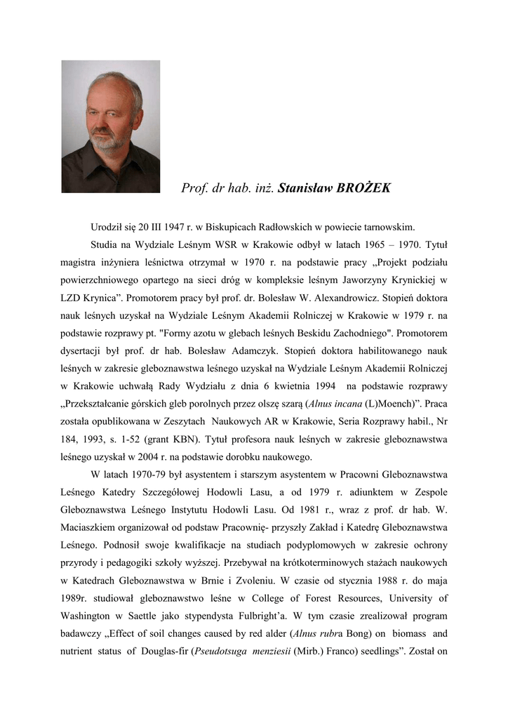 Prof. dr hab. inż. Stanisław BROŻEK Urodził się 20 III 1947 r. w Biskupicach Radłowskich w powiecie tarnowskim. Studia na Wydziale Leśnym WSR w Krakowie odbył w latach 1965 – 1970. Tytuł magistra inżyniera leśnictwa otrzymał w 1970 r. na podstawie pracy „Projekt podziału powierzchniowego opartego na sieci dróg w kompleksie leśnym Jaworzyny Krynickiej w LZD Krynica”. Promotorem pracy był prof. dr. Bolesław W. Alexandrowicz. Stopień doktora nauk leśnych uzyskał na Wydziale Leśnym Akademii Rolniczej w Krakowie w 1979 r. na podstawie rozprawy pt. "Formy azotu w glebach leśnych Beskidu Zachodniego". Promotorem dysertacji był prof. dr hab. Bolesław Adamczyk. Stopień doktora habilitowanego nauk leśnych w zakresie gleboznawstwa leśnego uzyskał na Wydziale Leśnym Akademii Rolniczej w Krakowie uchwałą Rady Wydziału z dnia 6 kwietnia 1994 na podstawie rozprawy „Przekształcanie górskich gleb porolnych przez olszę szarą (Alnus incana (L)Moench)”. Praca została opublikowana w Zeszytach Naukowych AR w Krakowie, Seria Rozprawy habil., Nr 184, 1993, s. 1-52 (grant KBN). Tytuł profesora nauk leśnych w zakresie gleboznawstwa leśnego uzyskał w 2004 r. na podstawie dorobku naukowego. W latach 1970-79 był asystentem i starszym asystentem w Pracowni Gleboznawstwa Leśnego Katedry Szczegółowej Hodowli Lasu, a od 1979 r. adiunktem w Zespole Gleboznawstwa Leśnego Instytutu Hodowli Lasu. Od 1981 r., wraz z prof. dr hab. W. Maciaszkiem organizował od podstaw Pracownię- przyszły Zakład i Katedrę Gleboznawstwa Leśnego. Podnosił swoje kwalifikacje na studiach podyplomowych w zakresie ochrony przyrody i pedagogiki szkoły wyższej. Przebywał na krótkoterminowych stażach naukowych w Katedrach Gleboznawstwa w Brnie i Zvoleniu. W czasie od stycznia 1988 r. do maja 1989r. studiował gleboznawstwo leśne w College of Forest Resources, University of Washington w Saettle jako stypendysta Fulbright’a. W tym czasie zrealizował program badawczy „Effect of soil changes caused by red alder (Alnus rubra Bong) on biomass and nutrient status of Douglas-fir (Pseudotsuga menziesii (Mirb.) Franco) seedlings”. Został on opublikowany w Canadian Journal of Forest Research 20, 9, 1990, p.1320-1325. Członek wielu komisji wydziałowych. W latach 2001-2010 był sekretarzem Kolegium Redakcyjnego serii Forestry, Electronic Journal of Polish Agricultural Universities. Od 2010 r. jest członkiem Komitetu Redakcyjnego Roczników Gleboznawczych. Od 2003 r. kieruje Katedrą Gleboznawstwa Leśnego. Jest autorem lub współautorem ponad 100 opracowań naukowych, z których połowa, to oryginalne prace twórcze. Sporządził 14 ekspertyz naukowych oraz napisał 15 artykułów popularnych. Jest autorem i współautorem dwóch podręczników akademickich. Do najważniejszych opublikowanych prac należy zaliczyć: La transformation de los suelos por el aliso gris en el proceso de la reconstruccion del ecosistema forestal. XI International Symposium on Environmental Biogeochemistry. Salamanca, Espania, Sept. 27 - Oct. 1. 1993, p. 73-82. Impact of forest litter of Alnus glutinosa (L.) Gaertn., Alnus incana (L.) Moench, Alnus viridis (Chaix) Lam. et DC, Abies alba Mill., and Fagus sylvatica L. on chosen soil properties. Electronic Journal of Polish Agricultural Universities, Series Forestry, Volum 5, Issue 1 (grant KBN), Indeks trofizmu gleb leśnych. Acta Agraria et Silvestria, vol. XXXIX, 17-33. Klasyfikacja Gleb Leśnych Polski CILP 2000, s. 1-124 (podręcznik akademicki). Atlas gleb leśnych Polski. PWRiL, s.1-466. Klasyfikacja siedlisk leśnych uwagi w sprawie miejsca gleb w zasadach diagnozowania. Sylwan. CLI, 2, 19-25, 2007, Kierunki doskonalenia metod rozpoznawania siedlisk leśnych. Sylwan. CLI, 2, 26-34, 2007, Liczbowa wycena "jakości" gleb - narzędzie w diagnozowaniu siedlisk leśnych. Sylwan. CLI, 2, 35-42, 2007, Gleby borów sosnowych świeżych Leucobryo-Pinetum i Peucedano-Pinetum na obszarze Niżu Polski. Rocz. Glebozn. T. LVIII, ¾, 43-51, Liczbowy indeks troficznych odmian podtypów gleb bielicowych i rdzawych. Rocz. Glebozn. T. LIX, 1, 7-17, Reserve of organic carbon in forest soils of lowlands in Poland, Polish J. of Environ. Stud. Vol. 17, No.3A, 632-637. Od 1981 r. prowadzi wykłady z gleboznawstwa na studiach stacjonarnych, niestacjonarnych i podyplomowych dla leśników. Również wykłady z „Gleboznawstwa” prowadzi dla architektów krajobrazu, natomiast wykłady z podstaw leśnictwa dla rolników. Od 2010 r. wdraża nowy przedmiot „Siedliskoznawstwo” dla leśników i „Fizjografię” dla architektów krajobrazu. Prowadzi liczne wykłady i szkolenia dla służby leśnej w Polsce południowej. Wykonał 14 ekspertyz wdrożonych do praktyki leśnej. Jest autorem wystaw dydaktycznych dotyczących tematyki gleboznawczej. Były one prezentowane w ośrodkach krajowych i dwóch zagranicznych: University of Washington w Seattle i Technicka Universita w Zvoleniu. Pod jego kierunkiem wykonano 35 prac magisterskich. Był promotorem zakończonego przewodu doktorskiego oraz jest opiekunem dwóch przygotowywanych dysertacji. Był także recenzentem trzech prac doktorskich, dwóch habilitacyjnych i w dwóch postępowaniach o tytuł naukowy profesora. Jest członkiem Polskiego Towarzystwa Gleboznawczego i Polskiego Towarzystwa Leśnego. Za osiągnięcia w pracy naukowo-badawczej, dydaktycznej i organizacyjnej został 9krotnie wyróżniony nagrodą Rektora AR w Krakowie,. Otrzymał także w 1998 r. Srebrny Krzyż Zasługi, w 1980 r. Srebrną i w 1984 r. Złotą Odznakę za pracę społeczną dla miasta Krakowa. W 2004 r. otrzymał nagrodę zespołową Ministerstwa Edukacji Nauki i Szkolnictwa Wyższego za opracowanie i wydanie „Atlasu gleb leśnych Polski". W 2005 r. otrzymał Nagrodę Naukową im. M. Oczapowskiego Wydziału Nauk Rolniczych, Leśnych i Weterynaryjnych PAN. Przez cały okres pracy na Uczelni pracuje dla „praktyki leśnej” w ramach badań zamawiany