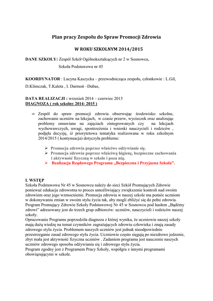 Plan pracy Zespołu do Spraw Promocji Zdrowia W ROKU SZKOLNYM 2014/2015 DANE SZKOŁY: Zespól Szkół Ogólnokształcących nr 2 w Sosnowcu, Szkoła Podstawowa nr 45 KOORDYNATOR : Lucyna Kaszycka – przewodnicząca zespołu, członkowie : L.Gil, D.Klimczak, T.Kaleta , I. Darmoń –Dubas, DATA REALIZACJI : wrzesień 2014 – czerwiec 2015 DIAGNOZA ( rok szkolny 2014- 2015 ) • Zespół do spraw promocji zdrowia obserwując środowisko szkolne, zachowanie uczniów na lekcjach, w czasie przerw, wycieczek oraz analizując problemy omawiane na zajęciach zintegrowanych czy na lekcjach wychowawczych, uwagi, spostrzeżenia i wnioski nauczycieli i rodziców , podjęła decyzję, iż priorytetowa tematyka realizowana w roku szkolnym 2014/2015 ( kontynuacja) dotyczyła problemu: Promocja zdrowia poprzez właściwe odżywianie się. Promocja zdrowia poprzez właściwą higienę, bezpieczne zachowania i aktywność fizyczną w szkole i poza nią. Realizacja Rządowego Programu „Bezpieczna i Przyjazna Szkoła”. I. WSTĘP Szkoła Podstawowa Nr 45 w Sosnowcu należy do sieci Szkół Promujących Zdrowie ponieważ edukacja zdrowotna to proces umożliwiający zwiększenie kontroli nad swoim zdrowiem oraz jego wzmocnienie. Promocja zdrowia w naszej szkole ma pomóc uczniom w dokonywaniu zmian w swoim stylu życia tak, aby mogli zbliżyć się do pełni zdrowia. Program Promujący Zdrowie Szkoły Podstawowej Nr 45 w Sosnowcu pod hasłem „Bądźmy zdrowi” adresowany jest do trzech grup odbiorców: uczniów, nauczycieli i rodziców naszej szkoły. Opracowanie Programu poprzedziła diagnoza z której wynika, że uczniowie naszej szkoły mają dużą wiedzę na temat czynników zagrażających zdrowiu człowieka i znają zasady zdrowego stylu życia. Problemem naszych uczniów jest jednak nieodpowiednie przestrzeganie zasad zdrowego stylu życia. Uczniowie często sięgają po niezdrowe jedzenie, zbyt mała jest aktywność fizyczna uczniów . Zadaniem programu jest nauczenie naszych uczniów zdrowego sposobu odżywiania się i zdrowego stylu życia. Program zgodny jest z Programem Pracy Szkoły, współgra z innymi programami obowiązującymi w szkole. Cele programu promocji zdrowia: 1.Kształtowanie zachowań (stylu życia) i warunków sprzyjających zdrowiu, jego poprawie i ochronie. 2.Uświadomienie odpowiedzialności za zdrowie własne i innych. 3.Uświadomienie korzyści z troski o własne ciało oraz aktualnych zagrożeń dla zdrowi. 4..Kształtowanie postaw prorodzinnych, prozdrowotnych i prospołecznych. 5.Propagowanie różnych dyscyplin sportowych wśród młodzieży szkolnej jako formy zmniejszającej zachowaniom agresywnym. 6.Wdrażanie do aktywnego udziału całej społeczności do kultywowania właściwych zachowań prozdrowotnych. 7. Wdrażanie do większej aktywności fizycznej. 8.Propagowanie zasad zdrowego odżywiania, przestrzeganie zasad dbałości o higienę osobistą. Rozwiązania dla usunięcia problemu- Promocja zdrowia poprzez właściwe odżywianie się. • Zwiększyć poziom wiedzy uczniów oraz ich rodzin w zakresie zasad prawidłowego żywienia i zbilansowanej diety • Podnieść stopień świadomości uczniów oraz osób dorosłych w zakresie regularnego spożywania posiłków, wyrabiania nawyków smakowych oraz dbania , aby wartość odżywcza jedzenia współgrała z jego estetyką, atrakcyjnym smakiem oraz zapachem • Przyzwyczajać dzieci do właściwych zachowań żywieniowych, higienicznych, a także w zakresie estetyki spożywania posiłków • Promować aktywność fizyczną oraz życie bez używek i uzależnień Rozwiązania dla usunięcia problemu - Promocja zdrowia poprzez właściwą higienę, bezpieczne zachowania i aktywność fizyczną w szkole i poza nią. • Zwiększyć stopień zadowolenia i satysfakcji uczniów z lekcji • Podwyższenie poziomu higieny pracy umysłowej w szkole i w domu • Poprawa warunków do zajęć ruchowych • Zachęcenie uczniów do korzystania z oferty zajęć lekcyjnych i pozalekcyjnych związanych z aktywnością ruchową • Rozpropagowanie i poszerzenie oferty zajęć rekreacyjnych, ruchowych dla dzieci w rejonie szkoły • Podnieść świadomość uczniów i osób dorosłych nt. możliwości samodzielnego wpływania na poprawę własnej sprawności fizycznej oraz korzyści , jakie ona przynosi. • Uzasadnienie teoretyczne Programu „Bezpieczna i przyjazna szkoła” Szkoła może wzmacniać zdrowie uczniów oraz ujawniać już istniejące problemy dzieci ze zdrowiem fizycznym i psychicznym. Poczucie zagrożenia fizycznego i psychicznego oraz porażki edukacyjne i towarzyskie dziecka łączą się często z problemami zdrowotnymi i społecznymi, takimi jak sięganie po alkohol i narkotyki, przedwczesne kontakty seksualne i zaburzenia zachowania, w tym działania przestępcze. Celem prowadzonych w szkole działań z zakresu promocji zdrowia psychicznego i profilaktyki jest redukcja czynników ryzyka i wzmacnianie czynników chroniących. Czynniki ryzyka związane ze szkołą: 1) przemoc rówieśnicza; 2) odrzucenie przez rówieśników; 3) słaba więź ze szkołą; 4) niedostateczne kierowanie własnym zachowaniem (brak kontroli); 5) destrukcyjna grupa rówieśnicza; 6) niepowodzenia szkolne. Wybrane czynniki chroniące: Oprócz czynników ryzyka stworzono również listę głównych czynników chroniących, które potencjalnie wpływają na prawidłowy rozwój w obszarze zdrowia psychicznego, szczególnie u dzieci, związanych ze szkołą. Należą do nich: 1) poczucie przynależności; 2) pozytywny klimat szkoły; 3) prospołecznie nastawiona grupa rówieśnicza; 4) wymaganie od uczniów odpowiedzialności i udzielania sobie wzajemnej pomocy; 5) okazje do przeżycia sukcesu i rozpoznawania własnych osiągnięć; 6) zdecydowany brak akceptacji przez szkołę dla przemocy Treści nauczania w szkole promującej zdrowie: • higiena ciała, odzieży, obuwia, miejsca pracy i wypoczynku, • bezpieczeństwo na drodz